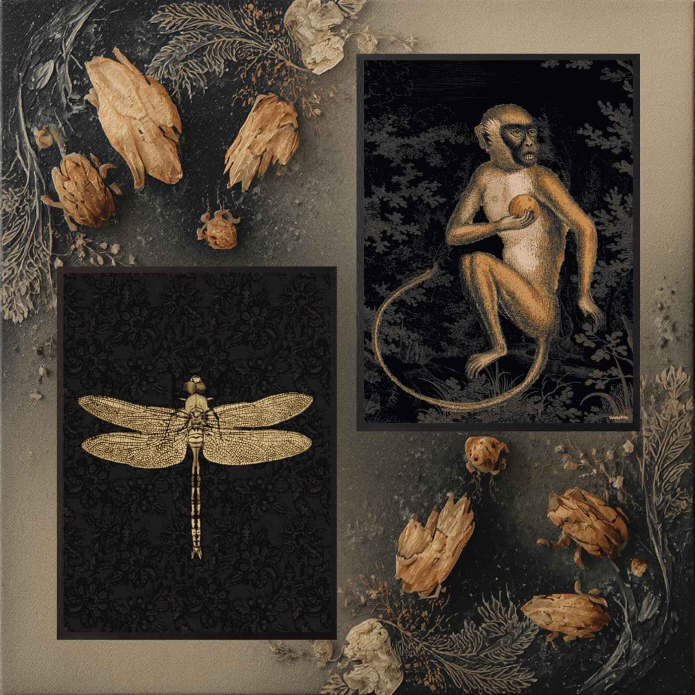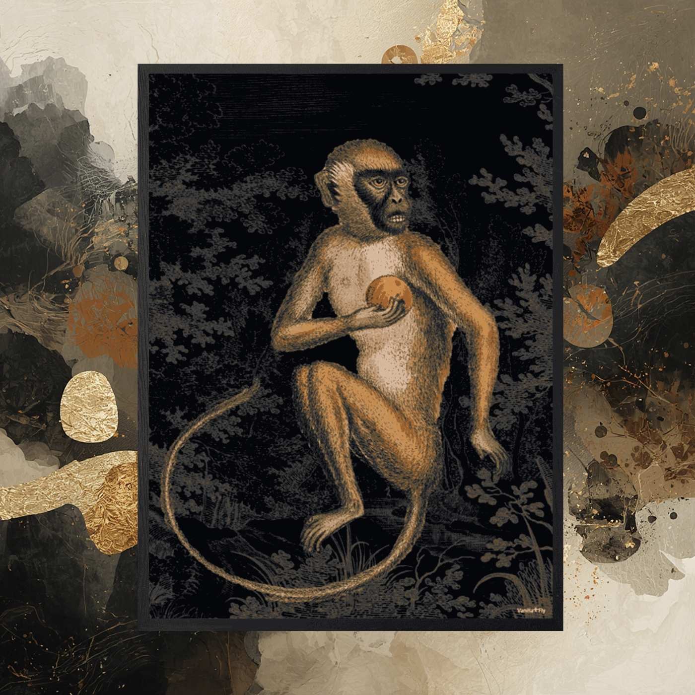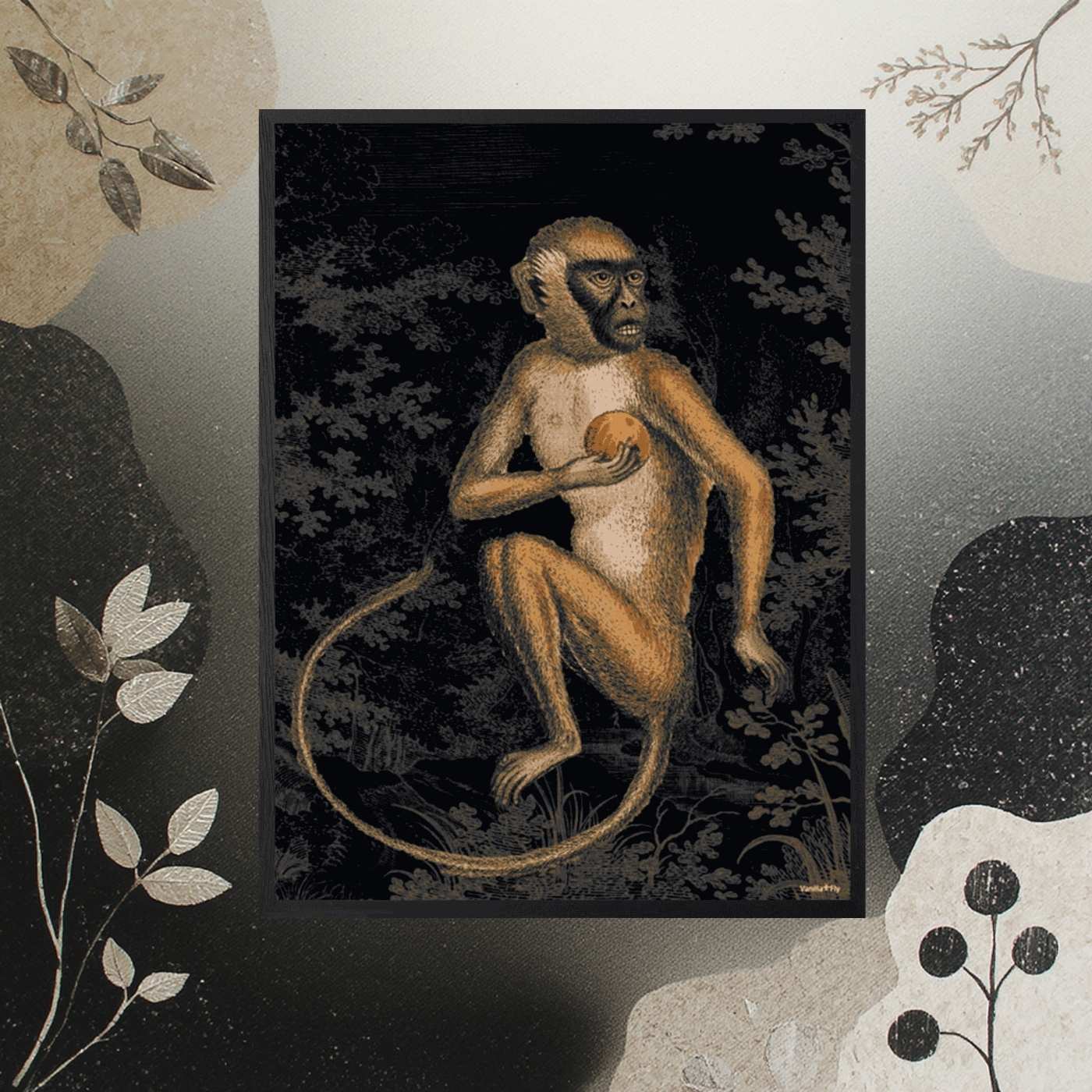 Poster 20×25 con stampa artistica “Black Monkey”. Design dark e giocoso allo stesso tempo. Incorniciato in legno nero e protetto da vetro. Decorazione perfetta per pareti moderne e collezioni artistiche.
