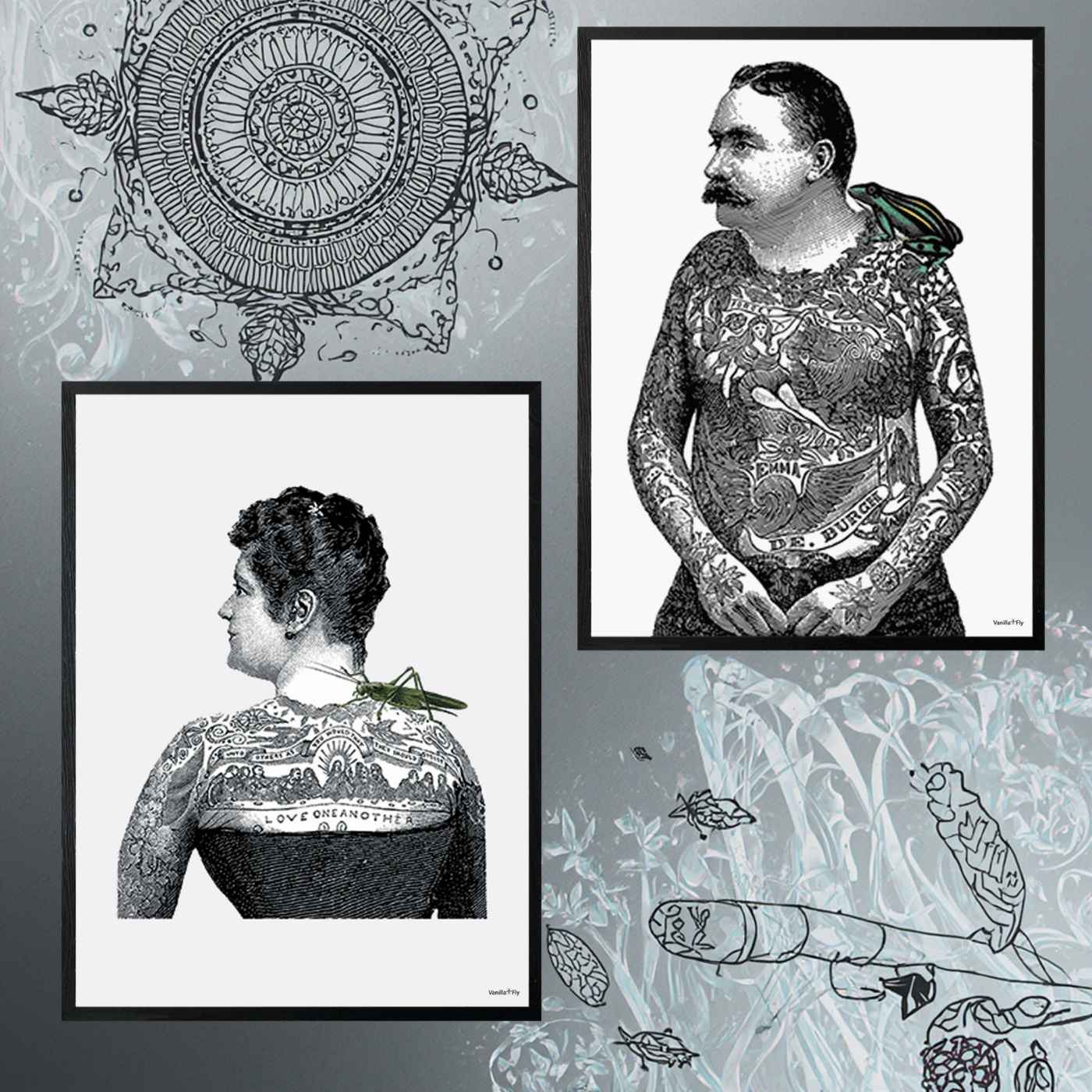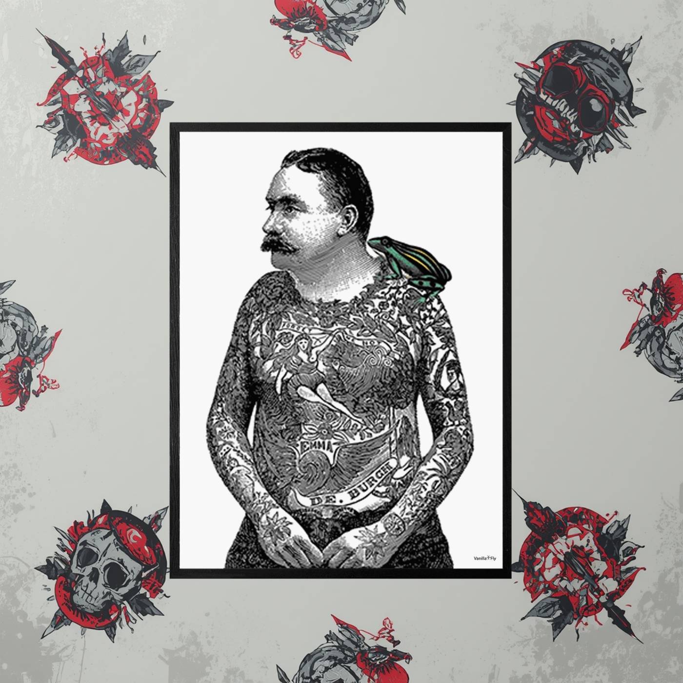 Stampa 30×40 “Tattoo Toad” con cornice nera e vetro protettivo. Una rana tatuata in stile vintage per chi ama l’arte grottesca e fuori dagli schemi. Poster decorativo perfetto per pareti stravaganti o ambienti eclettici.