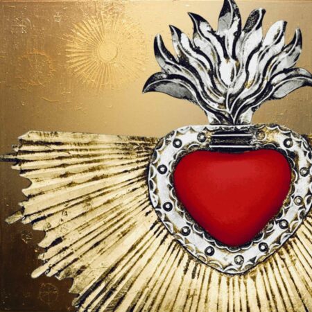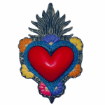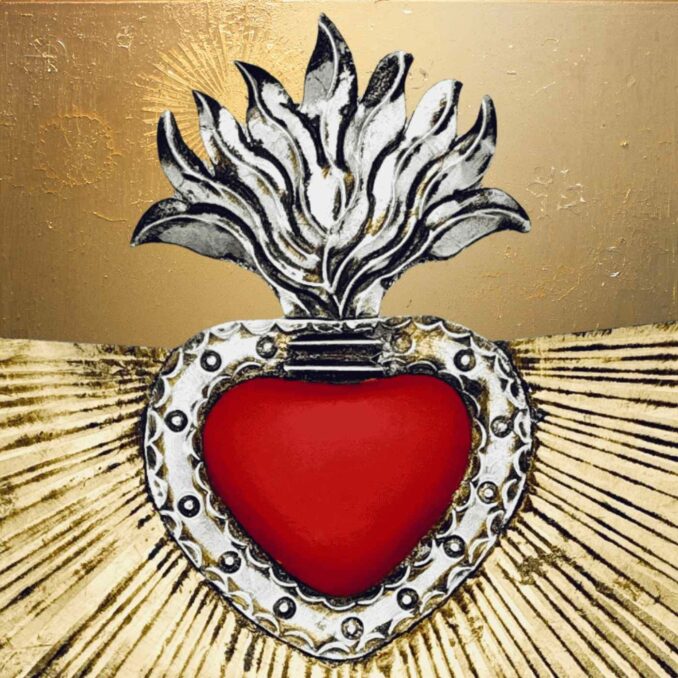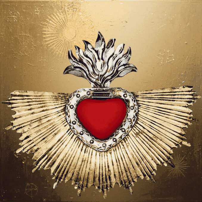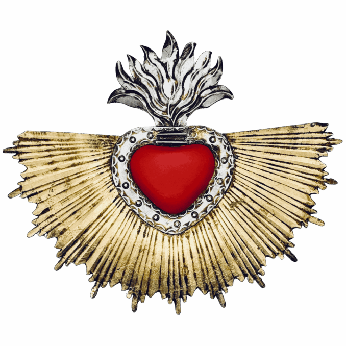 Cuore con raggi di luce dorato e cuore rosso, realizzato artigianalmente in latta e decorato a freddo.