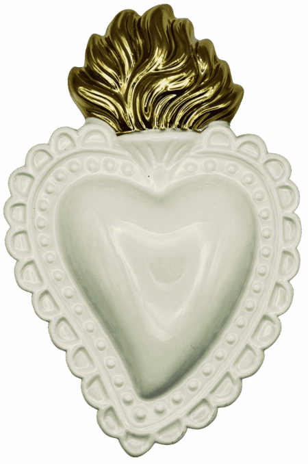 Piccolo cuore ex-voto decorativo bianco in porcellana dipinta a mano. Raffinato e simbolico, dona purezza e stile agli ambienti interni. Perfetto come decorazione elegante su mensole, librerie o pareti. Un’idea regalo sofisticata e originale.