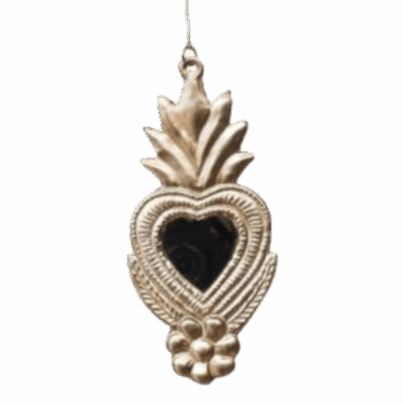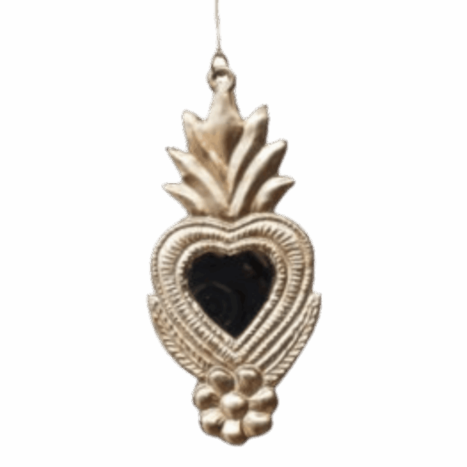 Cuore ex-voto con fiore,con specchio da appendere. Finitura dorata invecchiata per un effetto vintage spiritual chic. Un oggetto evocativo perfetto per pareti simboliche o d’ispirazione boho.