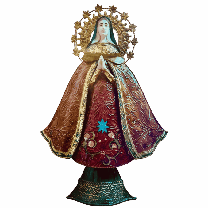 Icona religiosa realizzata in latta, raffigurante la Madonna in atteggiamento orante, dipinta interamente a mano e rifinita con colori a smalto che ne esaltano i dettagli e la luminosità.