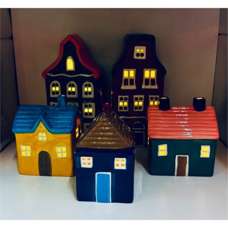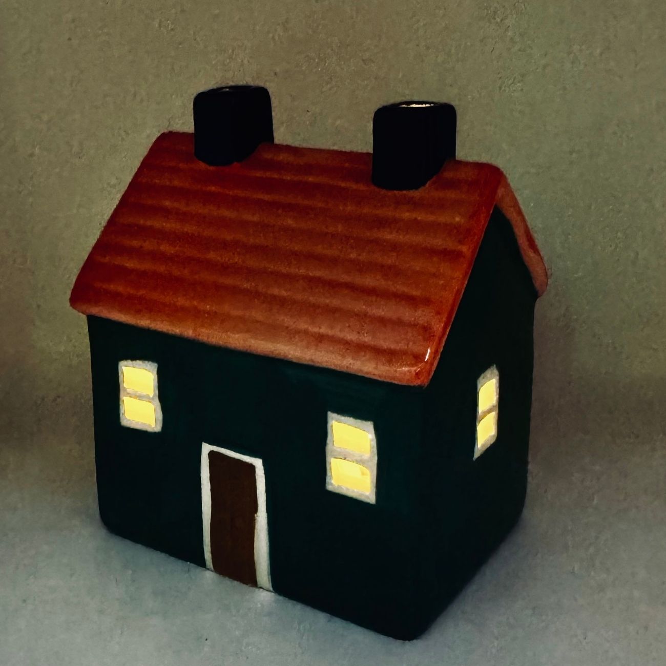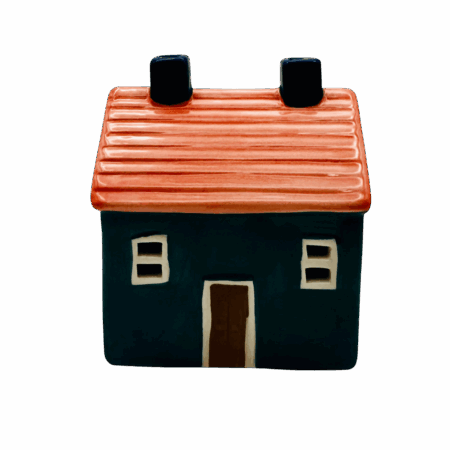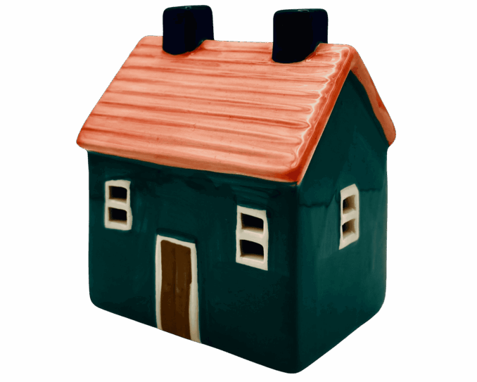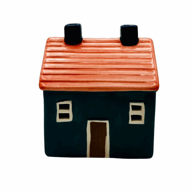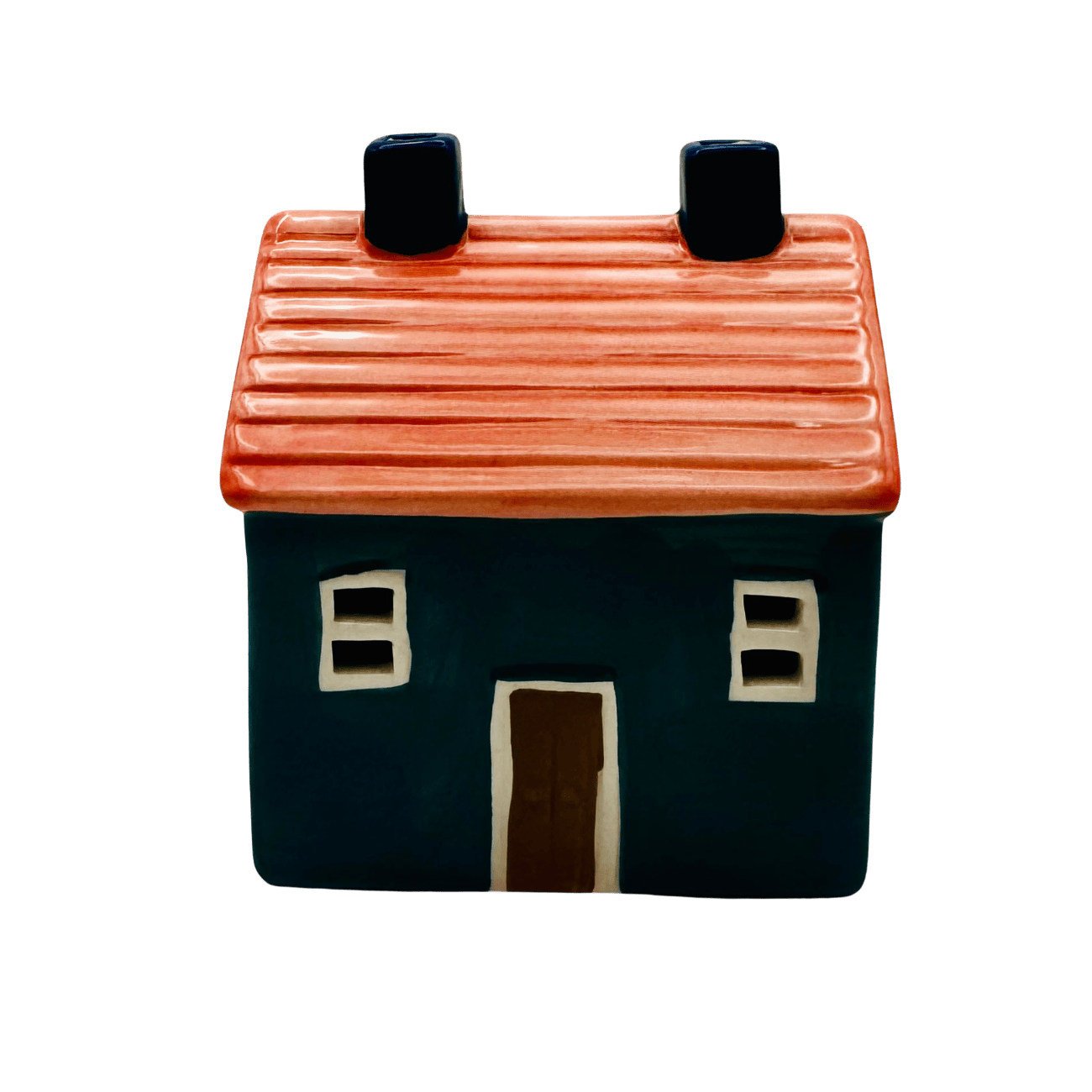 Casetta in ceramica color ottanio con tetto rosa sagomato e lucine LED. Un complemento d’arredo fiabesco e luminoso, perfetto per creare atmosfera in camere, soggiorni o angoli lettura.