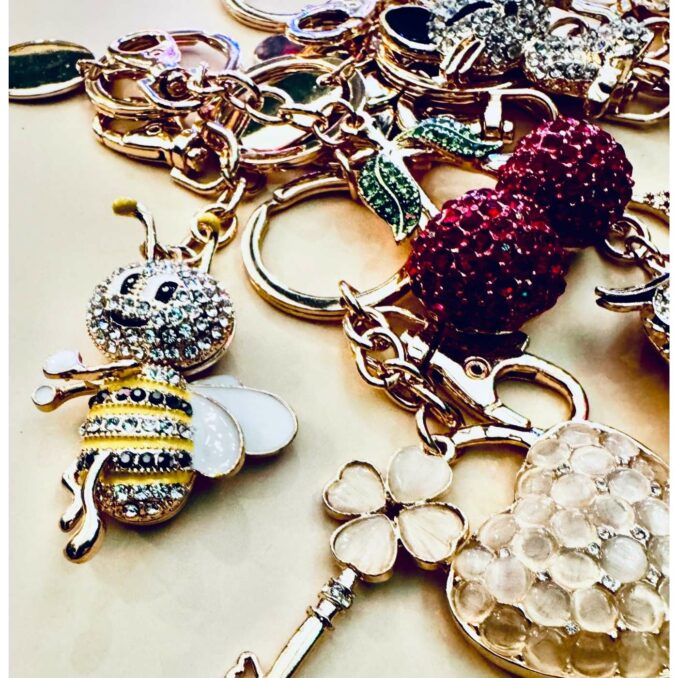 “Charm per borsa o portachiavi in metallo dorato, impreziosito da raffinati strass che aggiungono un tocco di luminosità ed eleganza. Un accessorio prezioso e originale, perfetto come idea regalo per se stessi o per una persona cara.”