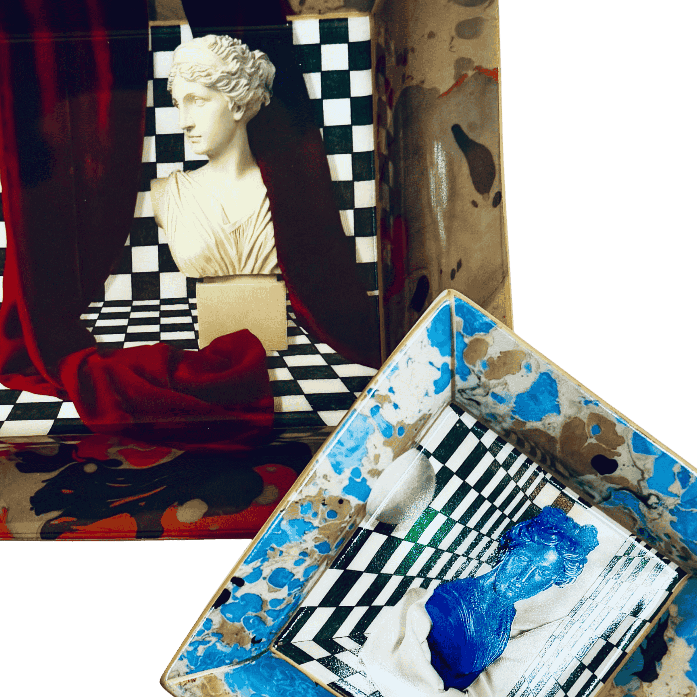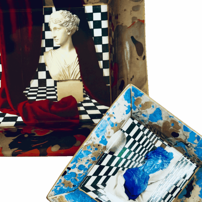 Svuotatasche quadrato 14×14 cm realizzato in porcellana finissima, impreziosito da una stampa multicolor che reinterpreta il mondo classico in tono pop. Un accessorio d’arredo originale e di forte impatto visivo, perfetto per dare carattere a ingressi, camere o zone living. Ideale per riporre piccoli oggetti quotidiani con stile.