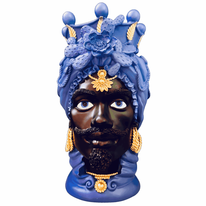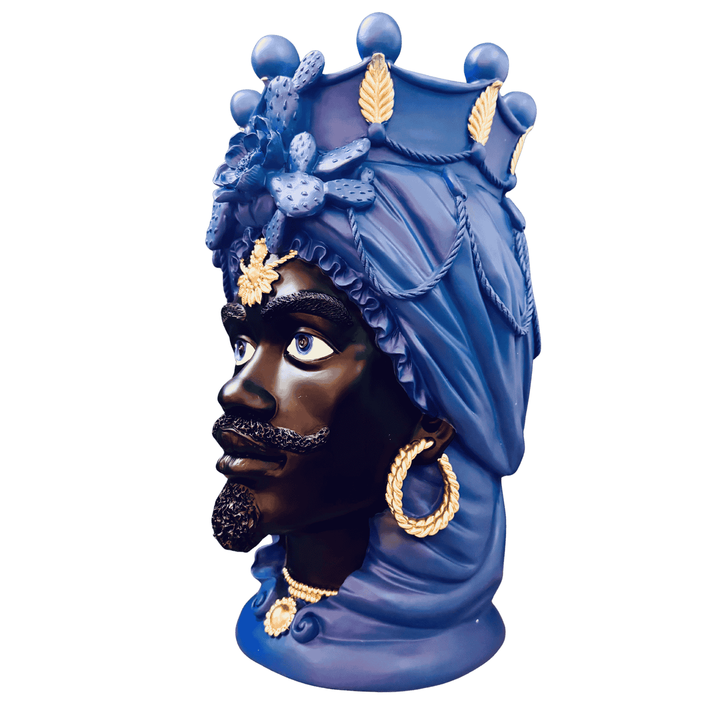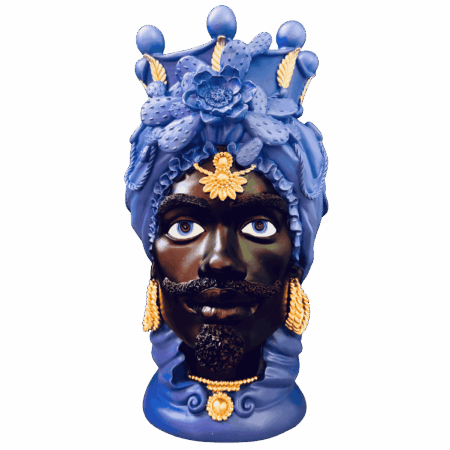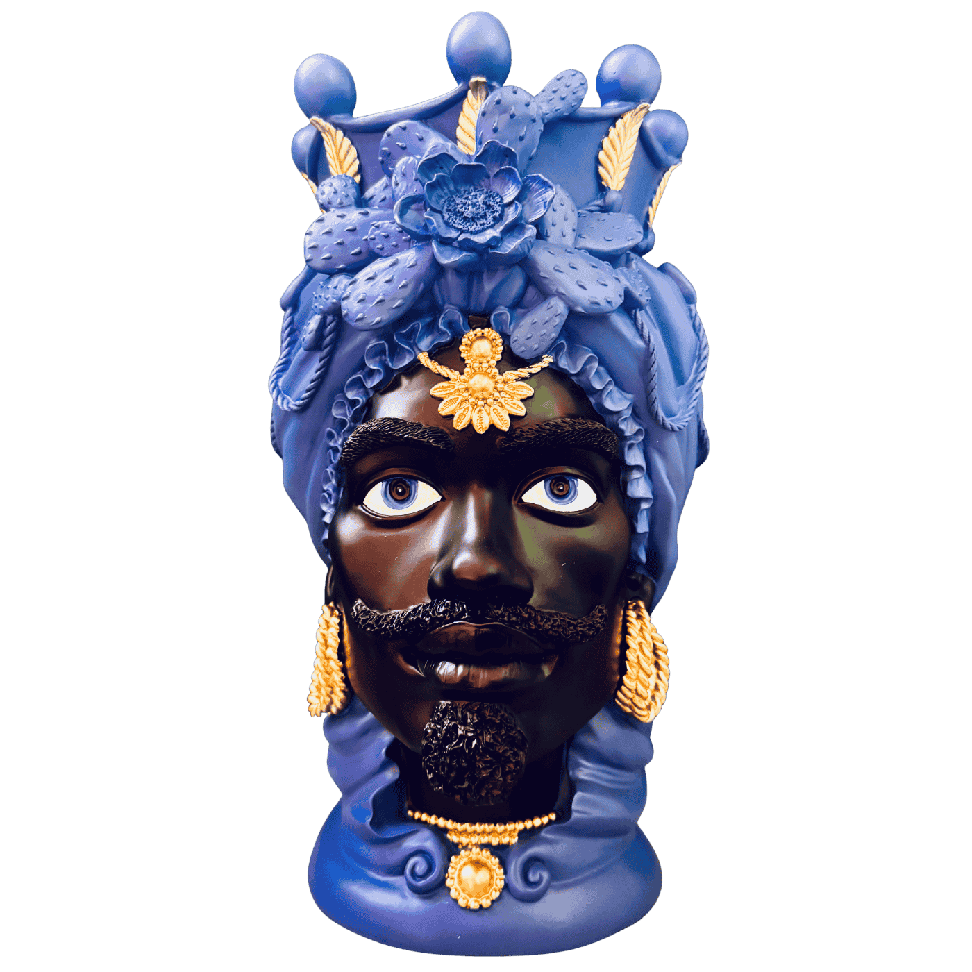 Testa di Moro Re in resina color blu e argento, lavorazione raffinata. Simbolo di cultura e identità siciliana, perfetta come oggetto decorativo da appoggio. Elegante in ambienti moderni o classici.