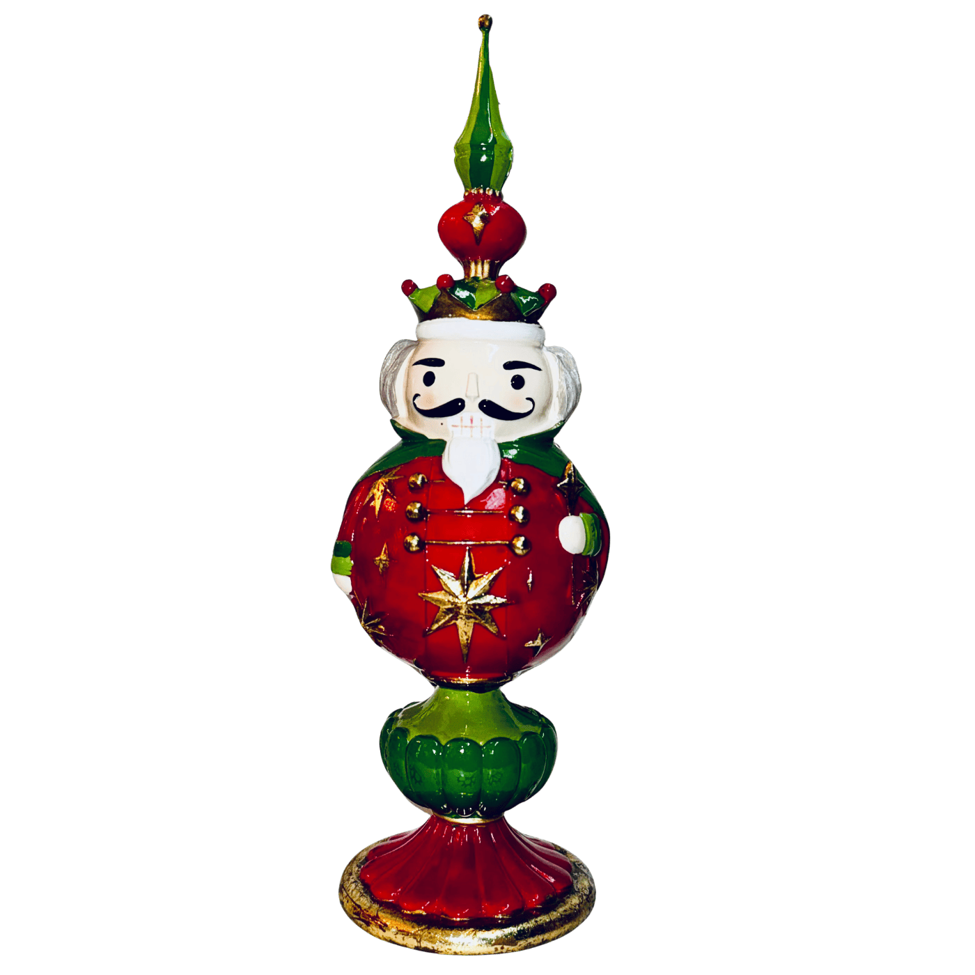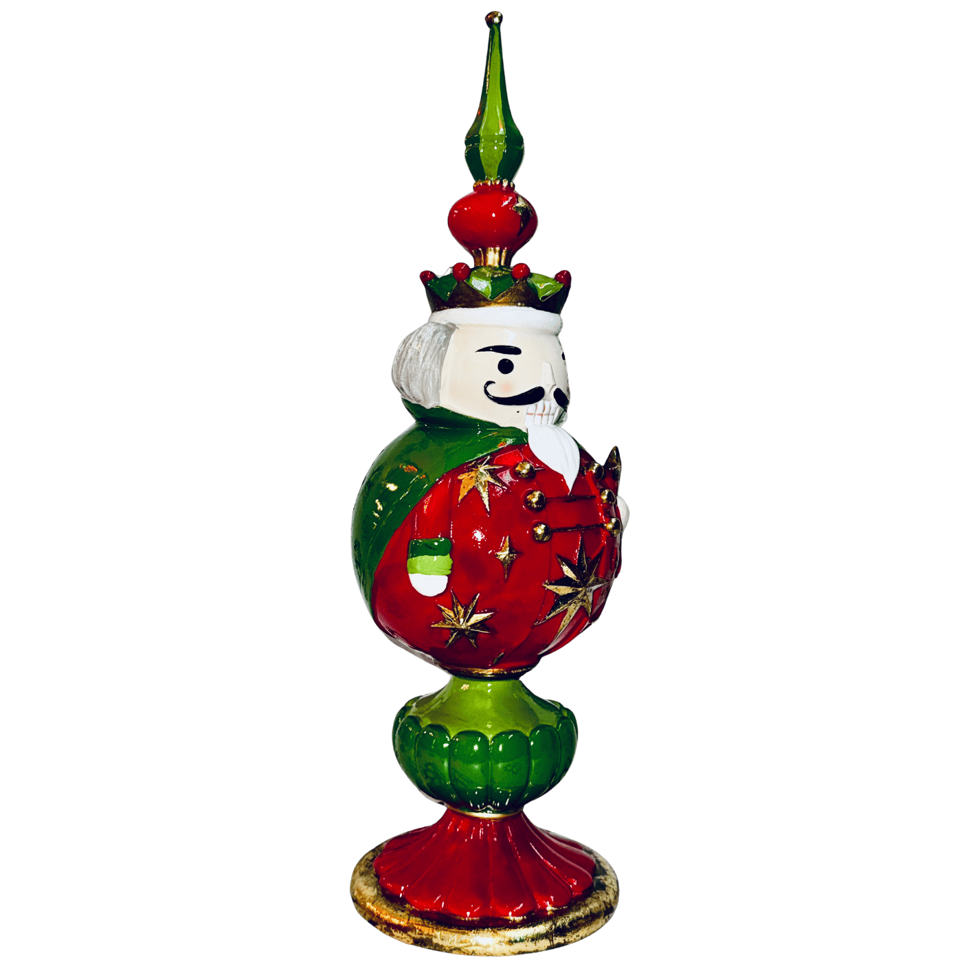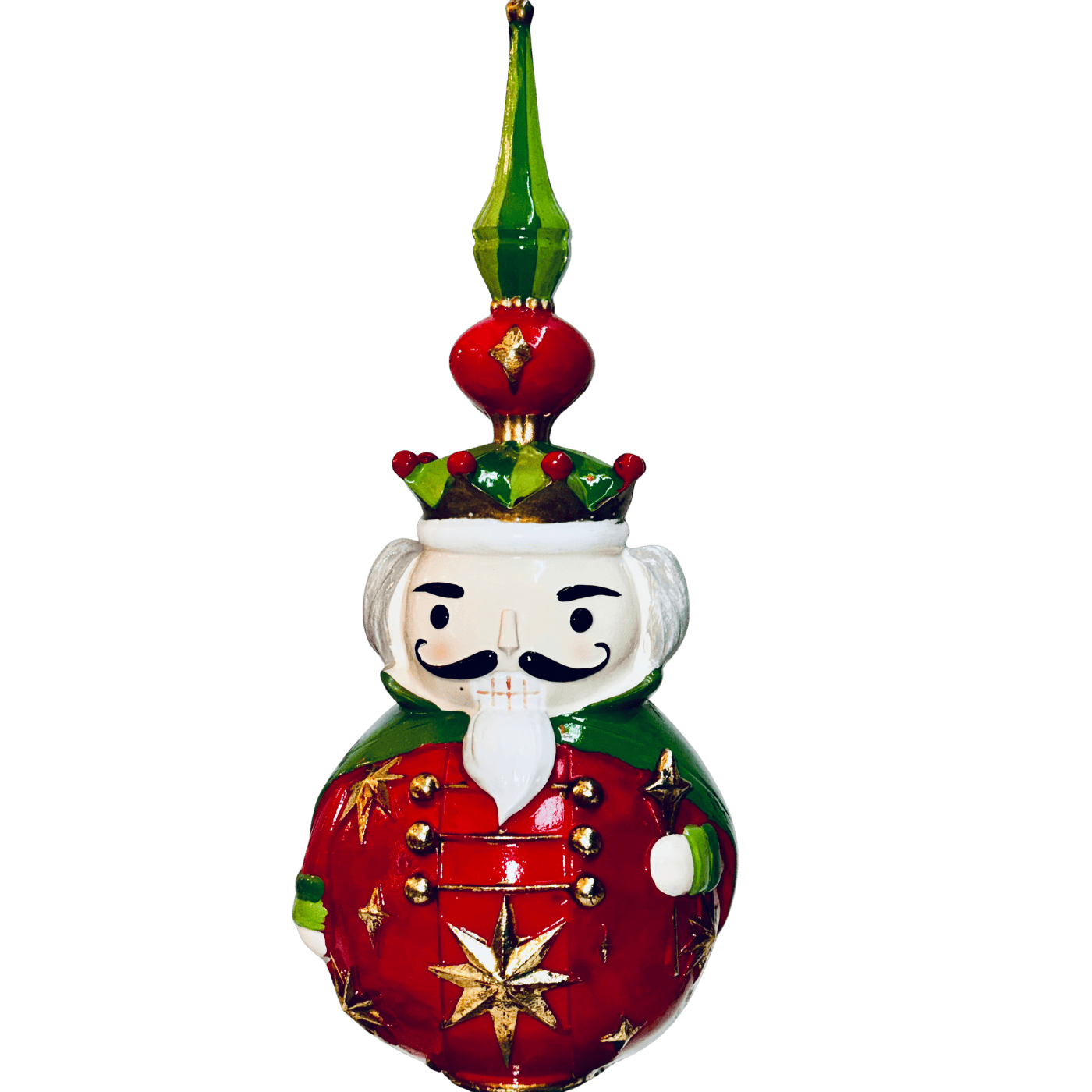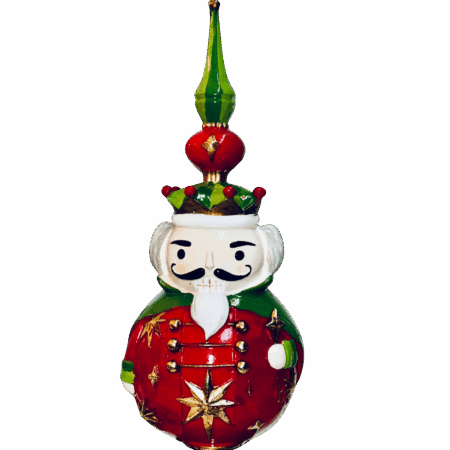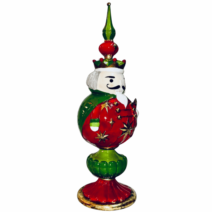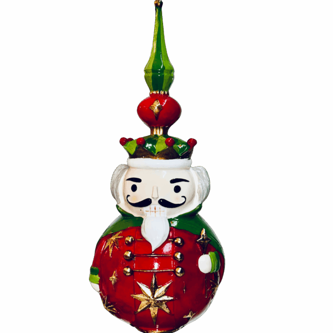 Una raffinata figura decorativa in resina che raffigura un elegante Schiaccianoci racchiuso in una palla di Natale, reinterpretando in chiave originale un grande classico delle feste.