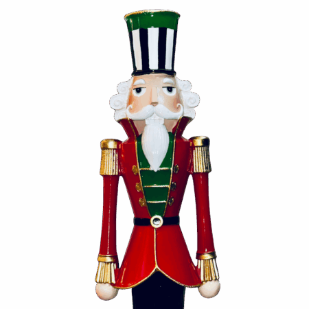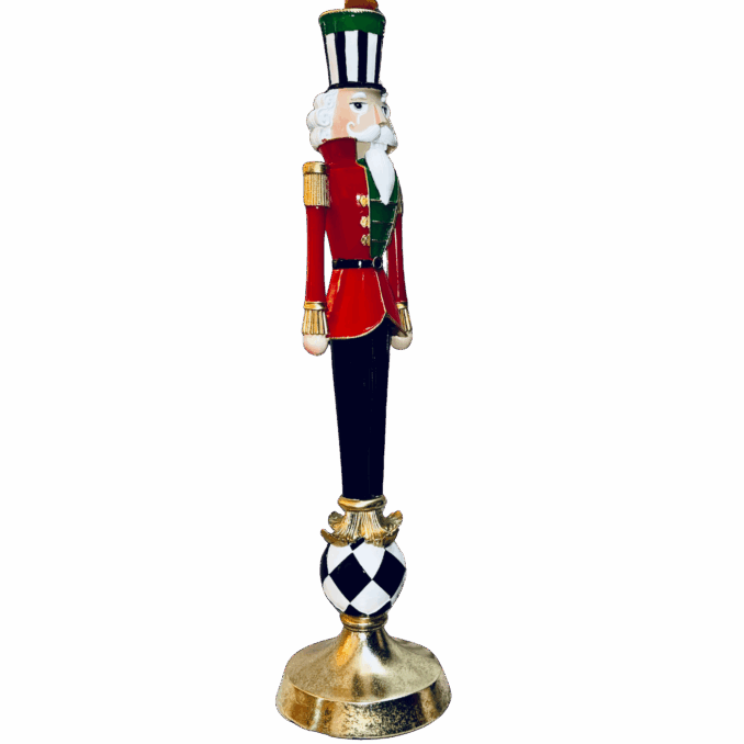 Un maestoso candelabro in resina che raffigura un elegante Schiaccianoci poggiato su una palla decorata con motivo a scacchi, per un effetto scenografico di grande impatto visivo.
