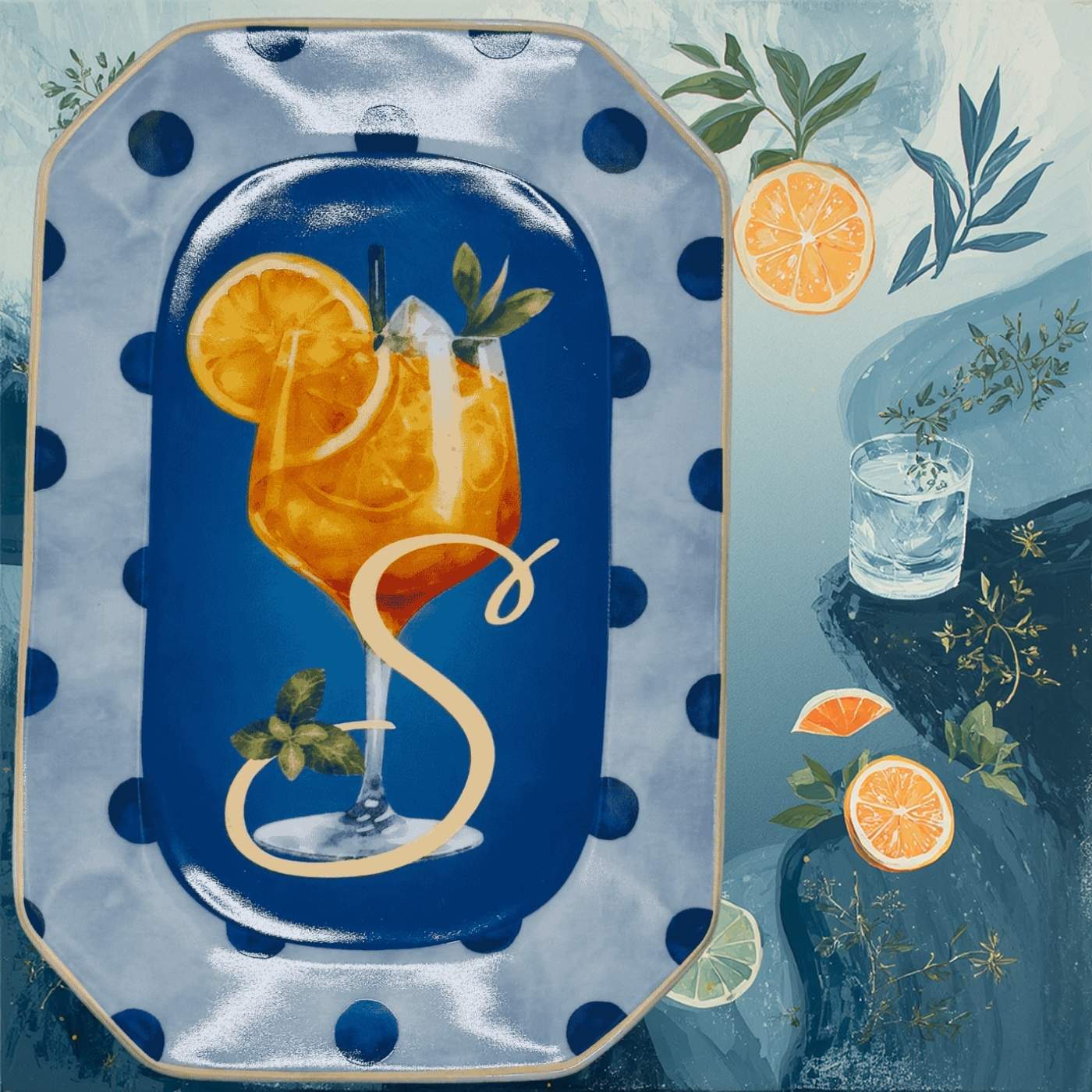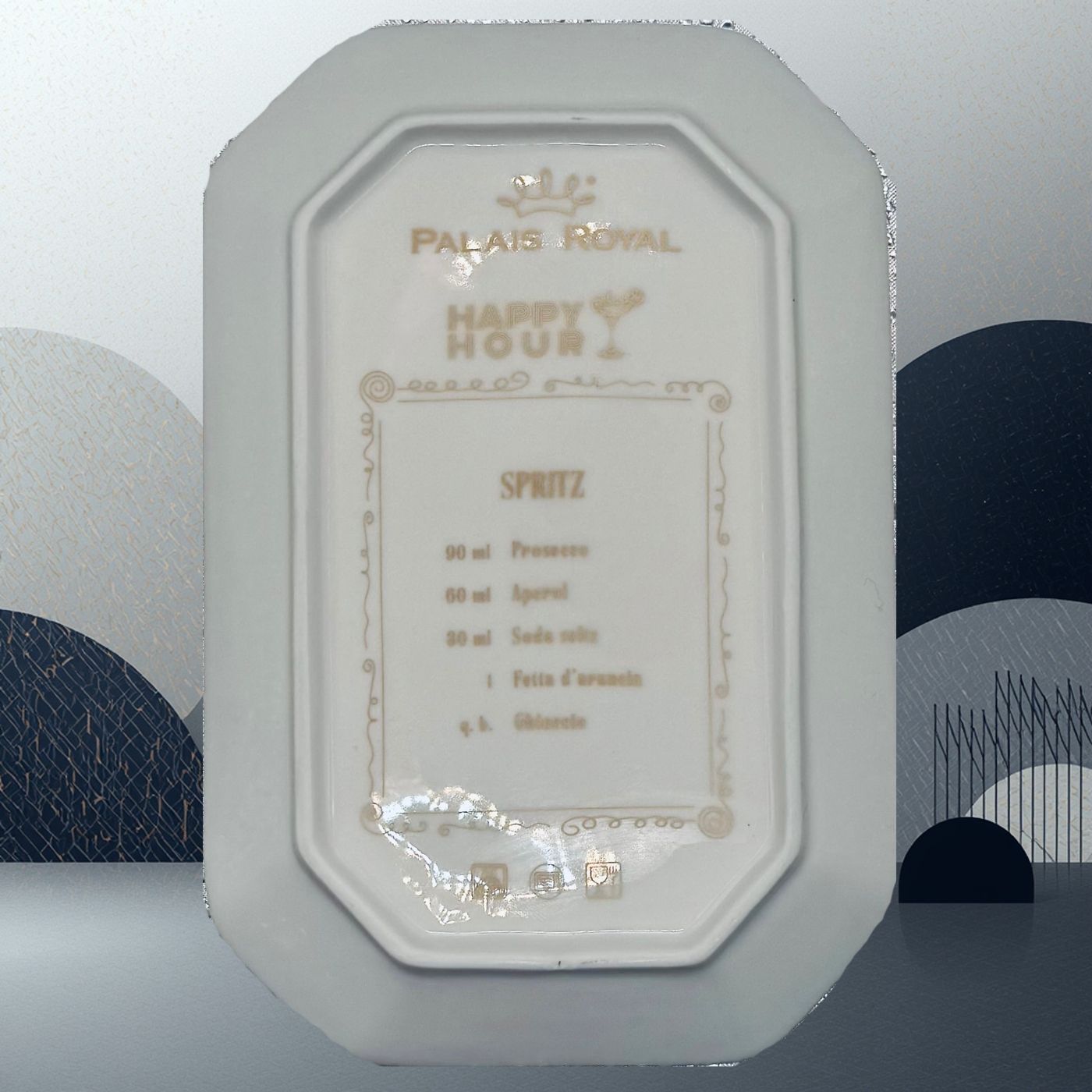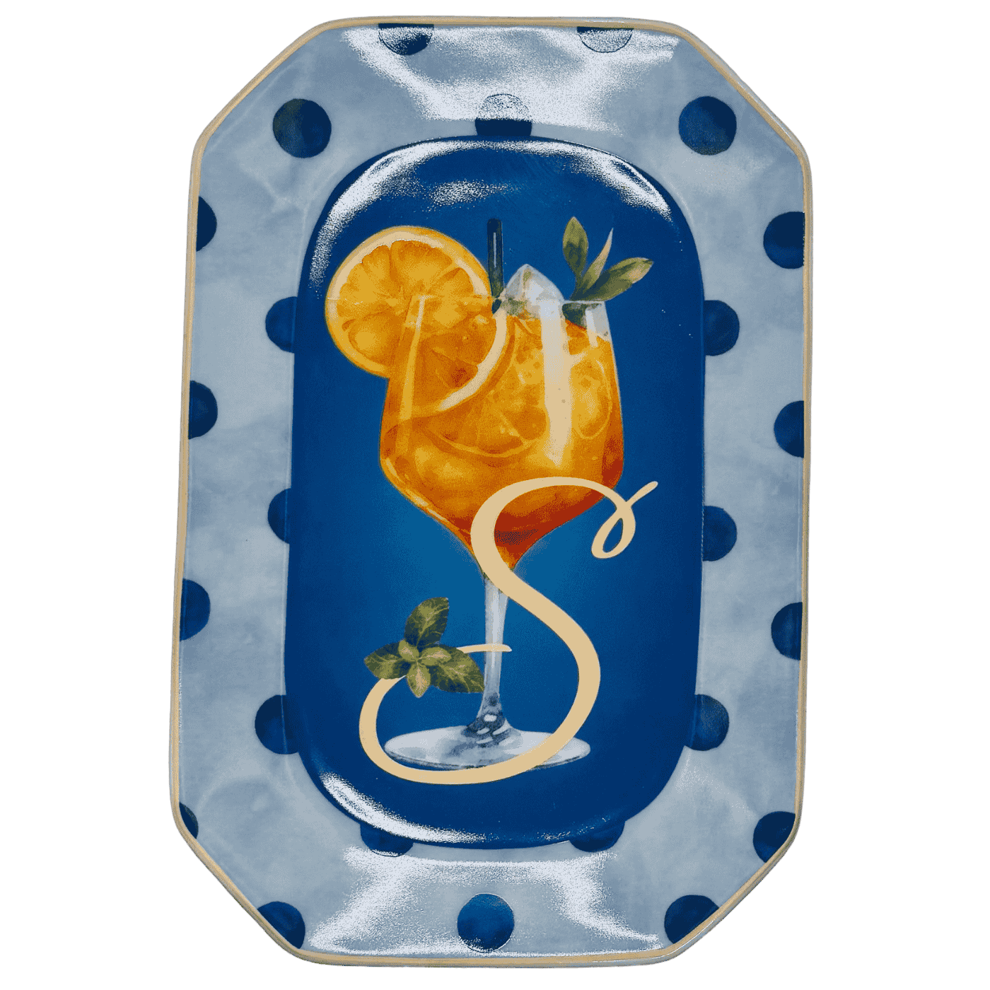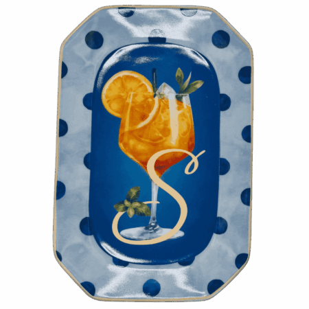 Vassoietto della linea “Happy Hour” con iniziale S, realizzato in porcellana. Sul lato frontale è stampata l’illustrazione di un cocktail, mentre sul retro è riportata la relativa ricetta, rendendolo un oggetto originale e decorativo.