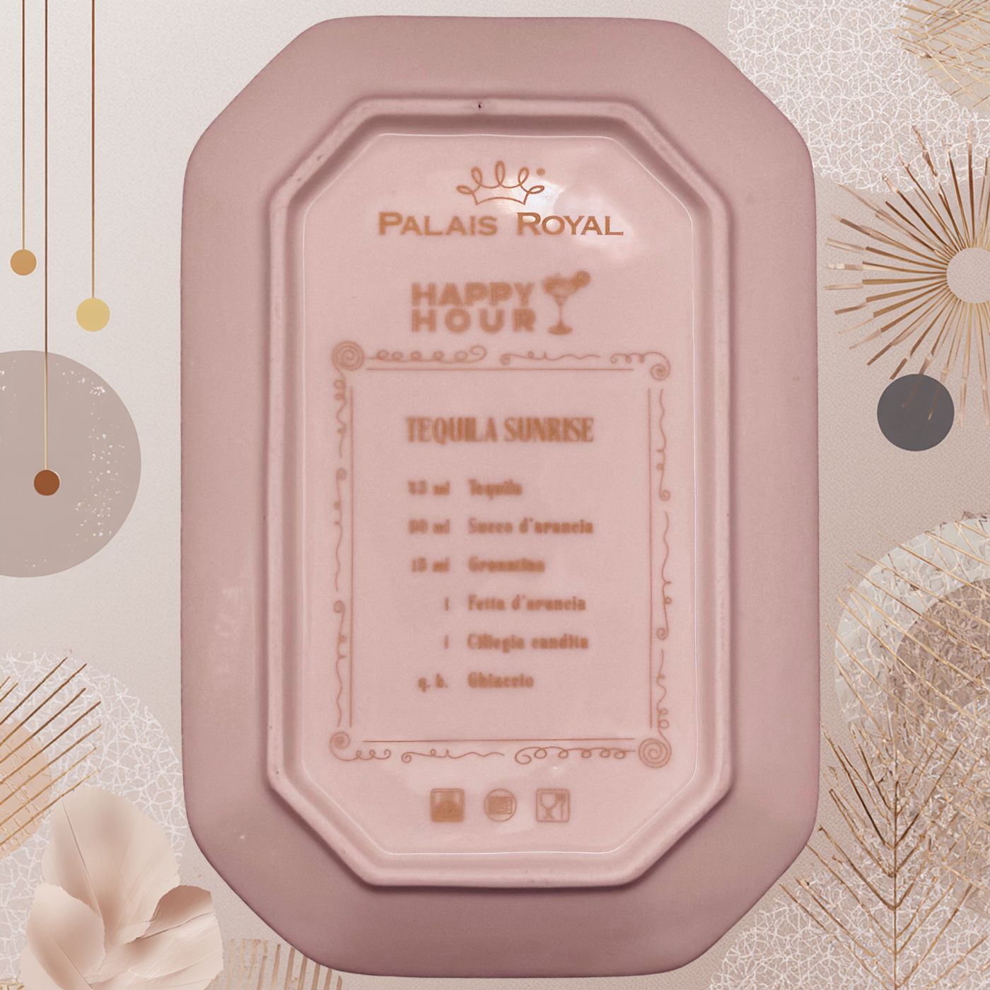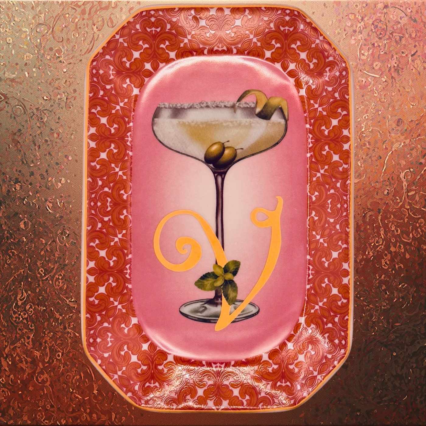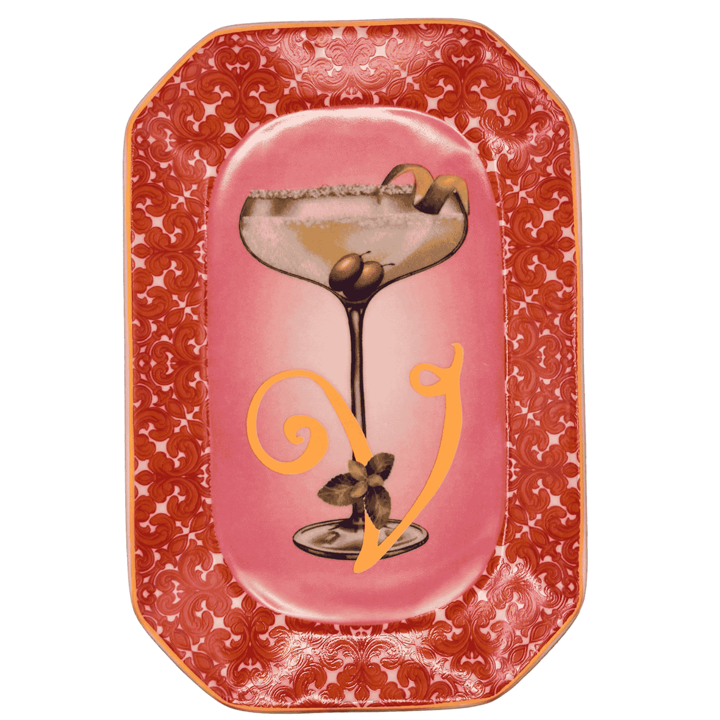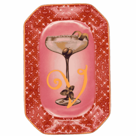 Vassoietto della linea “Happy Hour” con iniziale V, realizzato in porcellana. Sul lato frontale è stampata l’illustrazione di un cocktail, mentre sul retro è riportata la relativa ricetta, rendendolo un oggetto originale e decorativo.