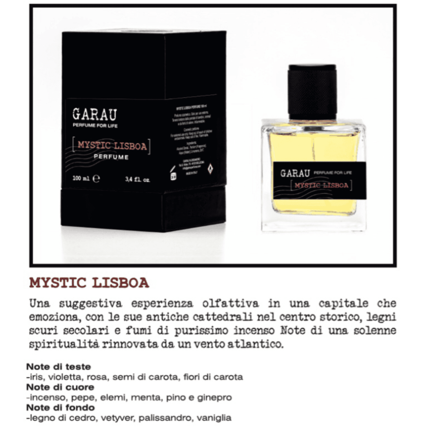 MYSTIC LISBOA – Eau de Parfum, 100 ml, linea Garau Perfume è una fragranza di nicchia che racconta un viaggio sensoriale intenso e suggestivo, ispirato al fascino misterioso della capitale portoghese.