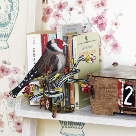 Uccellino in tessuto “Red Baron”, stile cardellino. Confezionato piatto, facile da montare. Ideale per librerie, pareti o regali eco e stilosi. Made in Italy.