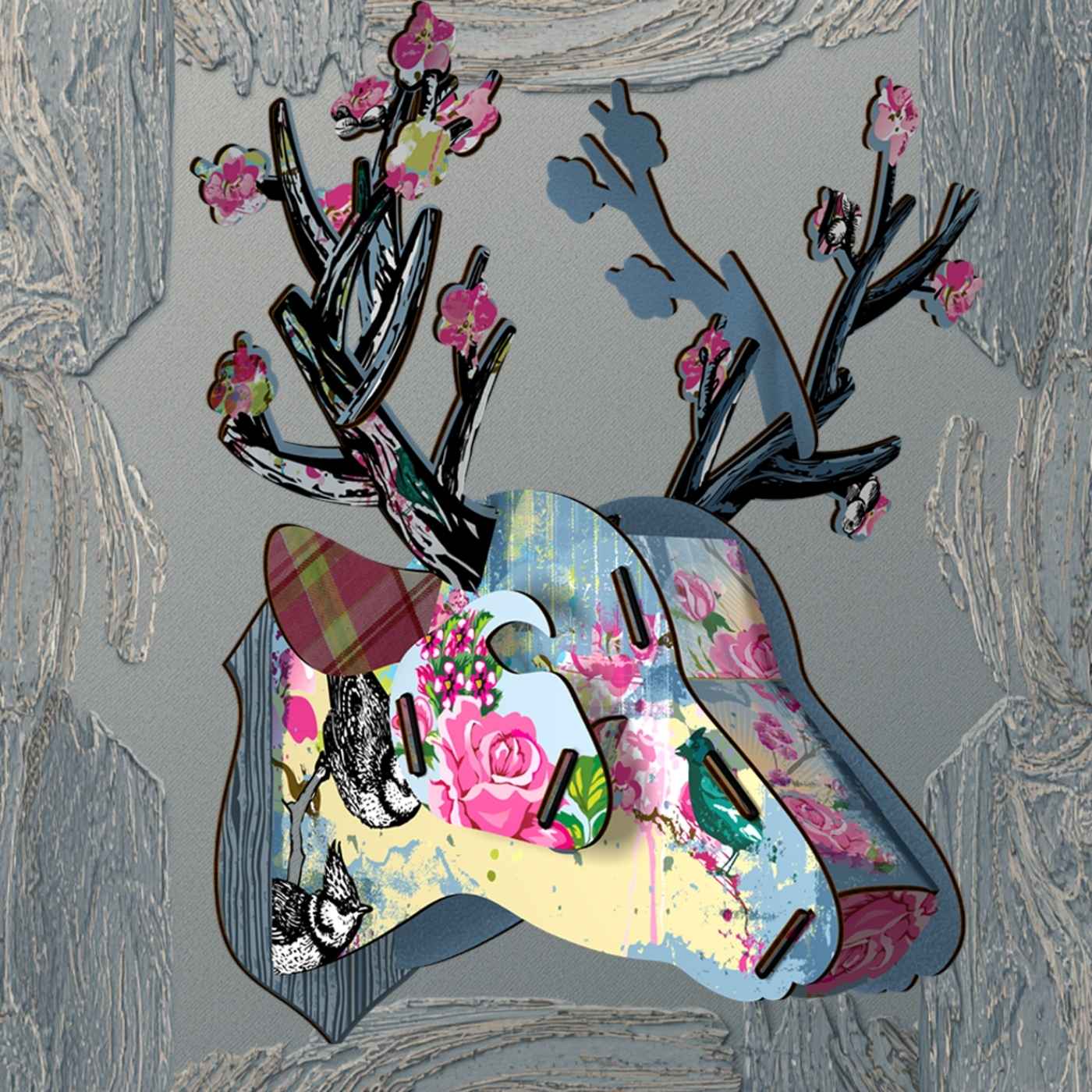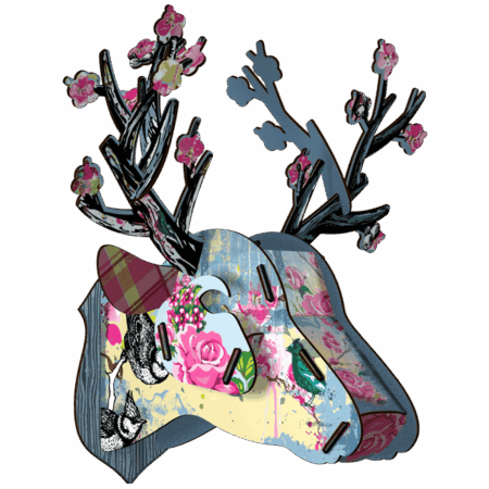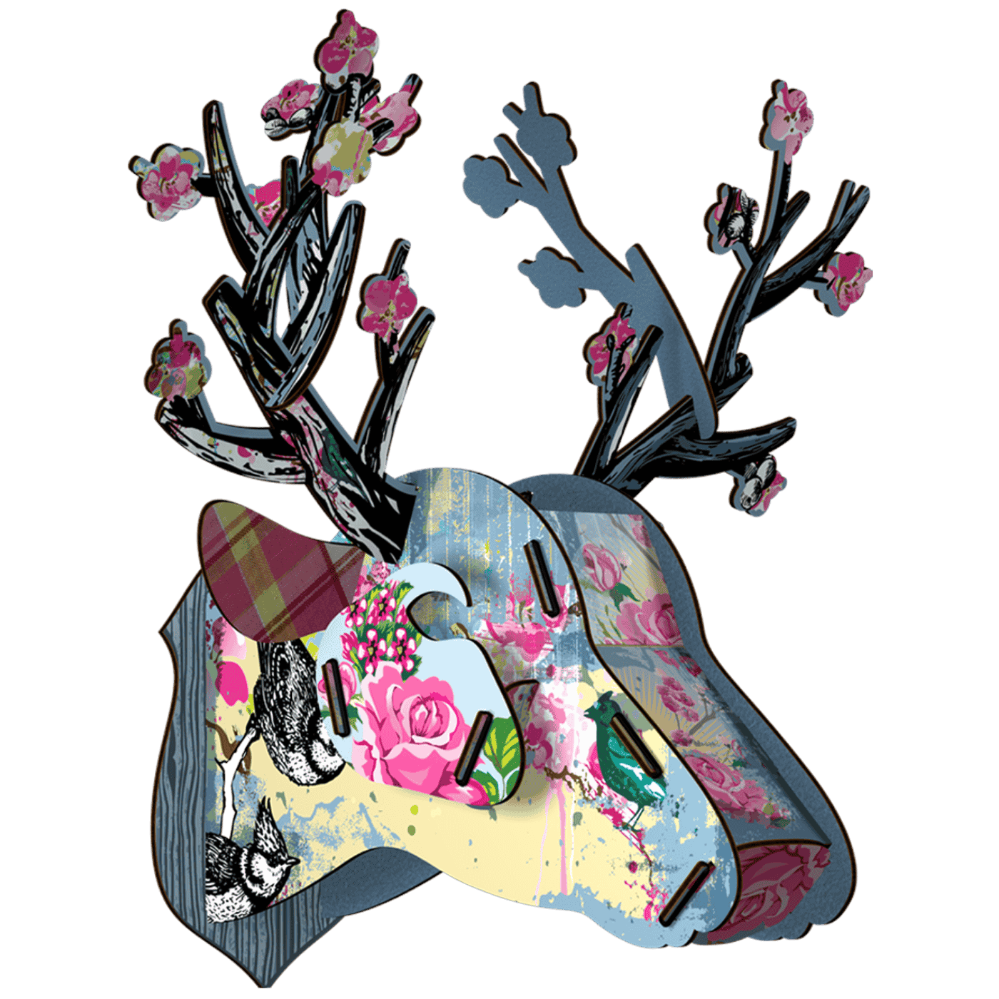 Cervo medio da parete in cartone riciclato, decoro “Blossom”. Un oggetto artistico e sostenibile che dà carattere alle pareti. Facile da montare, perfetto per ambienti creativi e contemporanei.