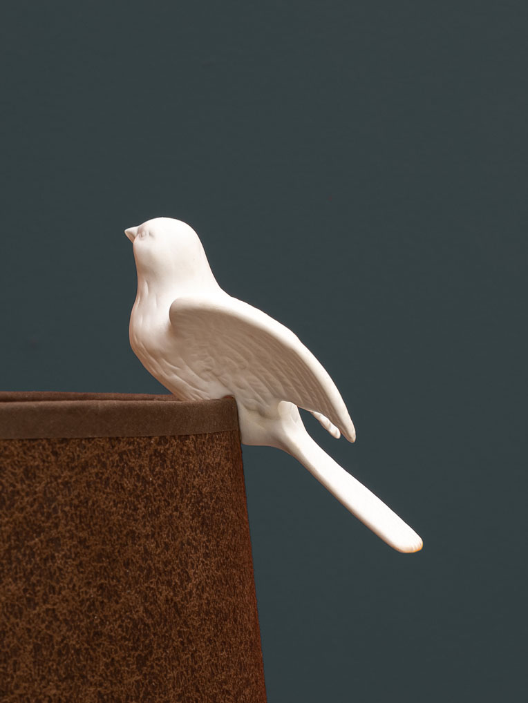 Colombina da bordo in porcellana bianca opaca, perfetta da posare su bordi o paralumi. Un elemento poetico e discreto, capace di donare leggerezza e movimento a qualsiasi ambiente.