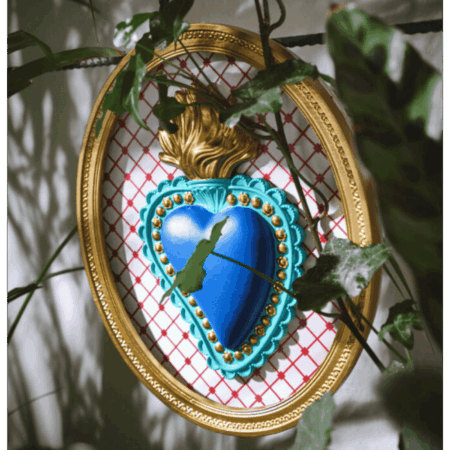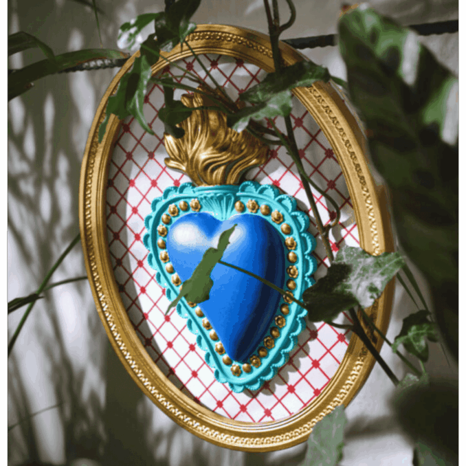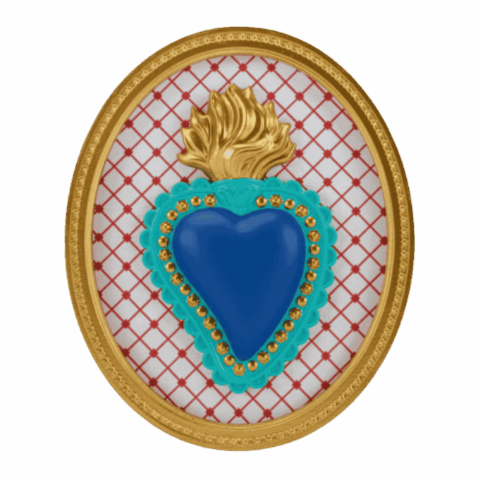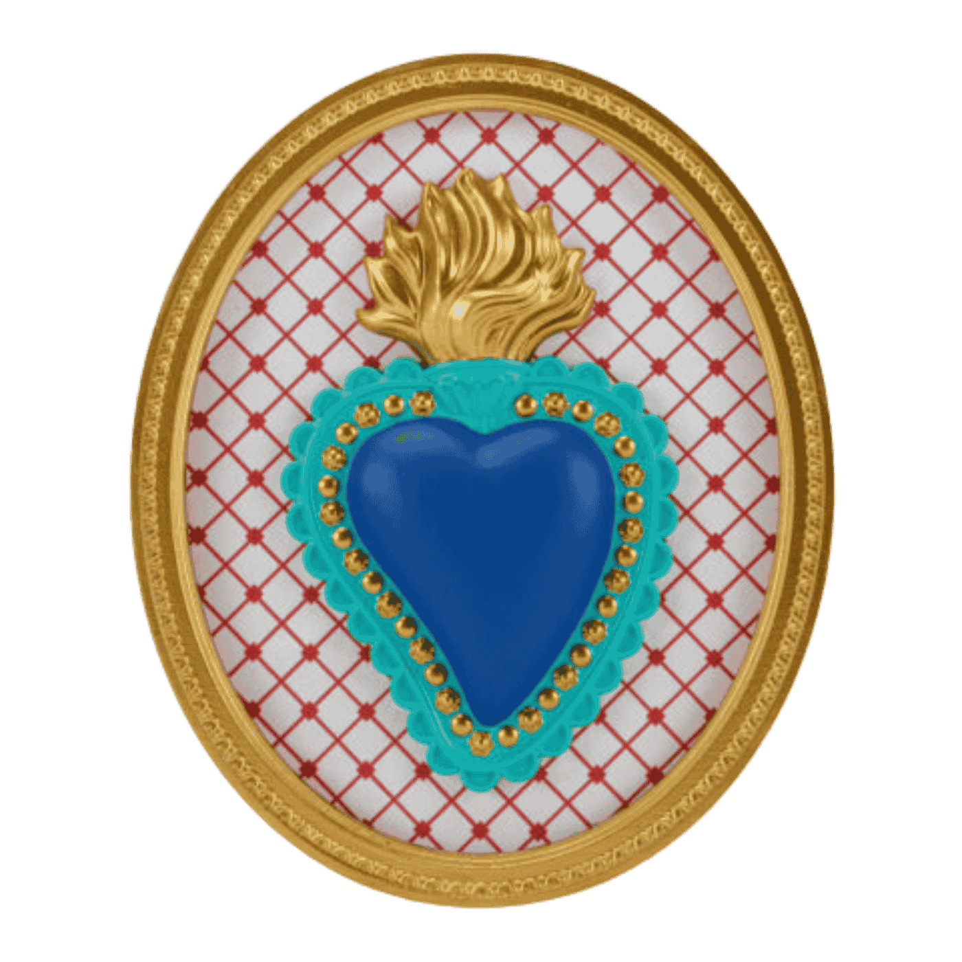 Cornice ovale con cuore blu e rombi bianchi, dipinta a mano su base in resina. Un quadro spirituale moderno, perfetto per aggiungere colore e profondità simbolica a pareti e spazi creativi.