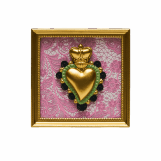 Cornice rettangolare in resina con cuore verde e raggi gialli. Oggetto decorativo realizzato e dipinto a mano, che richiama i simboli del sacro in una veste pop e luminosa. Un’idea regalo intensa e gioiosa.