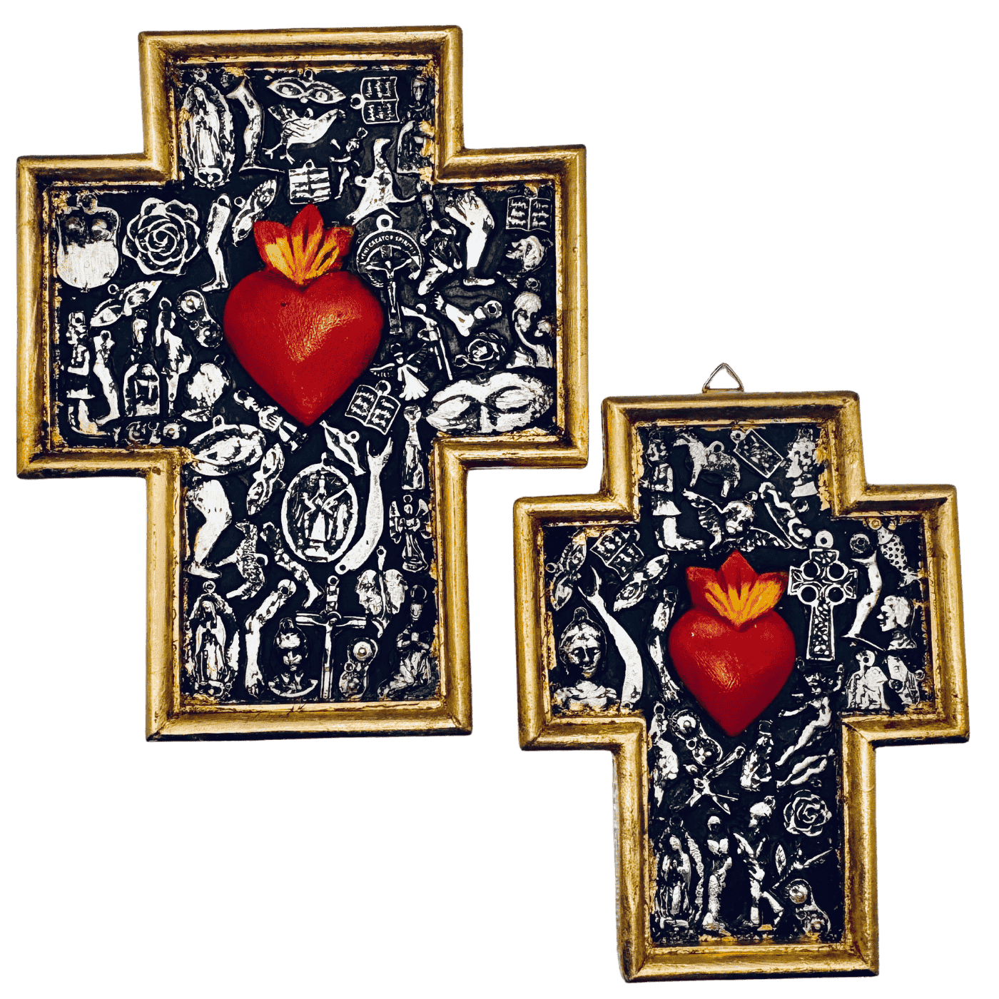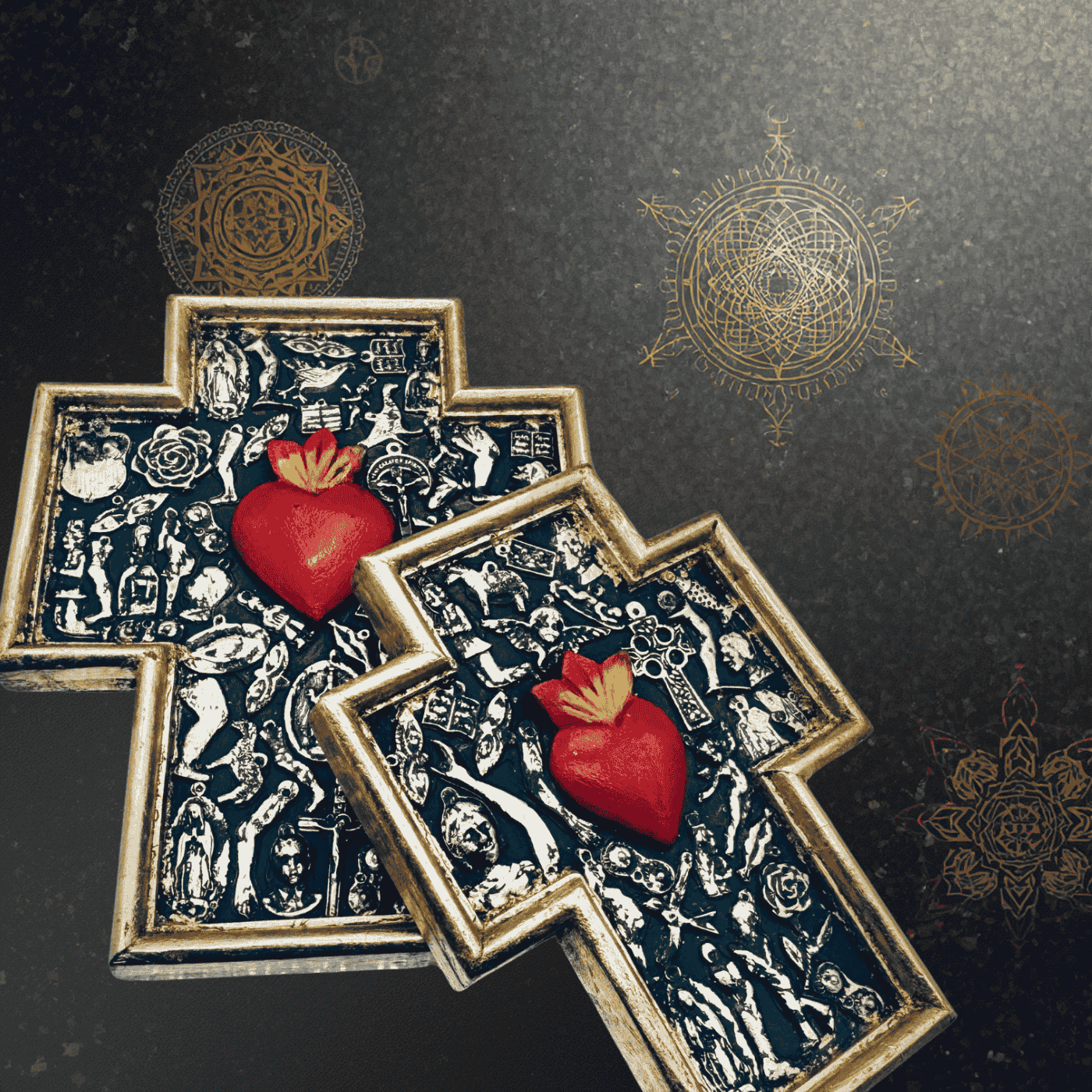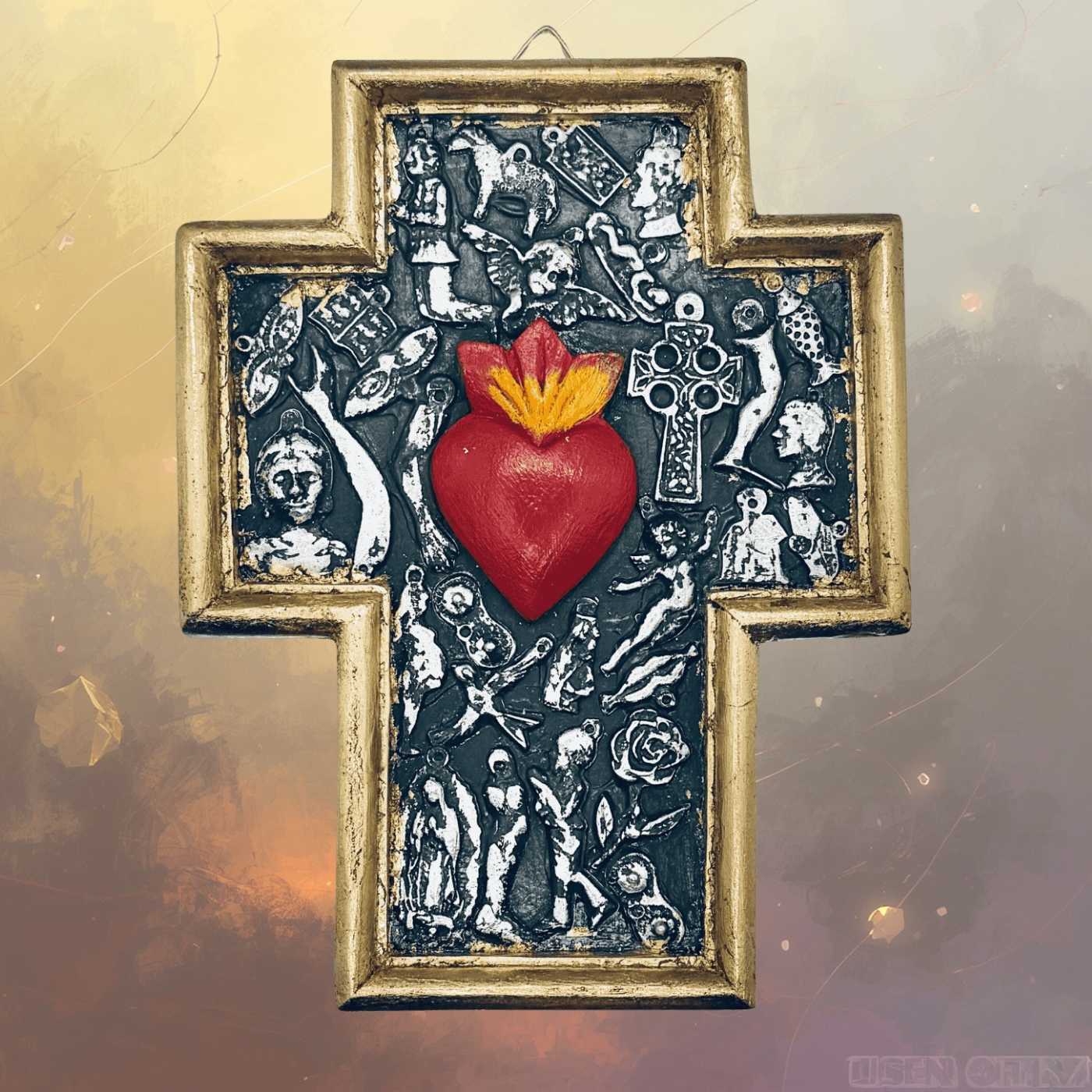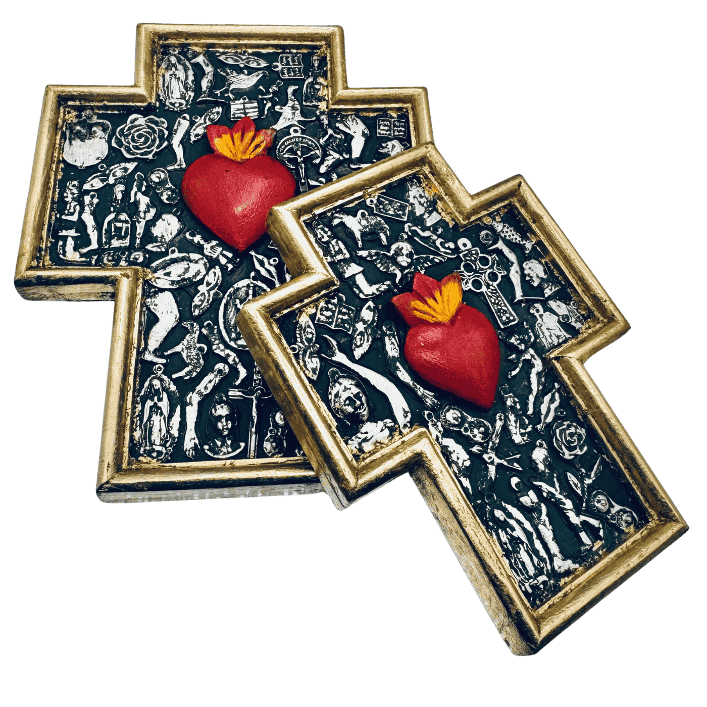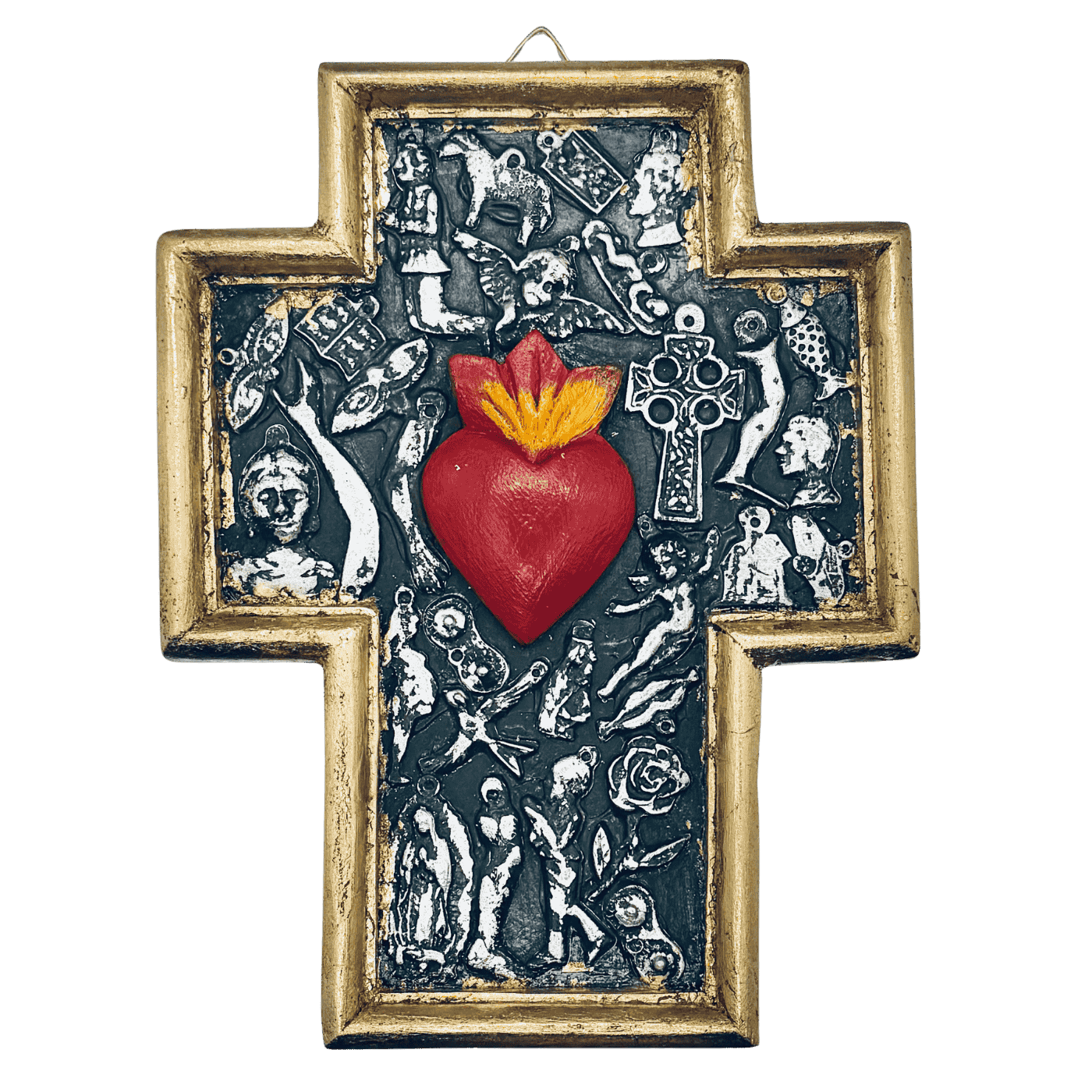 Croce di grande misura con cuore sacro rosso, decorata con milagros in metallo e rifinita da un elegante bordo dorato. Un oggetto artigianale dal forte valore simbolico, curato nei dettagli e dal fascino senza tempo.