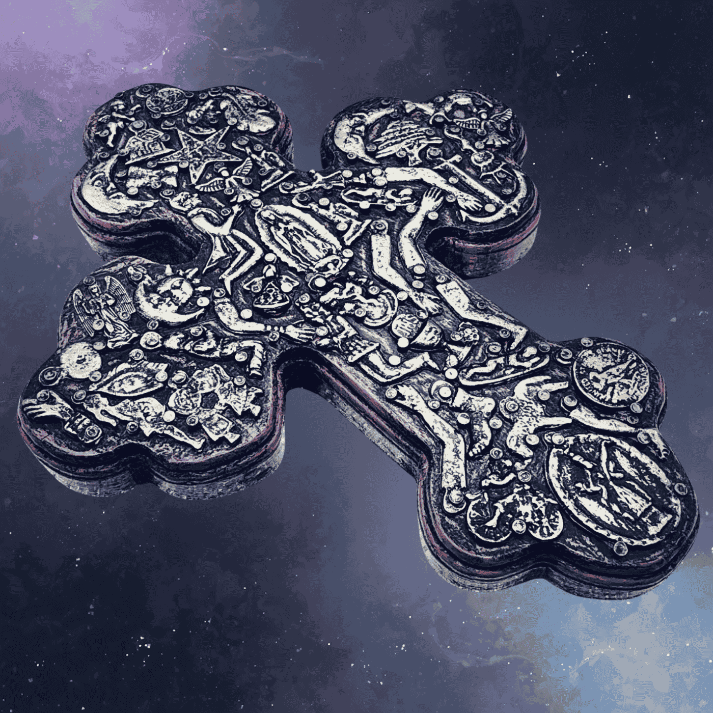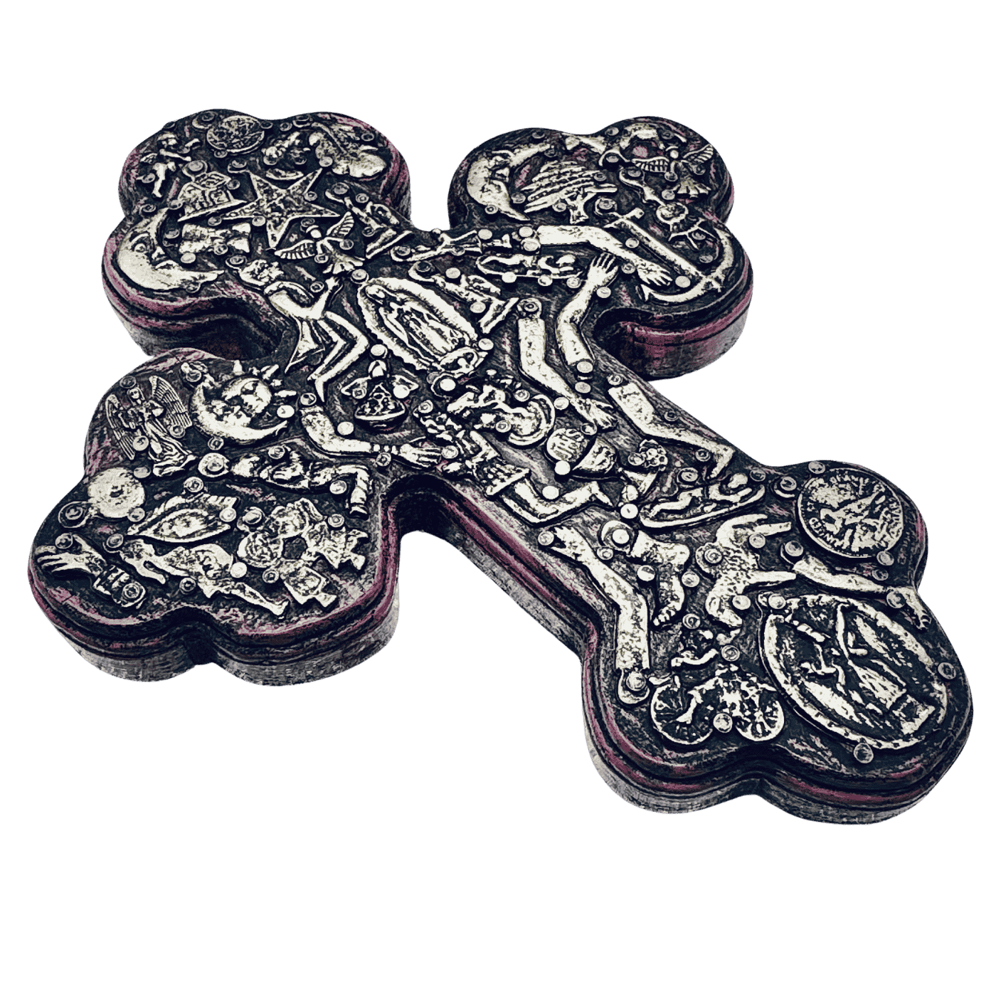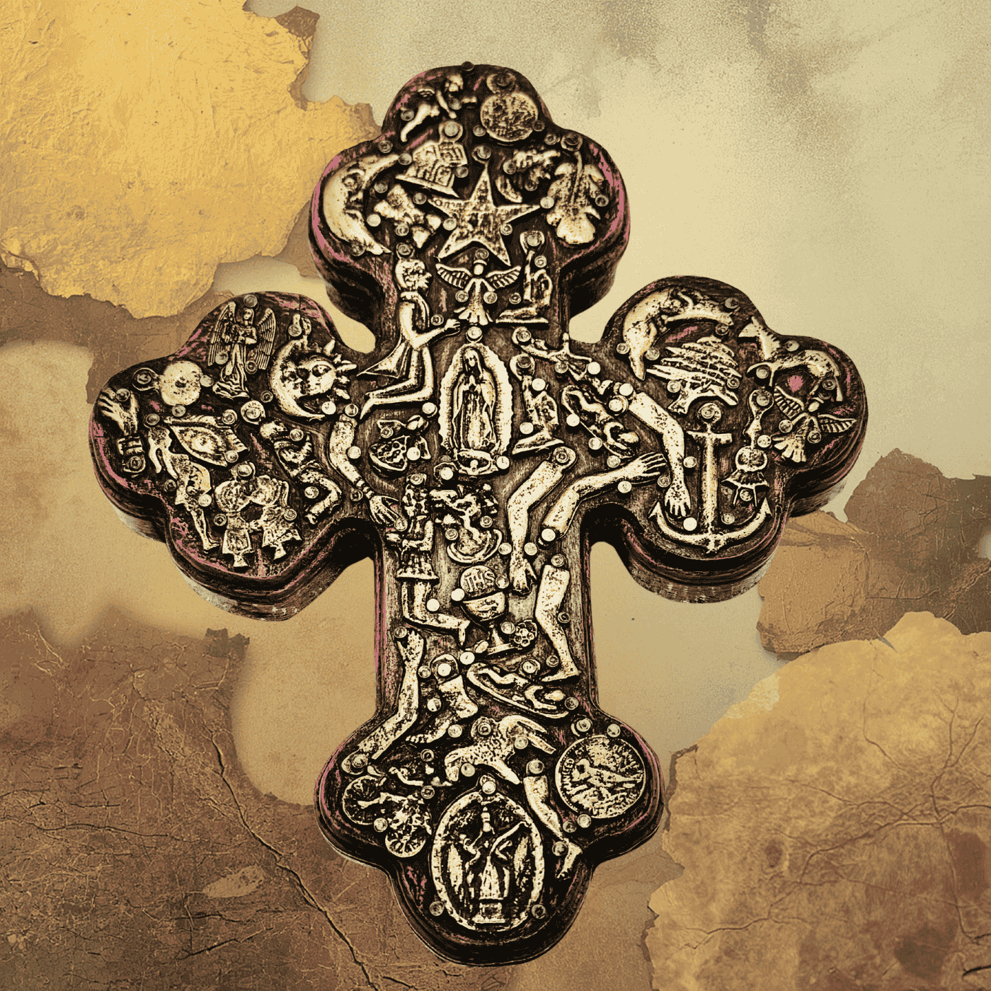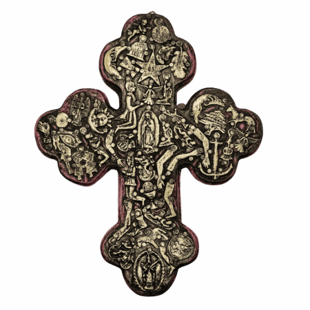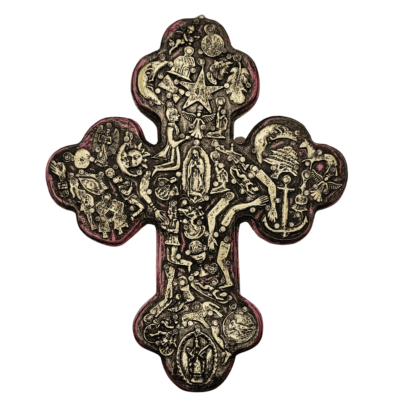 Croce romana di media misura in legno, decorata con milagros in metallo. La lavorazione artigianale e i dettagli metallici conferiscono all’oggetto un carattere autentico e un forte valore simbolico, rendendolo un elemento decorativo ricco di significato.