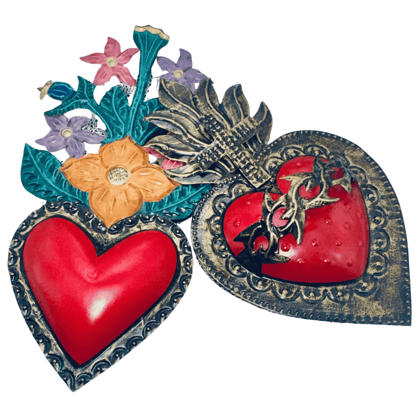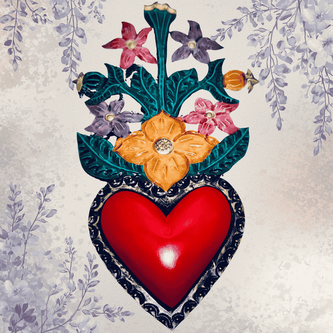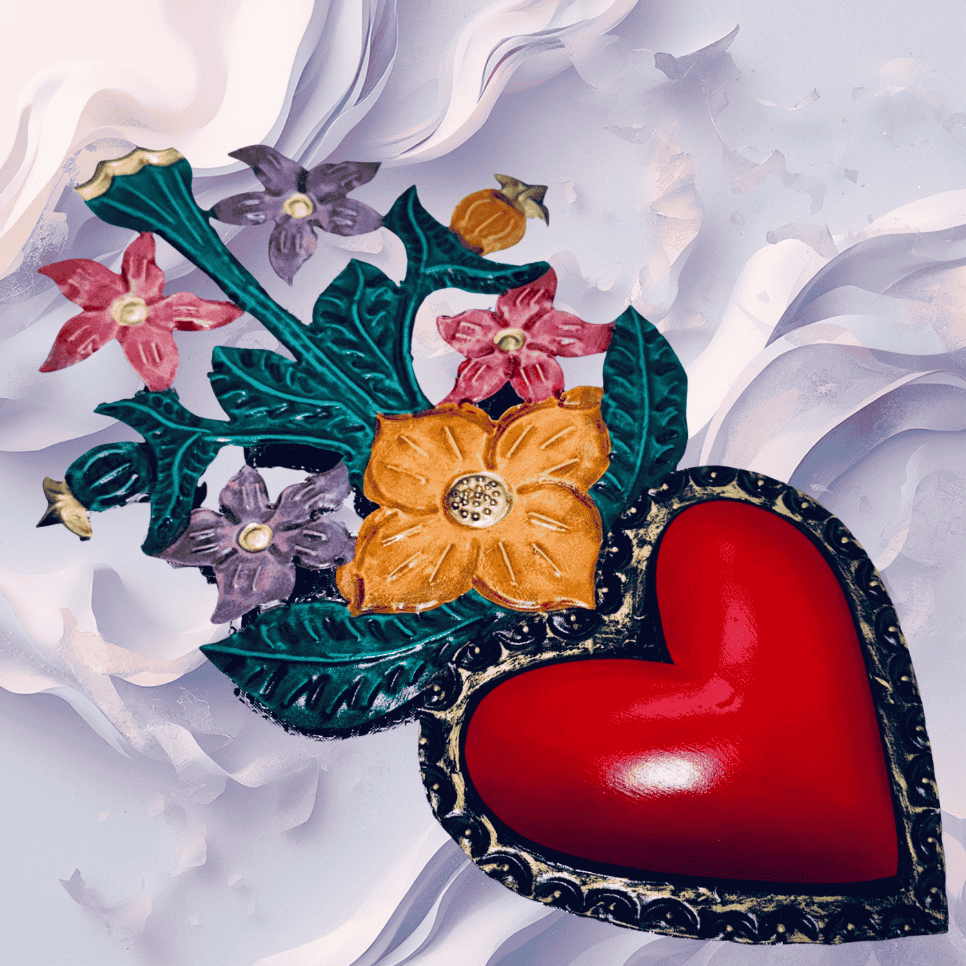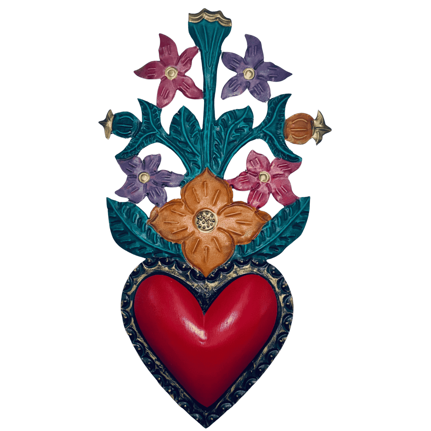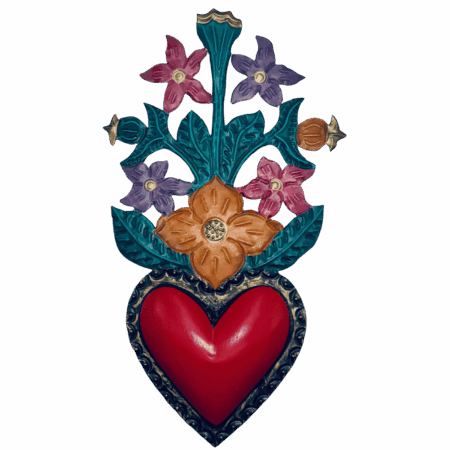 Cuore votivo con fiore variopinto sulla sommità, realizzato artigianalmente in latta e decorato a freddo con colori acrilici.