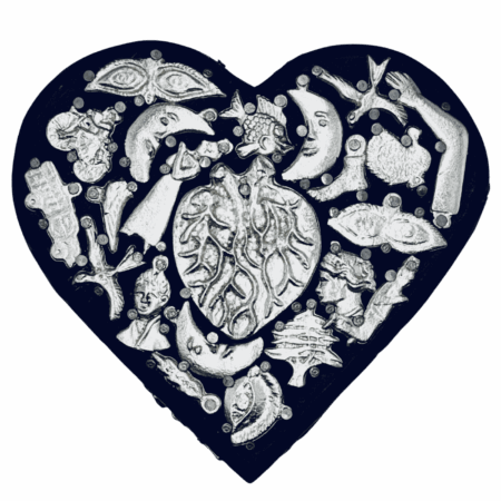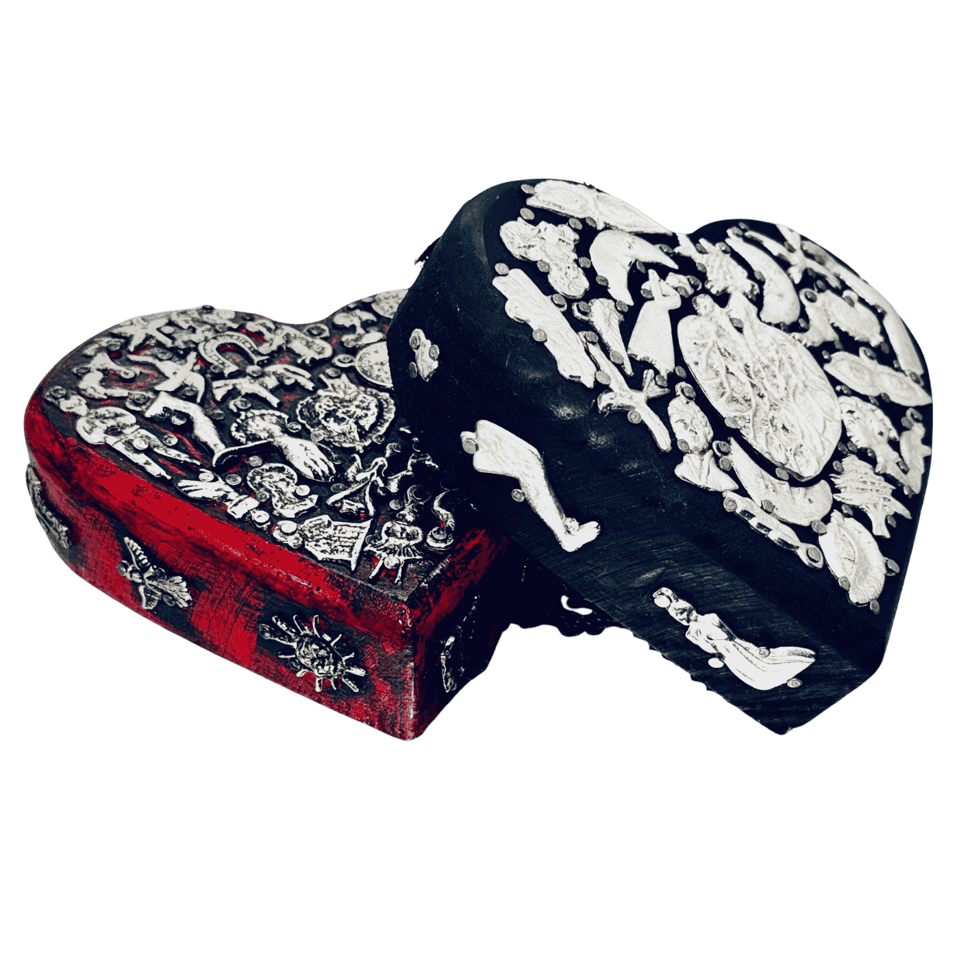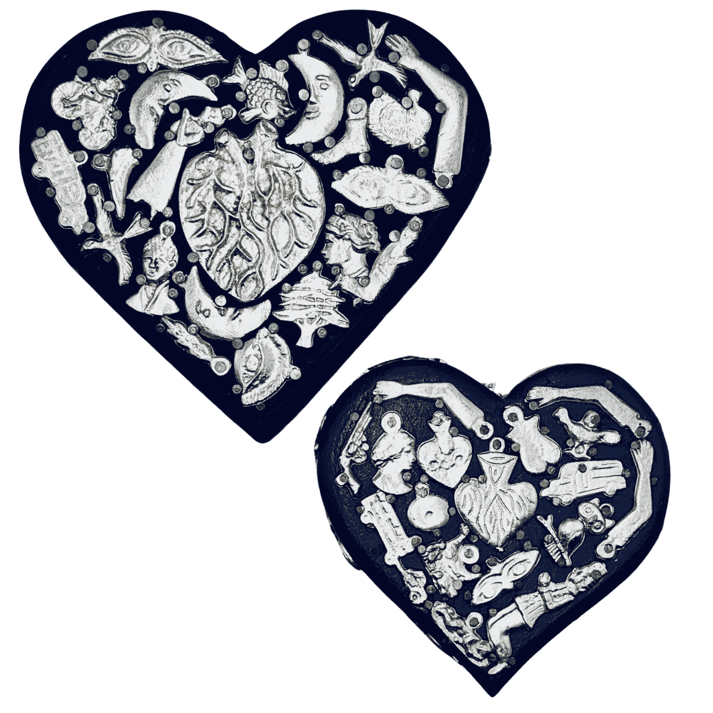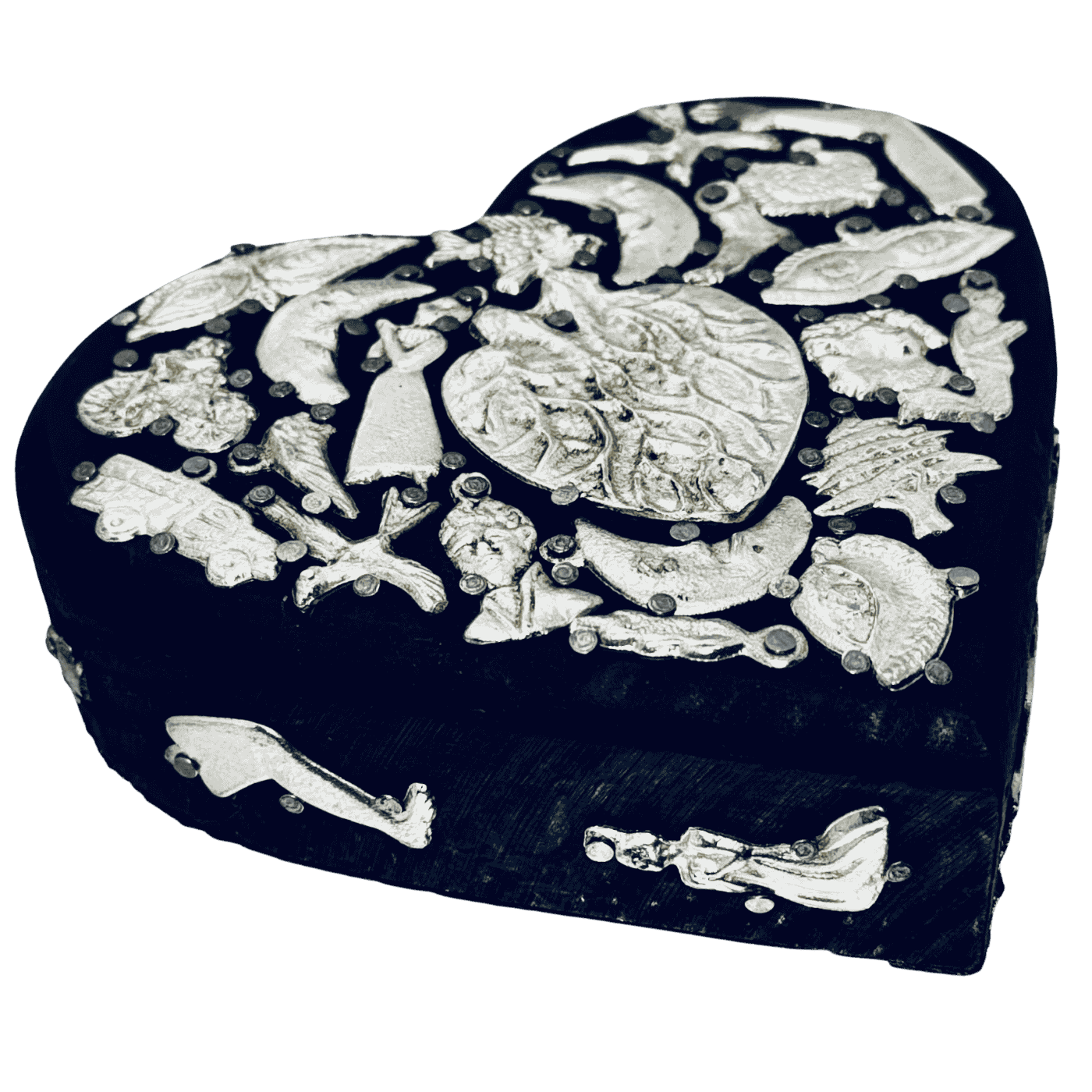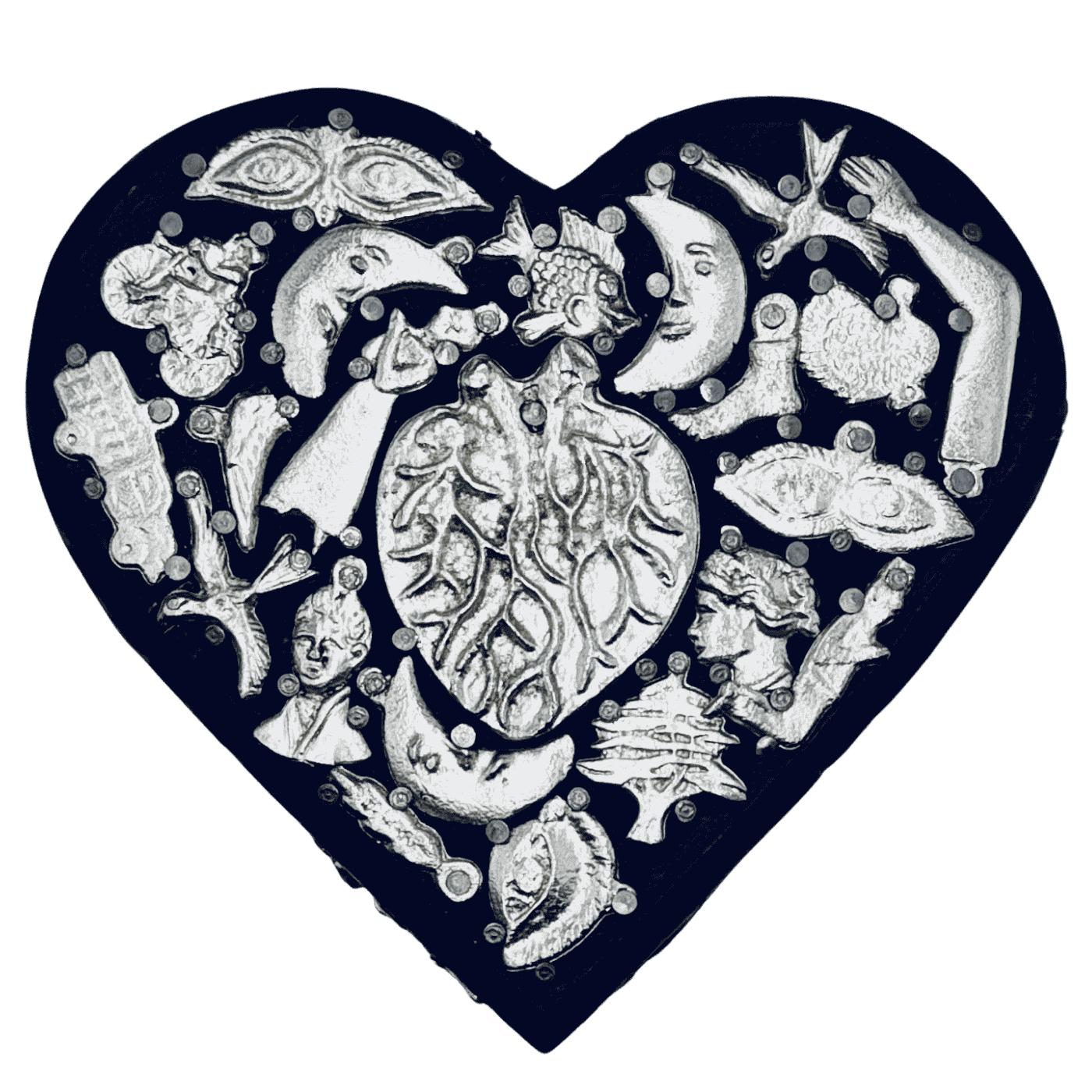 Cuore artigianale in legno scuro, intagliato e decorato a mano. Impreziosito da milagros in metallo fissati singolarmente con chiodini, secondo la tradizione degli ex-voto.