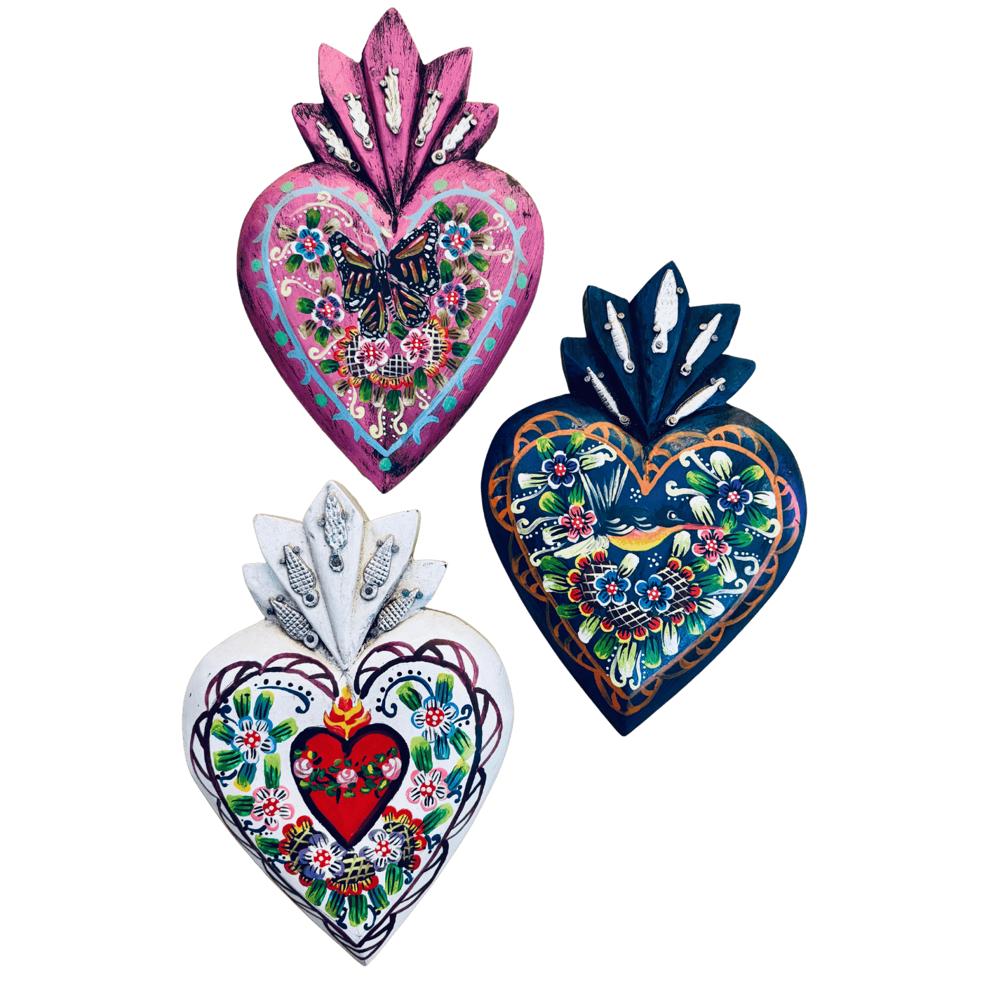 Si tratta di un cuore sagomato realizzato in legno, lavorato artigianalmente e spesso levigato ma non perfettamente uniforme, a testimonianza della produzione manuale tipica della regione di Oaxaca.