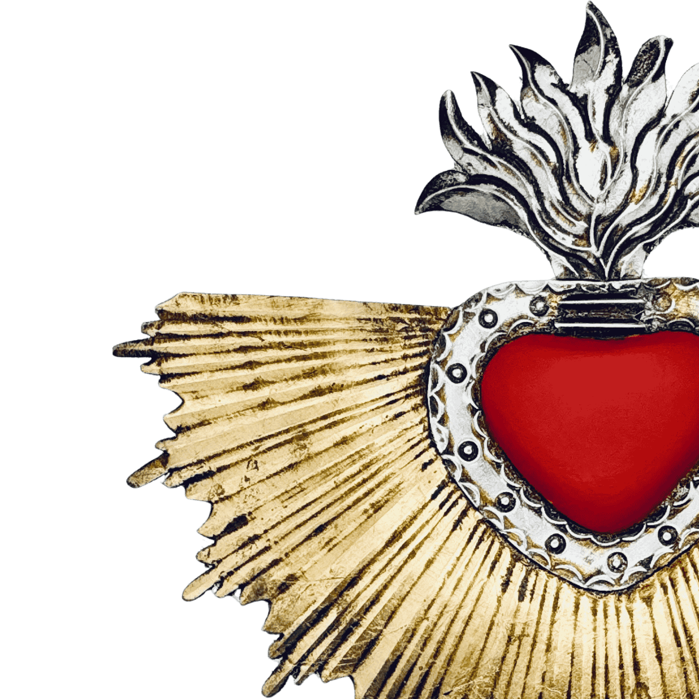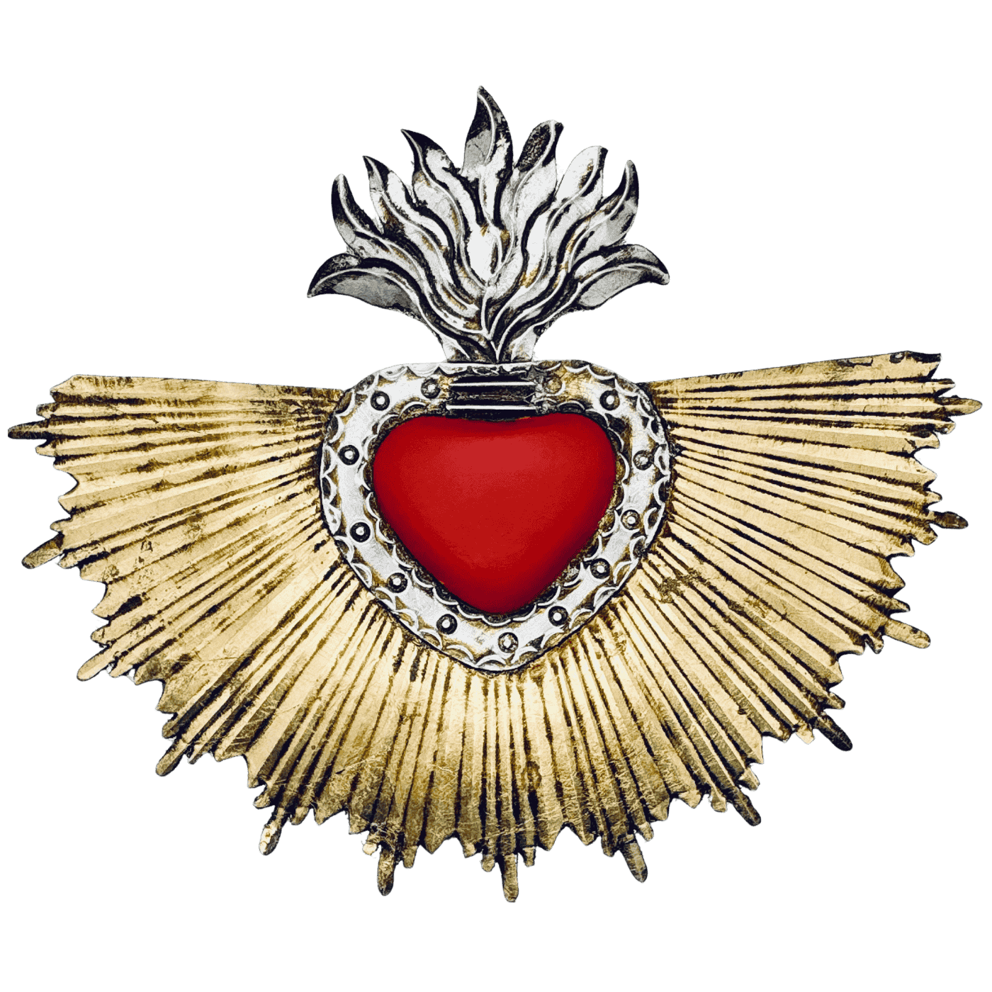 Cuore con raggi di luce dorato e cuore rosso, realizzato artigianalmente in latta e decorato a freddo.