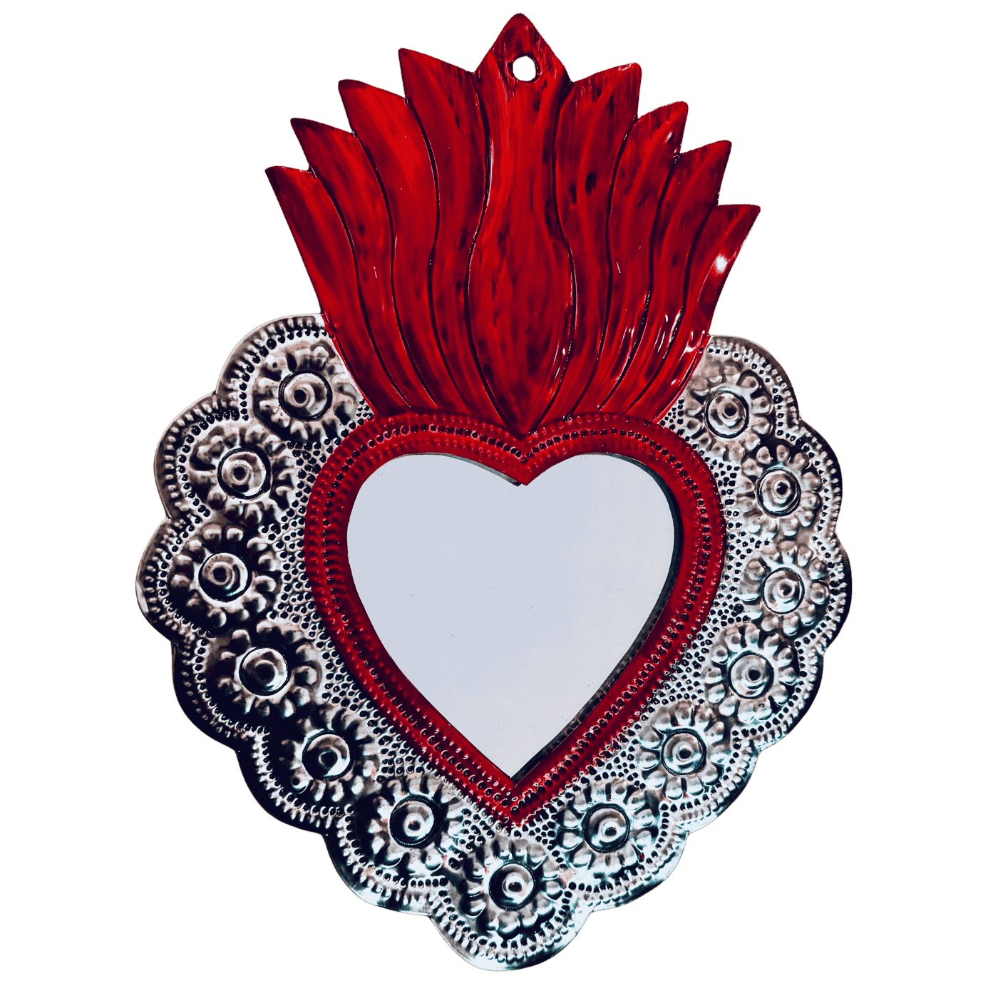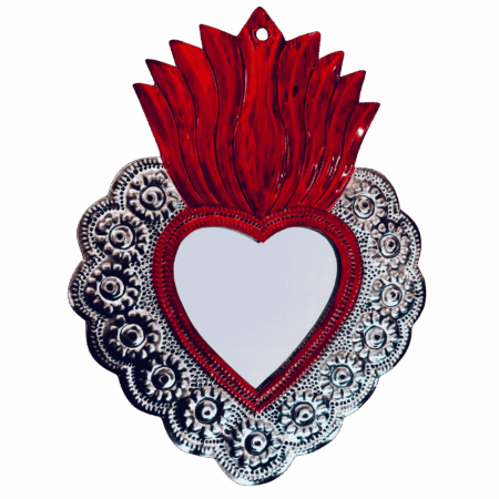 Si tratta di un cuore stilizzato realizzato in lamina di metallo (latta) argentata, spesso lavorata a mano con leggere martellature o incisioni che creano riflessi irregolari e vivi. La superficie metallica, lucida ma non perfettamente uniforme, conferisce all’oggetto un aspetto autentico e artigianale.