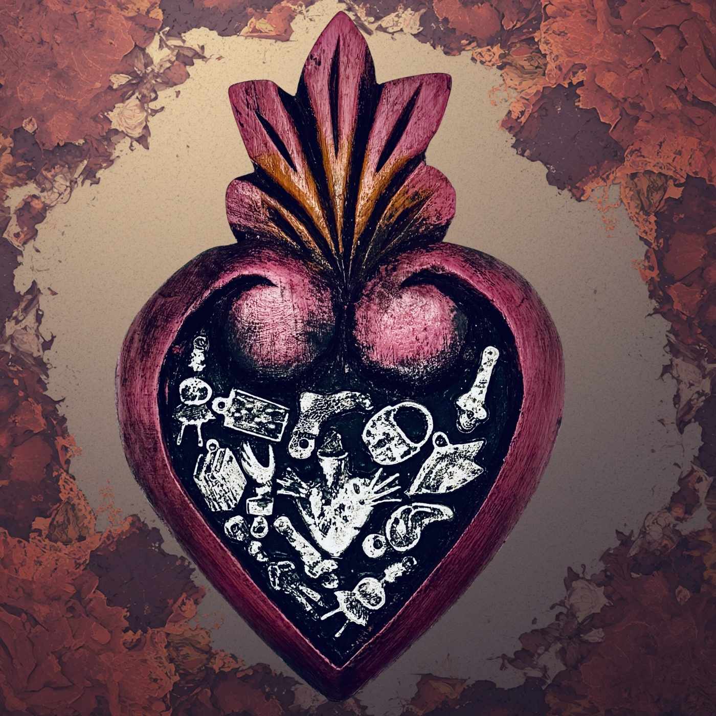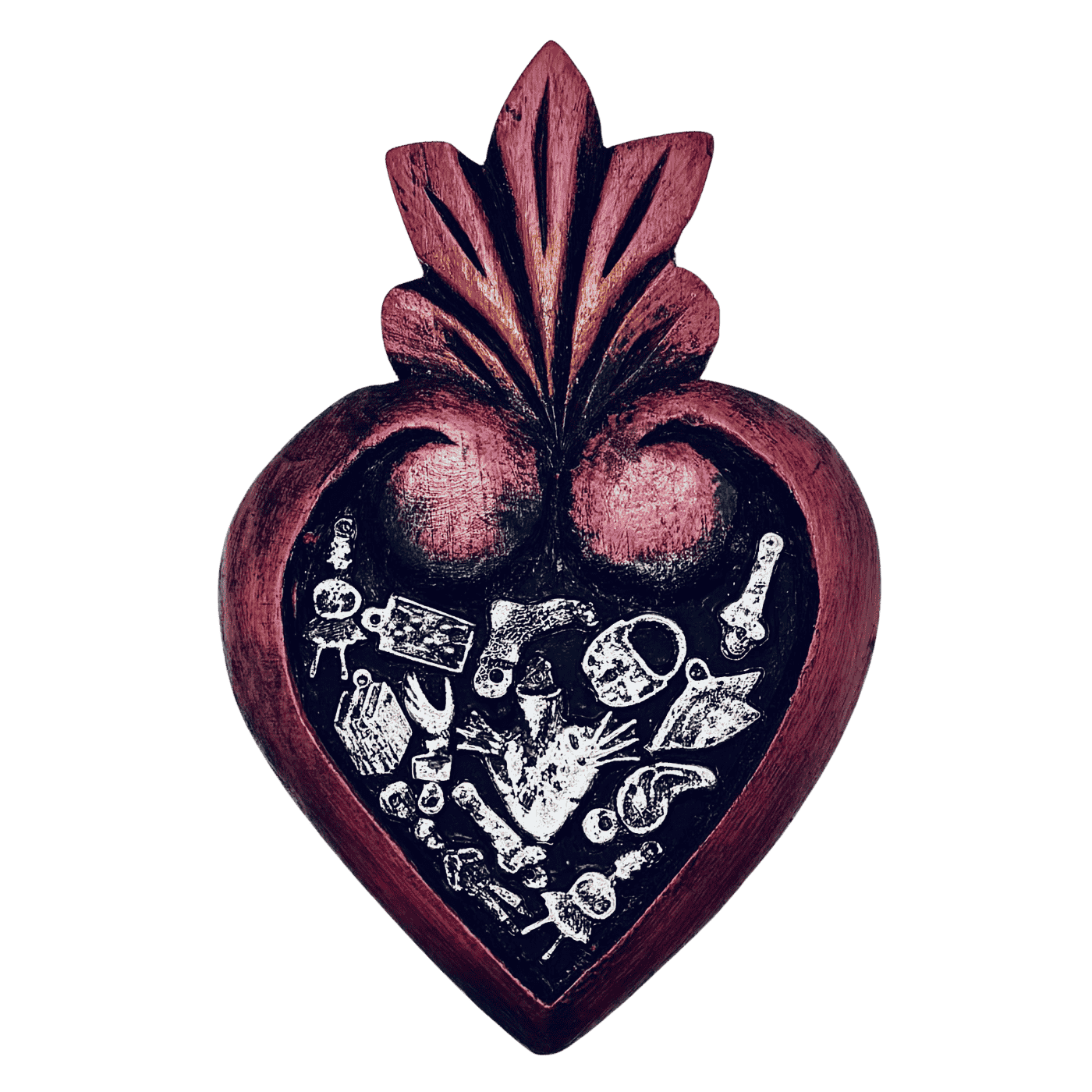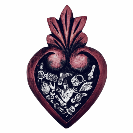 Cuore artigianale in legno, ispirato alla tradizione di Tocuaro (Michoacán, Messico). Intagliato, dipinto e rifinito a mano, presenta applicazioni in metallo milagros ed ex-voto, simboli di devozione, protezione e gratitudine. Ogni pezzo è unico, con leggere variazioni che ne attestano l’autenticità e il lavoro manuale.