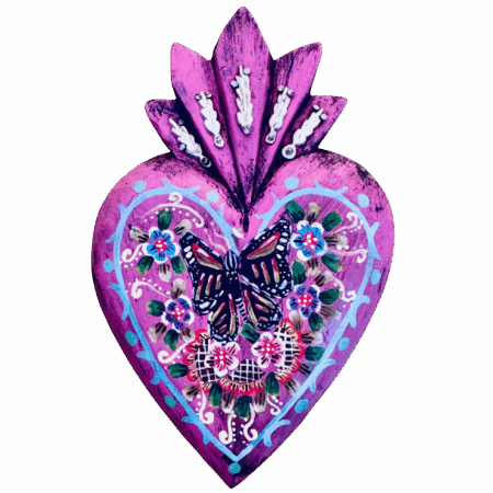 Nella parte superiore del cuore è presente la fiamma, simbolo del cuore sacro, che in questo caso è arricchita da milagros: