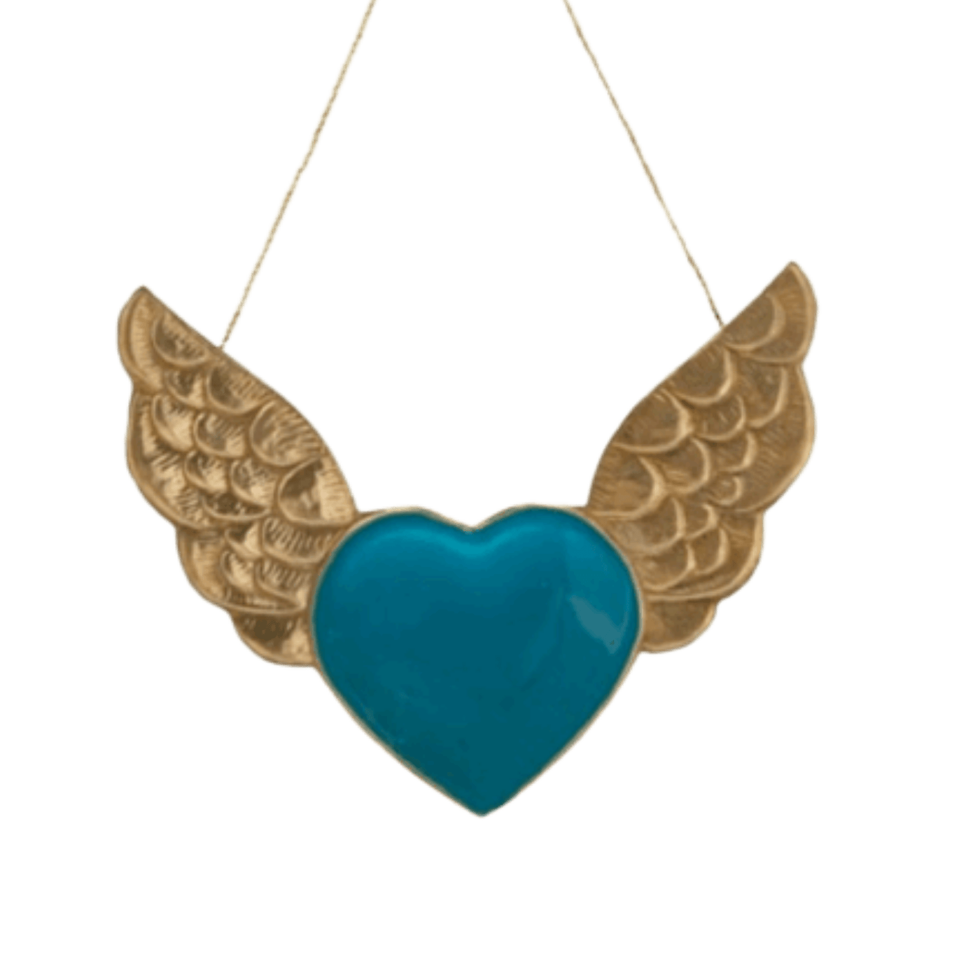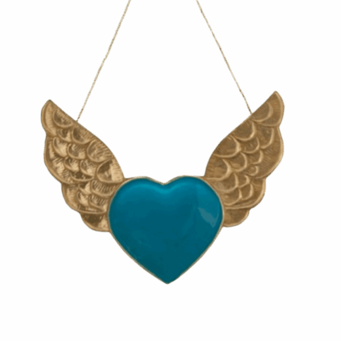 Cuore ex-voto alato smaltato turchese. Decorazione artigianale simbolica e colorata, perfetta per pareti cariche di significato e spiritualità pop.