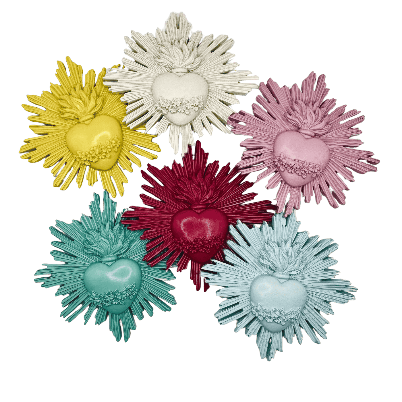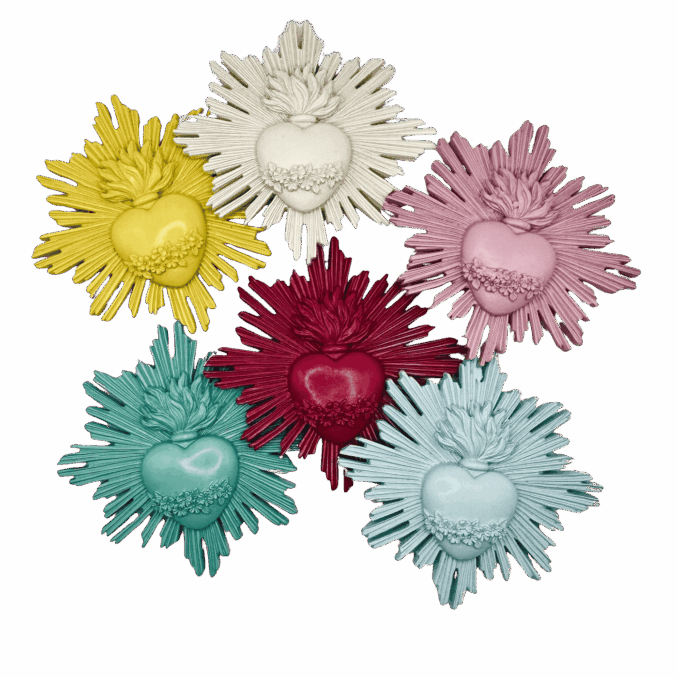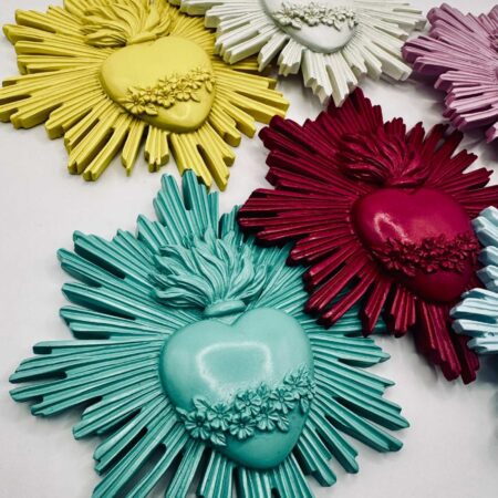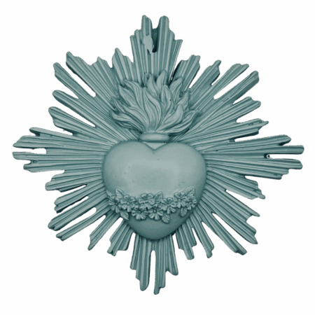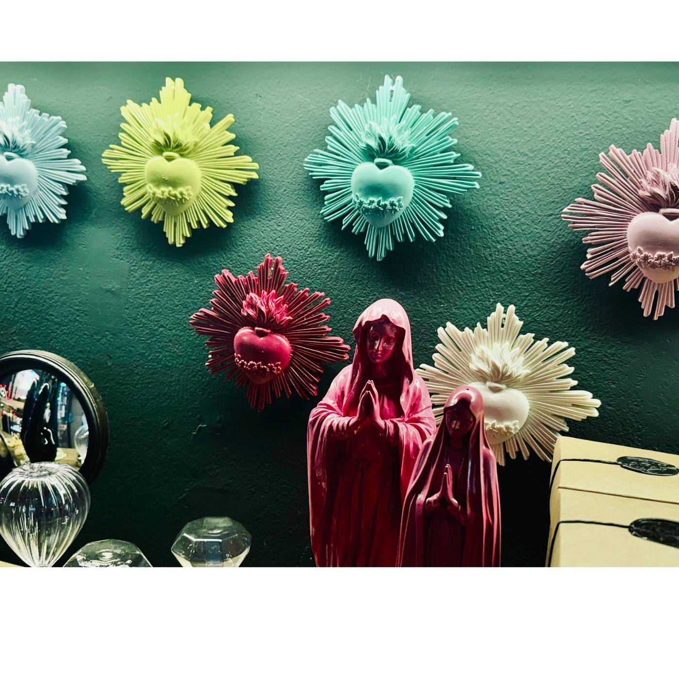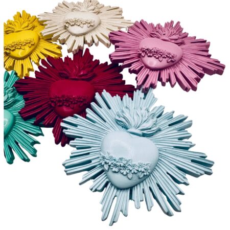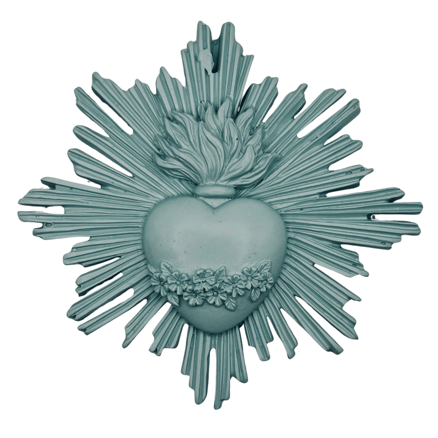 Ex-voto in resina celeste con raggi decorativi. Un oggetto da parete originale che porta un’aura di pace e spiritualità con un’estetica pop contemporanea. Ideale per angoli meditativi o creativi.