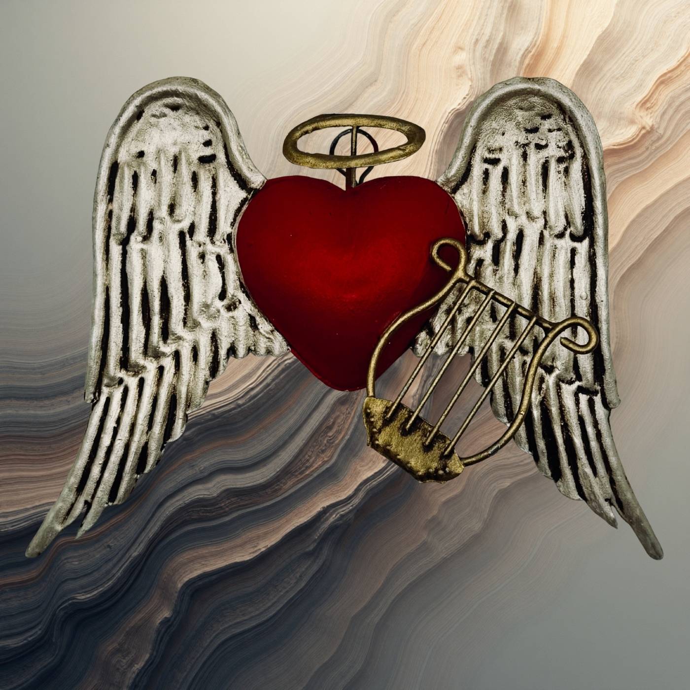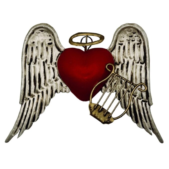Ex voto messicano in ferro – Cuore alato con lira. Dipinto a mano, evoca ispirazione, musica e protezione.