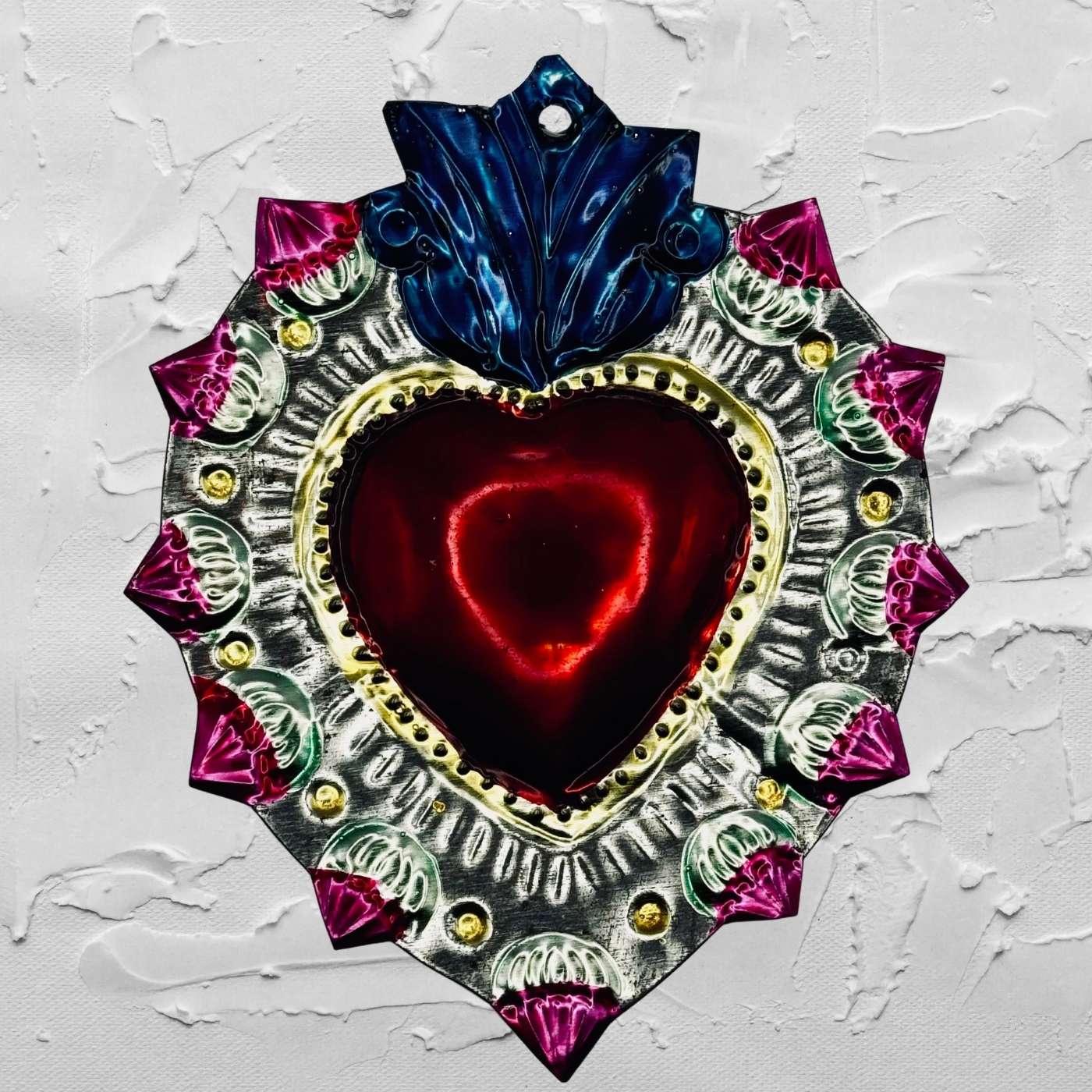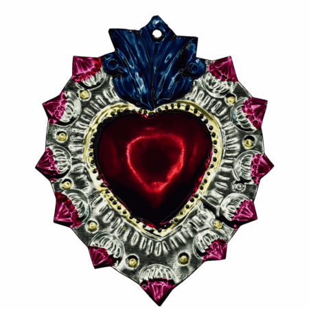 Ex voto messicano in latta con cuore rosso centrale. Realizzato a mano, è un tributo alla devozione e alla tradizione spirituale popolare latinoamericana.