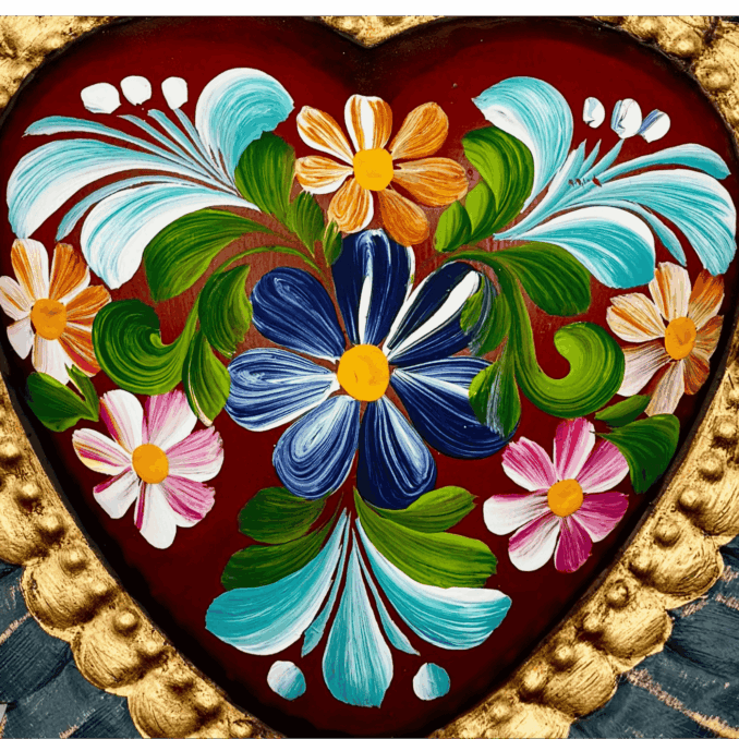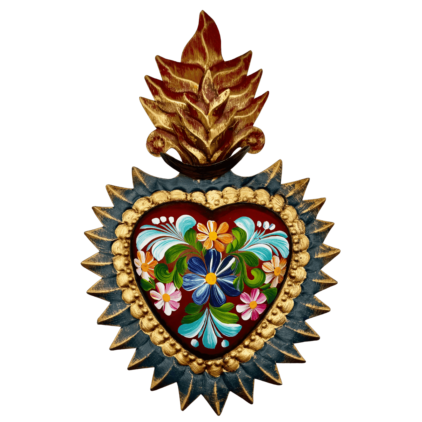 Ex voto messicano con motivo floreale – dipinto a mano. Ricco di simbolismo e colore, è ideale per collezionisti o per decorazioni in stile folk spirituale.