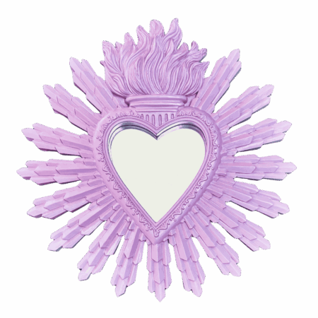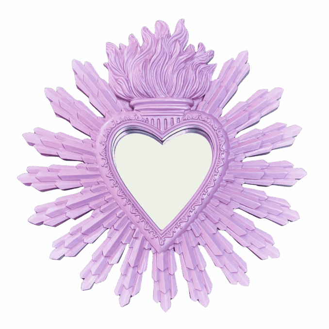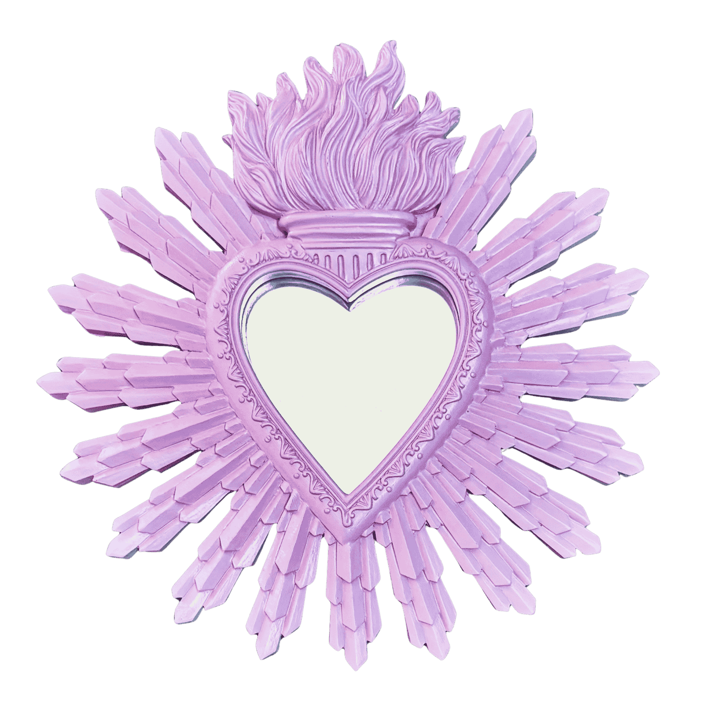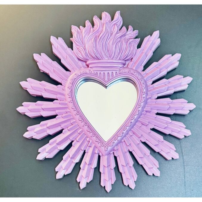 Specchio ex-voto a cuore con raggiera in resina rosa. Un mix tra spirituale e romantico, ideale per camere, corridoi o pareti creative. Oggetto decorativo e concettuale.