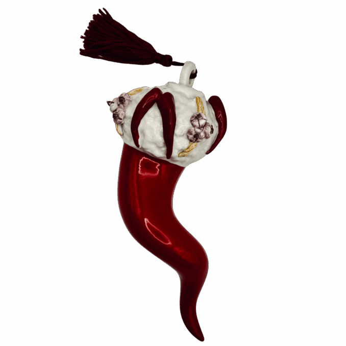 Corno con aglio e peperoncino 15 cm: triplo portafortuna tradizionale in porcellana di Capodimonte. Un mix simbolico per protezione e abbondanza.