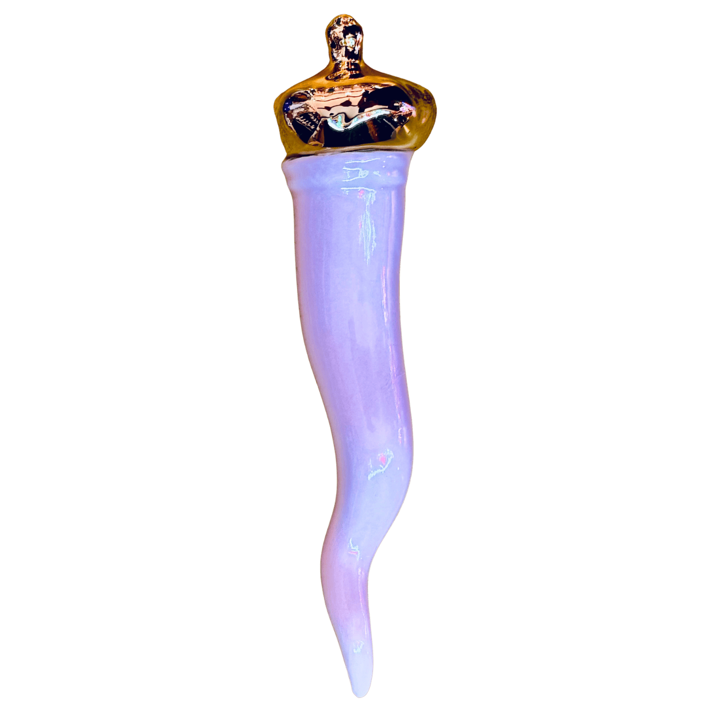 Piccolo corno decorativo in porcellana color rosa con punte dorate dipinte a mano. Simbolo classico di protezione e fortuna reinterpretato con gusto moderno e vivace. Ideale per mensole, scrivanie e tavolini come oggetto regalo o portafortuna.