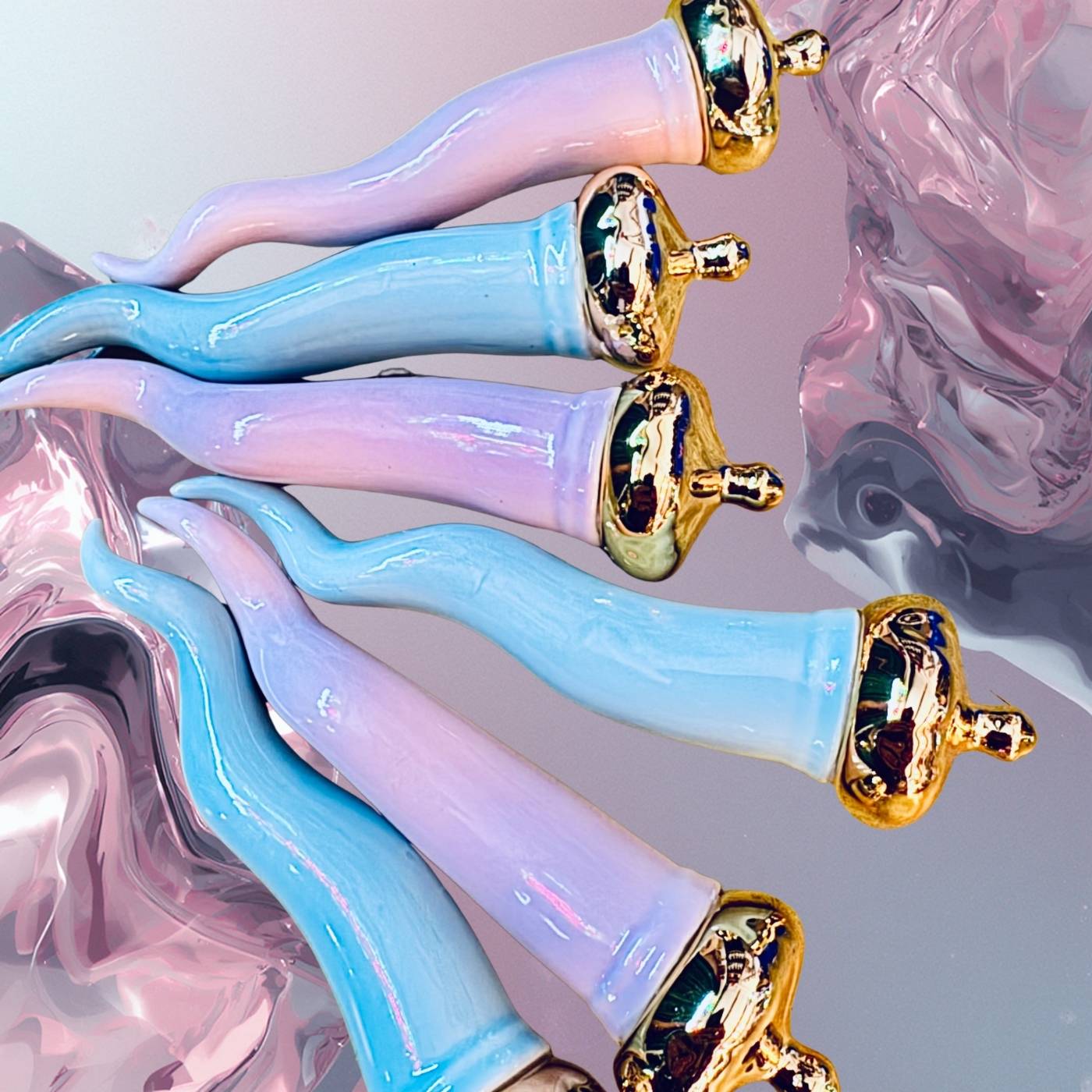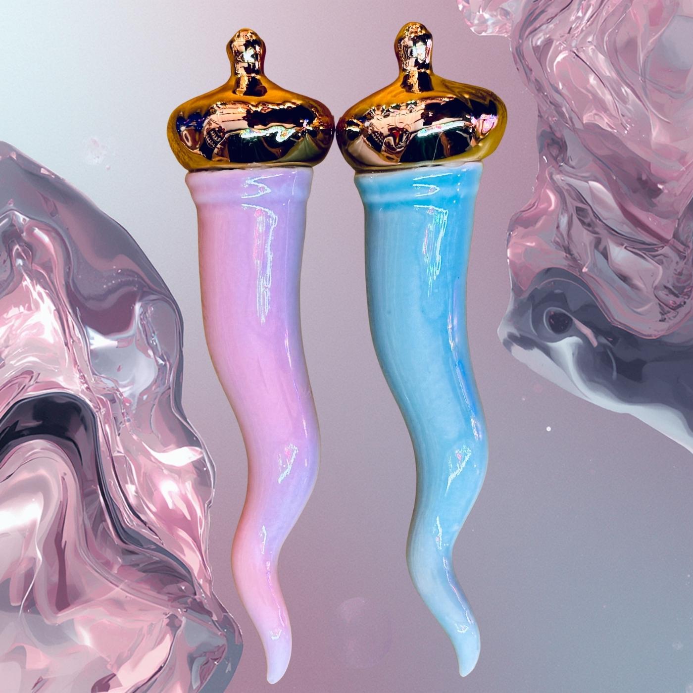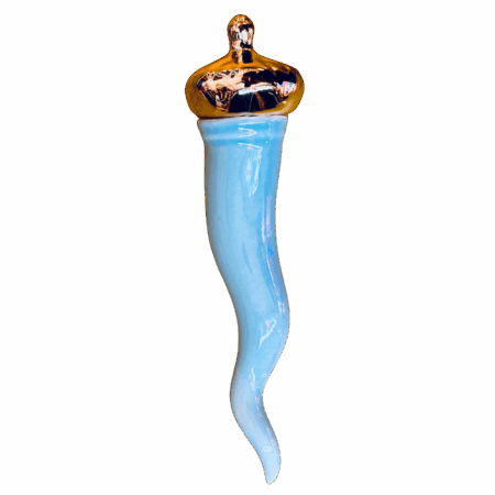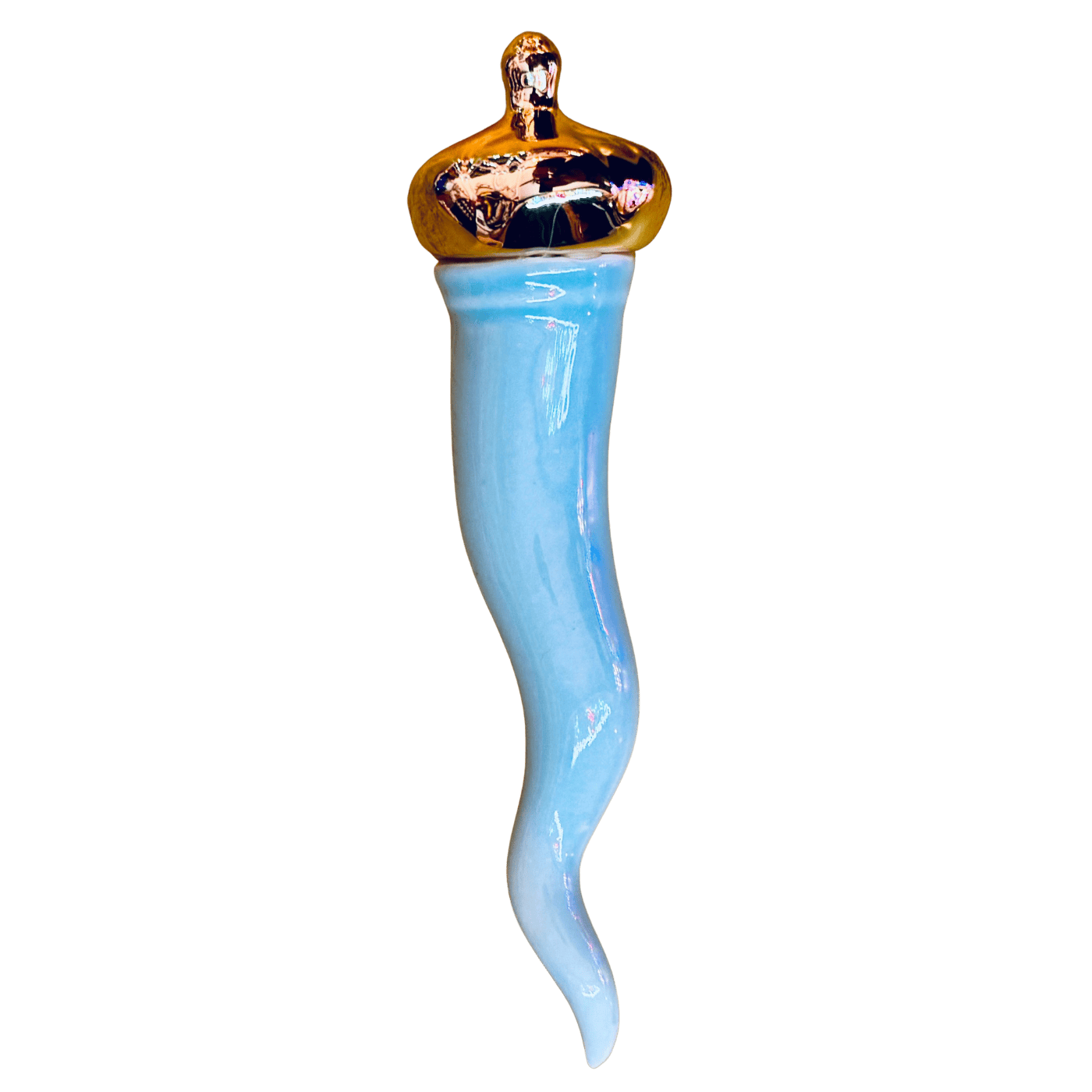 Piccolo corno decorativo in porcellana color Tiffany con punte dorate dipinte a mano. Simbolo classico di protezione e fortuna reinterpretato con gusto moderno e vivace. Ideale per mensole, scrivanie e tavolini come oggetto regalo o portafortuna.