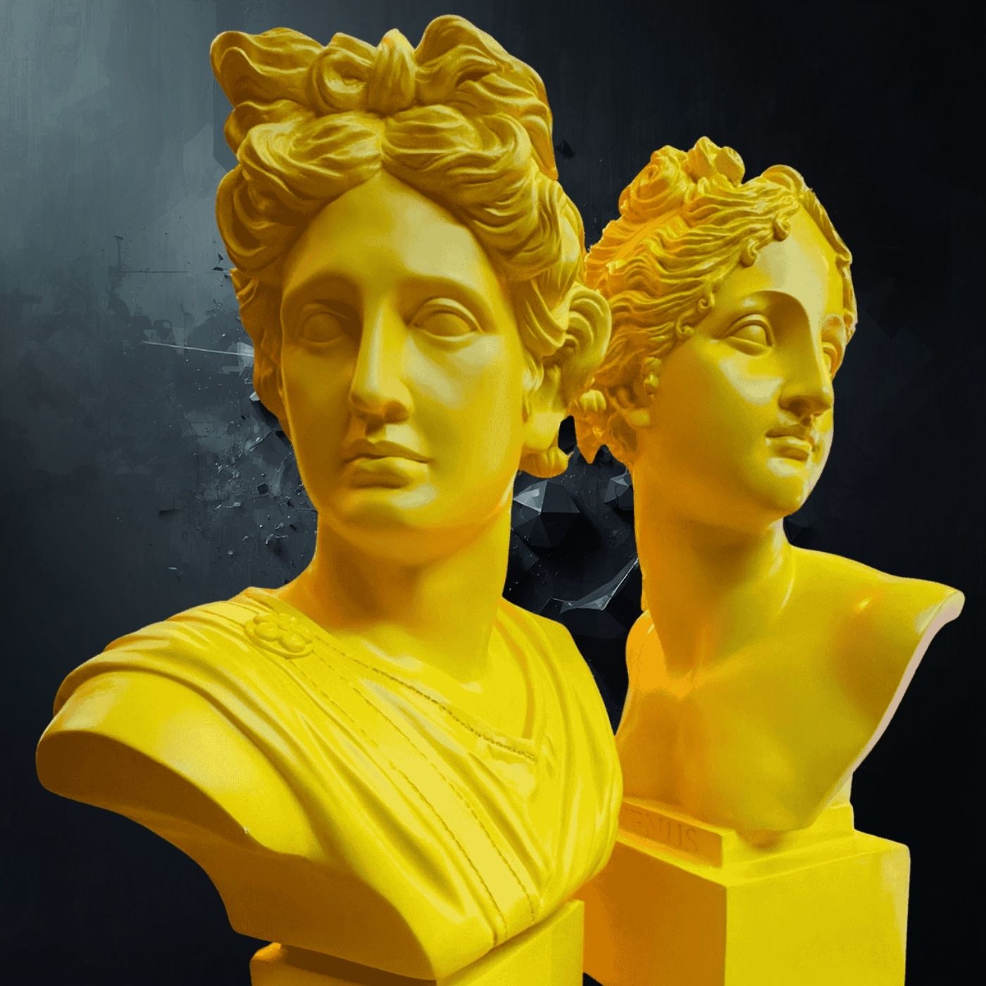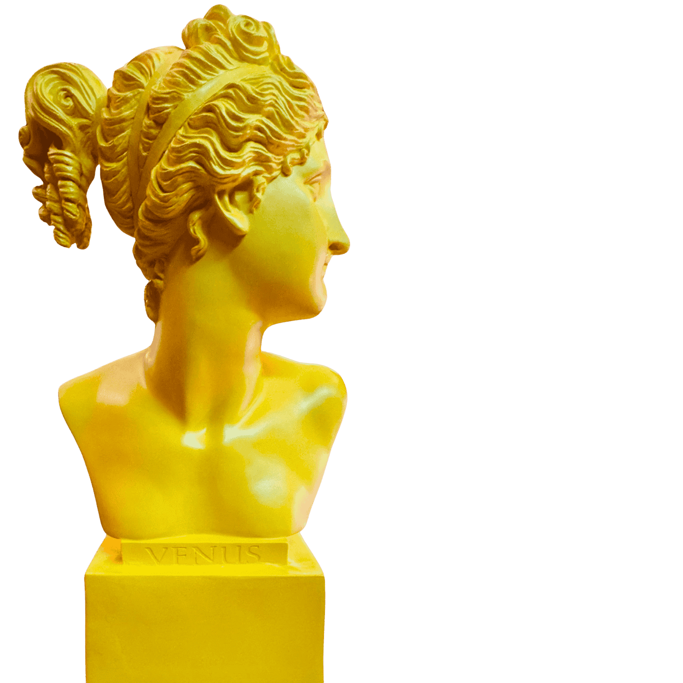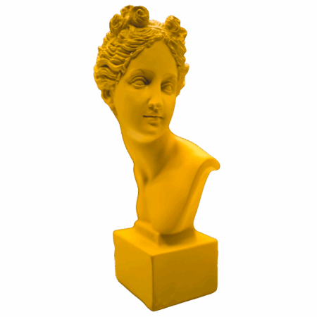 Busto classico di Venere in resina color giallo, altezza 53 cm. Una reinterpretazione audace e luminosa della bellezza classica. Oggetto decorativo da appoggio perfetto per ambienti artistici.