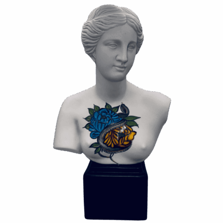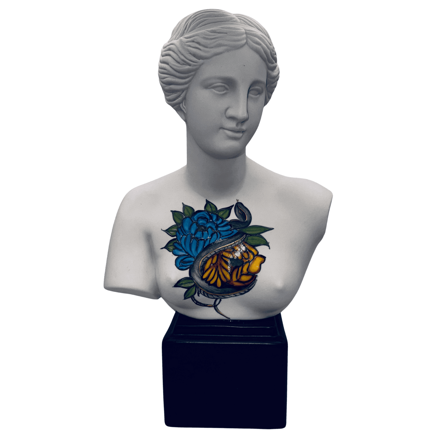 Busto Venere alto 30 cm Tattoo “Serpe”: intensità e trasformazione prendono forma in questo busto di Venere decorato con un tatuaggio a forma di serpente. Realizzato in porcellana di Capodimonte e dipinto a mano. Perfetto per collezionisti.