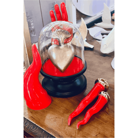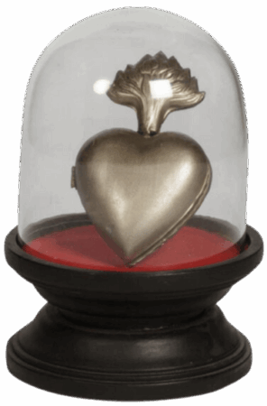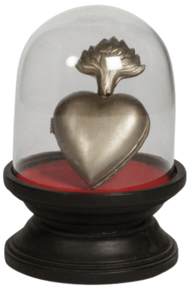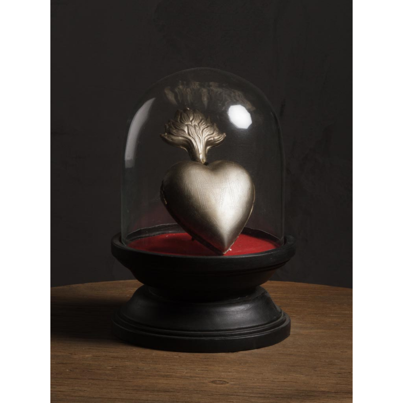 Campana in vetro con cuore ex-voto su velluto rosso. Un oggetto di forte presenza scenica e significato simbolico. Perfetto per interni dallo stile teatrale o spirituale.