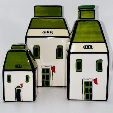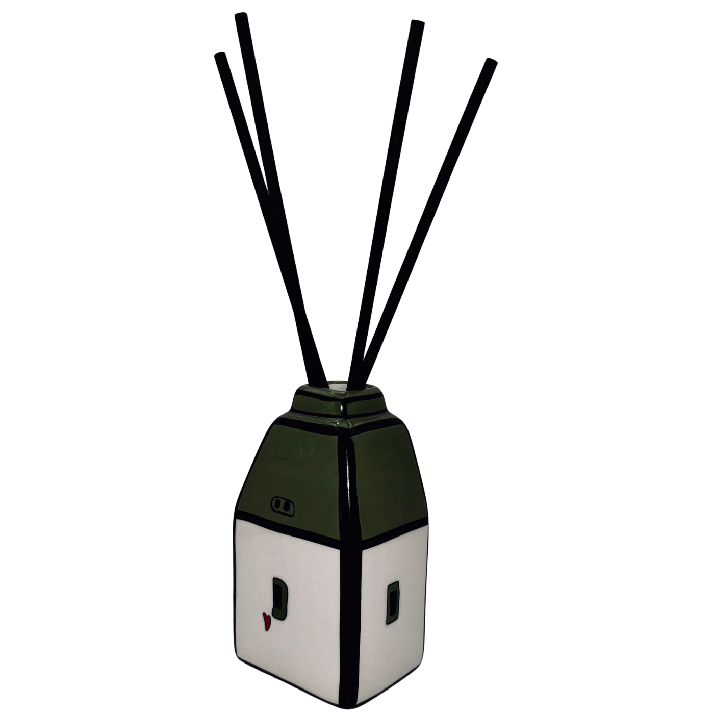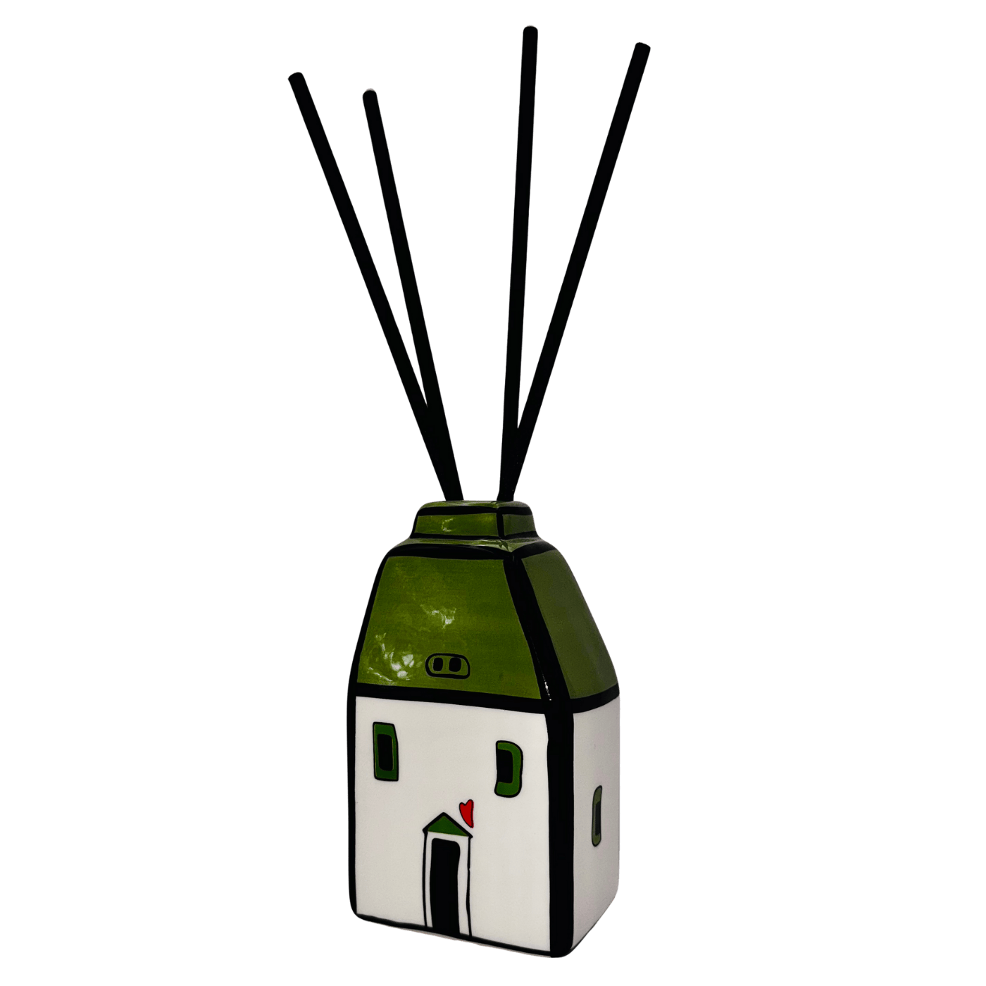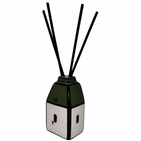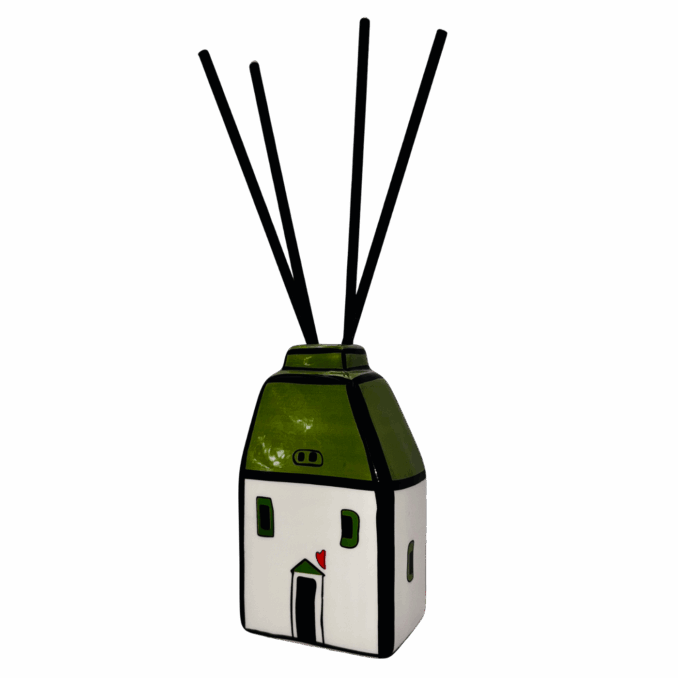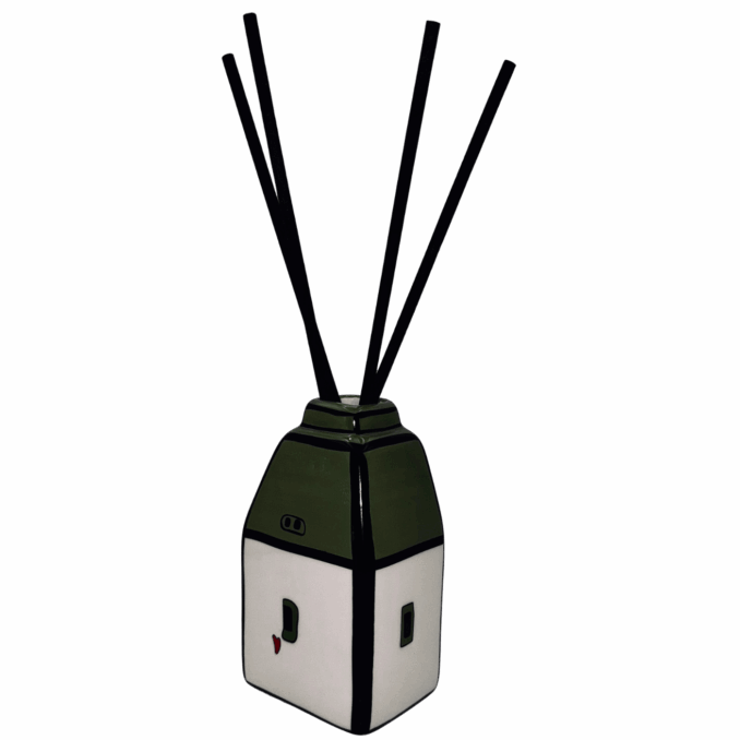 Casetta in ceramica verde con bastoncini per diffusione di profumo (essenza non inclusa). Simpatica, decorativa e funzionale, ideale per profumare ambienti piccoli con un tocco allegro.