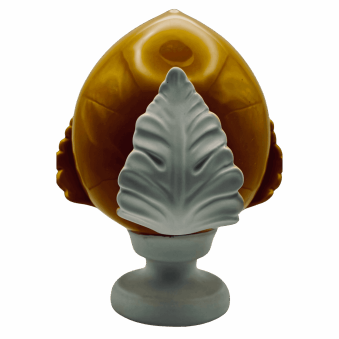 Pumo decorativo in ceramica con bocciolo color ambra e foglie bianche. Simbolo di buon auspicio, è perfetto come oggetto d’arredo su credenze, mensole o tavoli. Aggiunge calore e raffinatezza.
