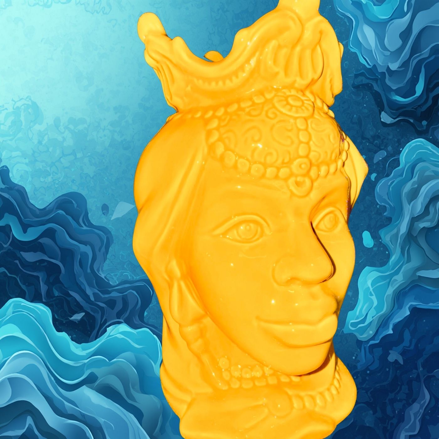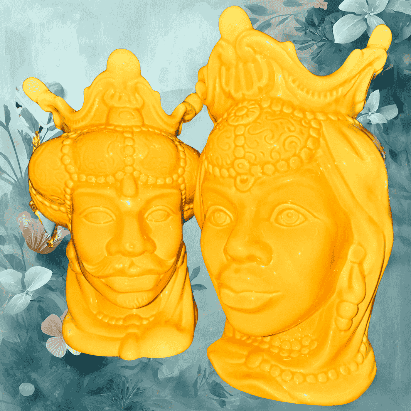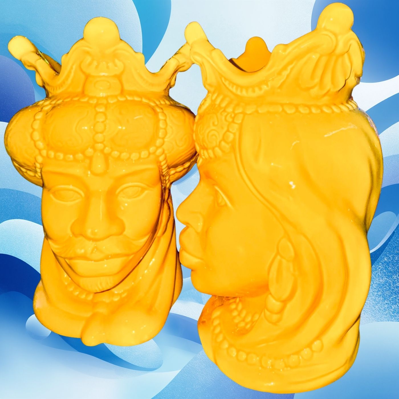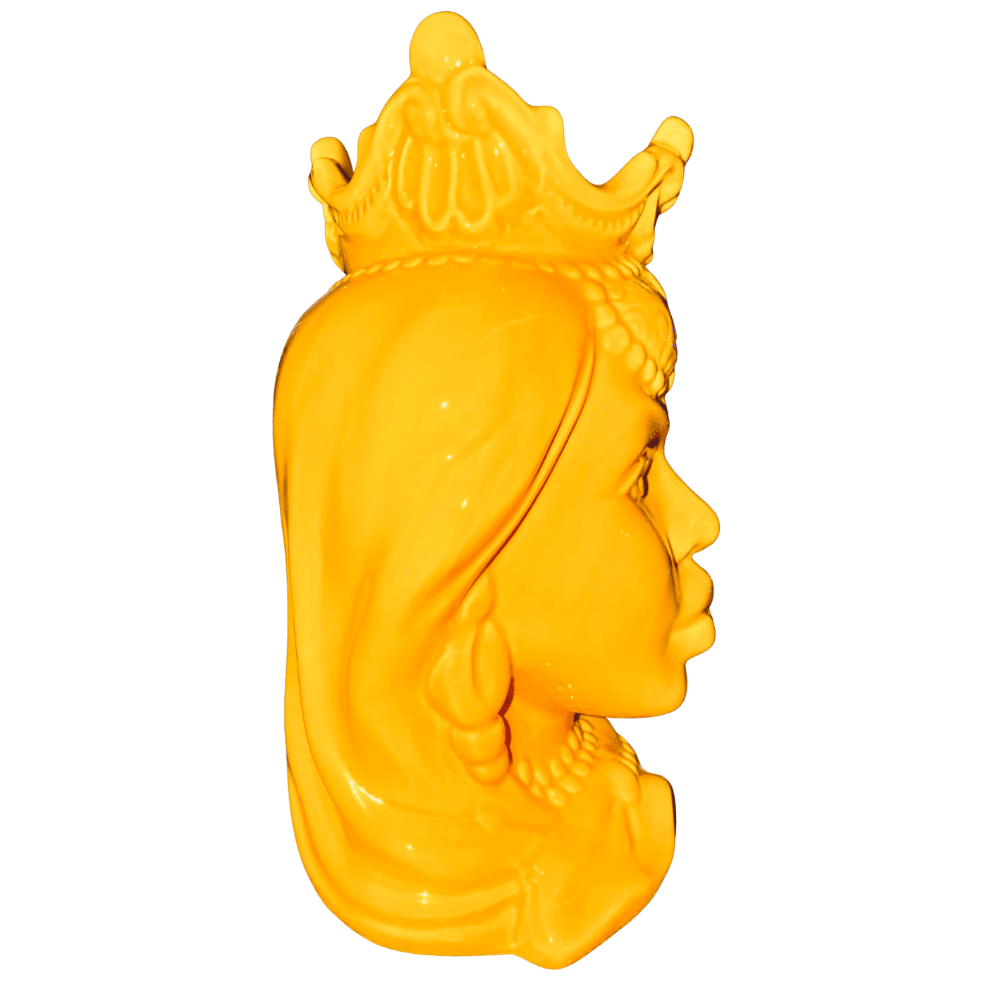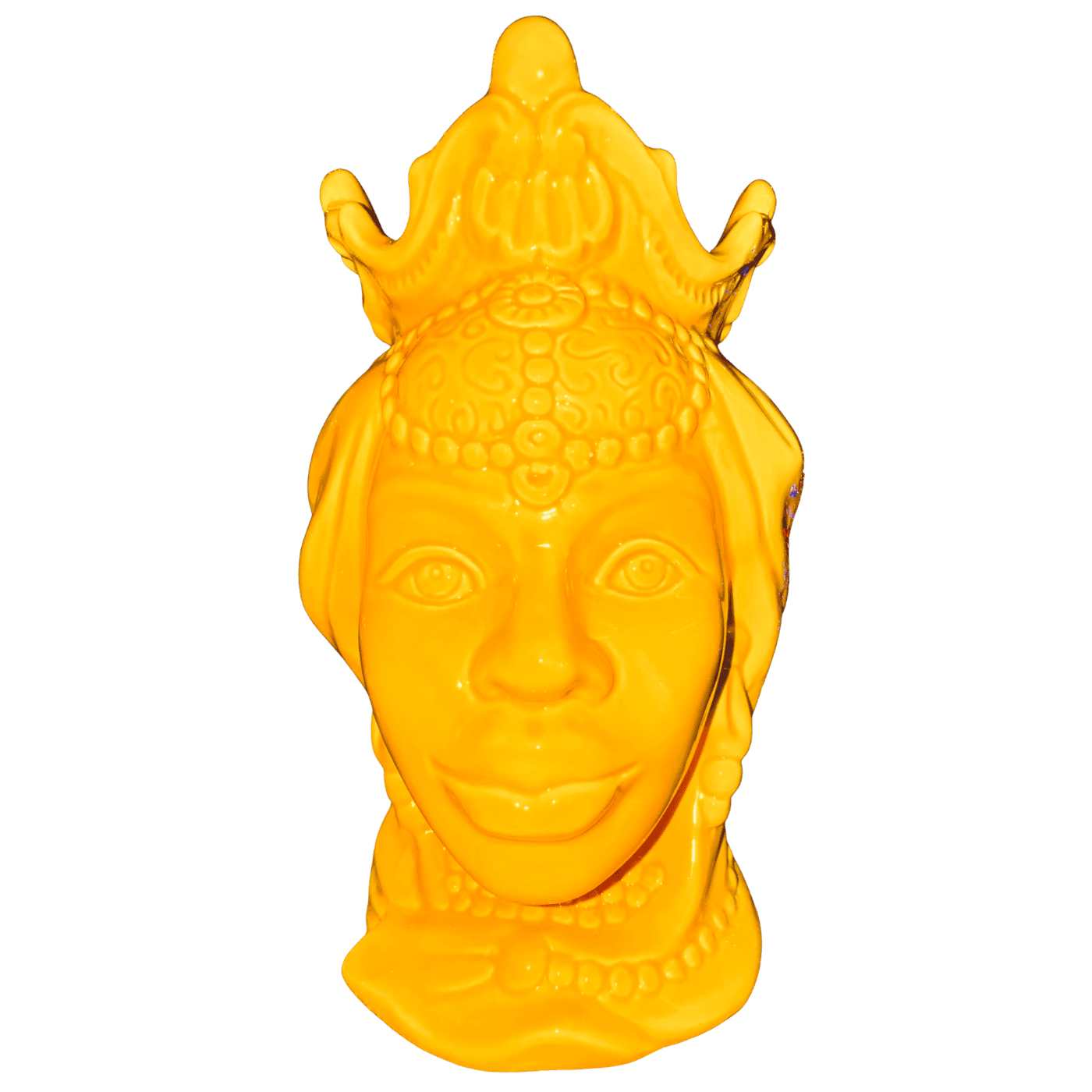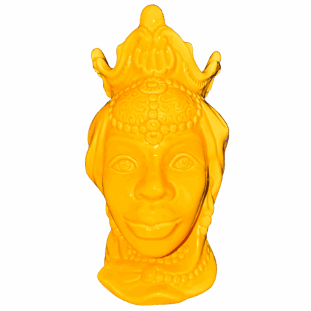 Splendido vaso decorativo “Testa di Moro” raffigurante la Regina, realizzato in ceramica e caratterizzato da un’intensa tonalità gialla che dona luce e vivacità all’ambiente. I dettagli finemente lavorati e le decorazioni ispirate alla tradizione siciliana rendono questo complemento d’arredo un elemento distintivo e di grande fascino.