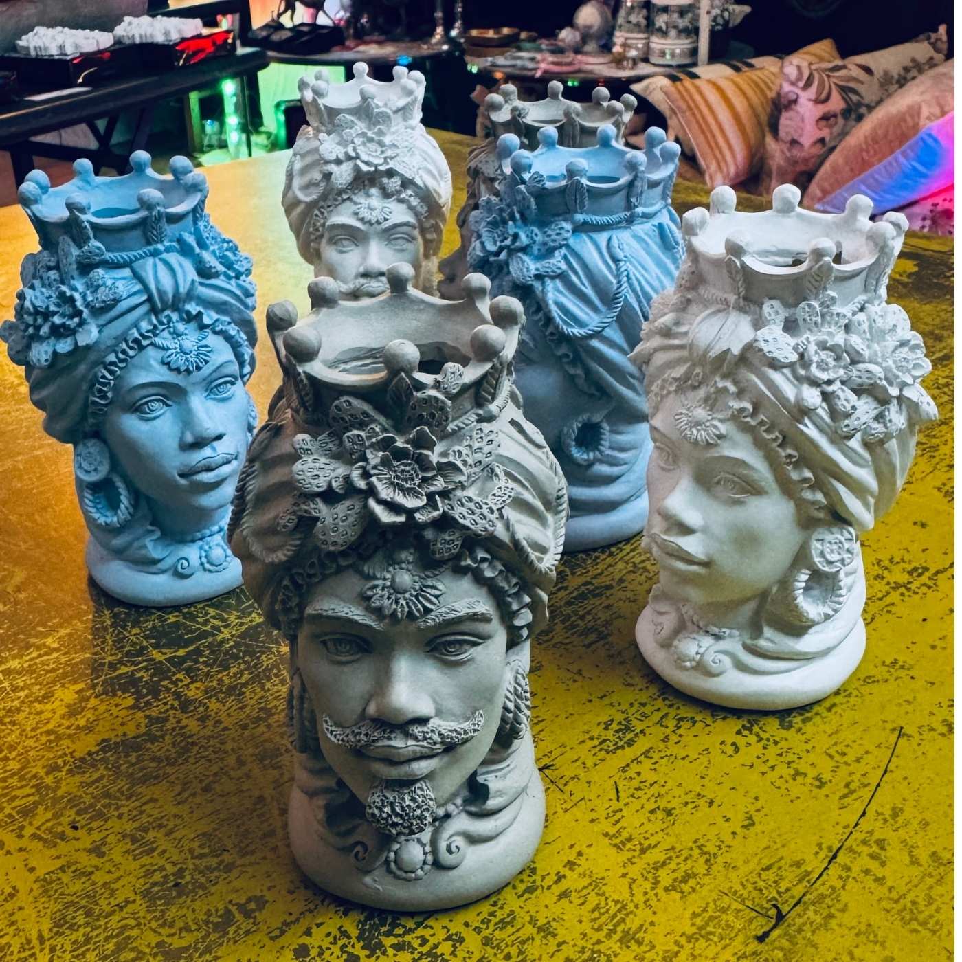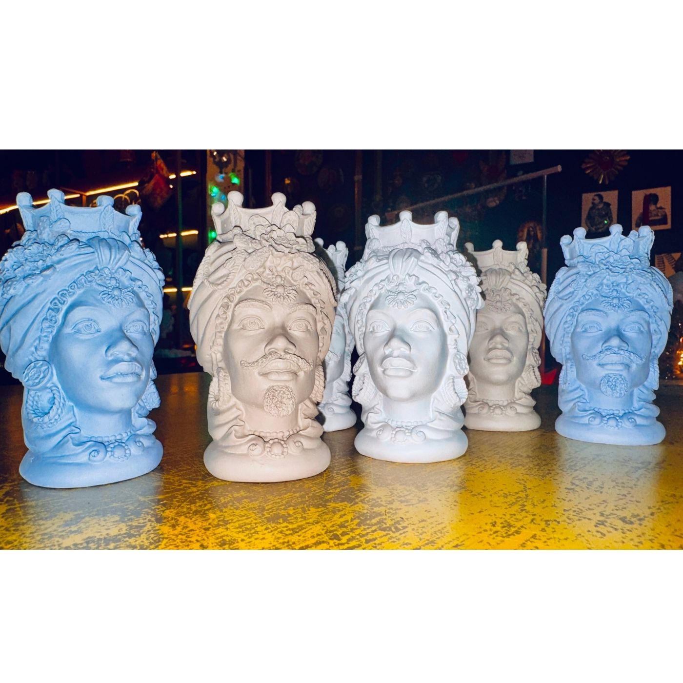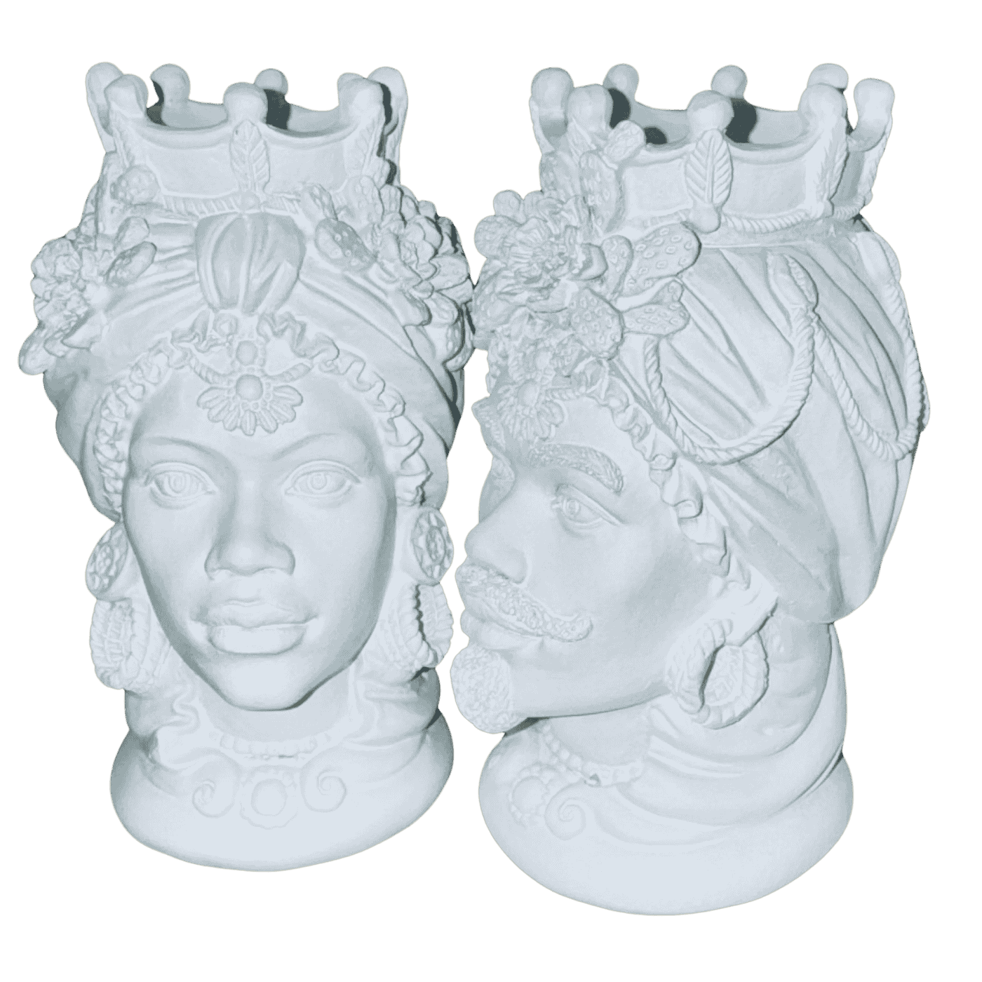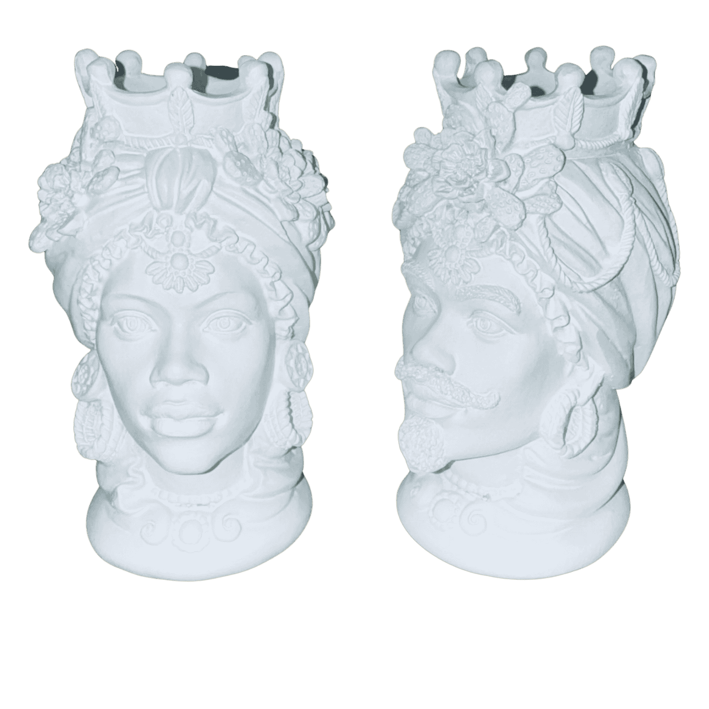 Coppia di teste di moro in resina bianca, 11 cm. Re e regina in versione mini, ideali come decoro da appoggio. Un classico rivisitato in formato compatto e moderno.