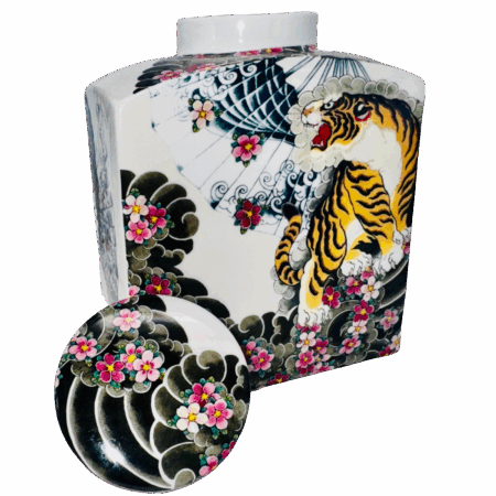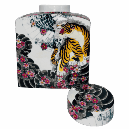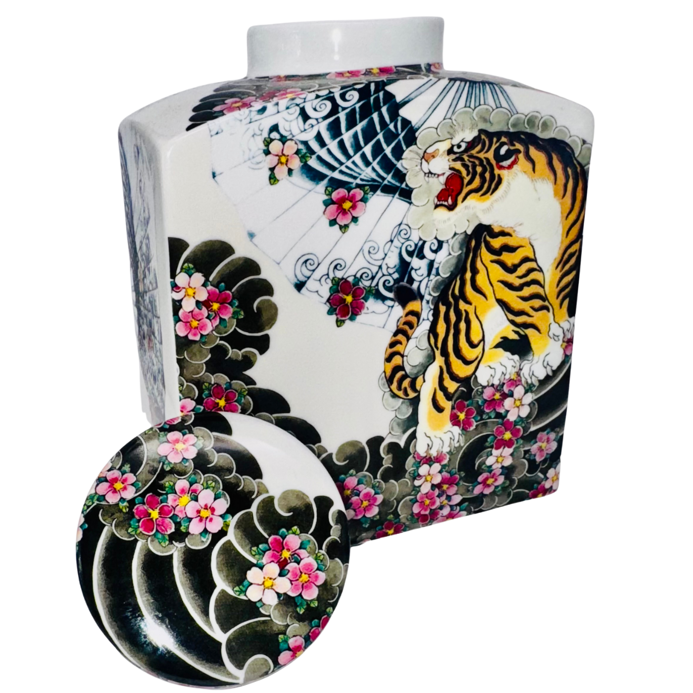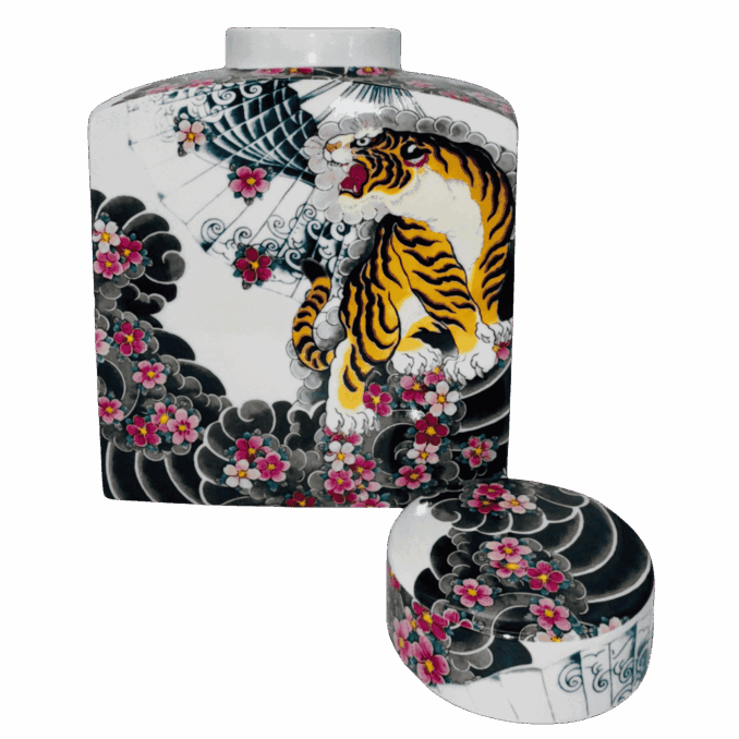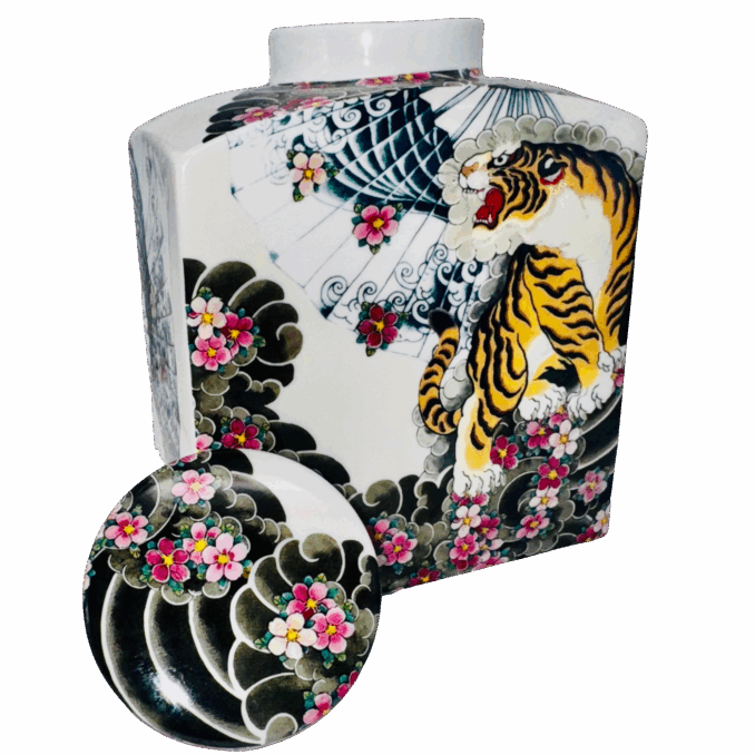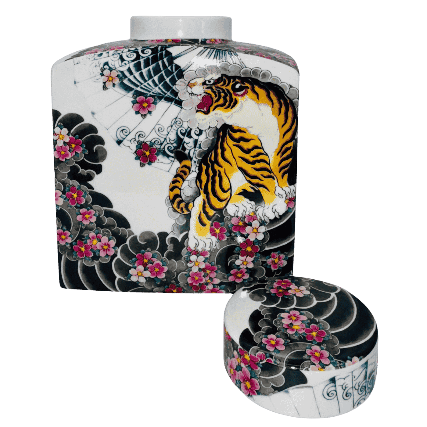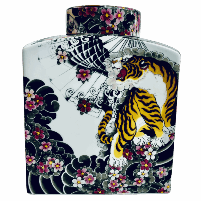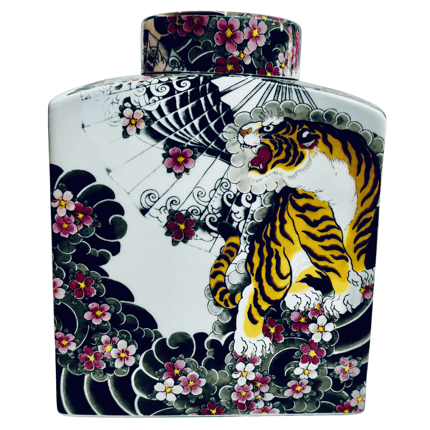 Realizzato in porcellana di alta qualità, questo diffusore rettangolare di grandi dimensioni (19×15×9 cm) presenta un audace motivo “Tattoo Age” con tigre, simbolo di forza ed energia. Il design, ispirato all’arte del tatuaggio, combina linee decise e dettagli grafici per un effetto visivo moderno e d’impatto.