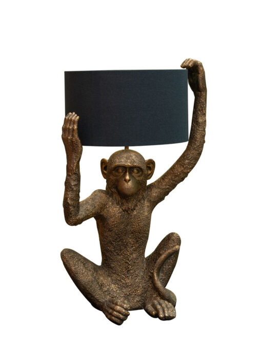 Lampada da tavolo con scimmia dorata in resina e paralume in lino. Una figura ironica e d’impatto, ideale per ambienti creativi e giocosi. Un oggetto decorativo che si fa notare.