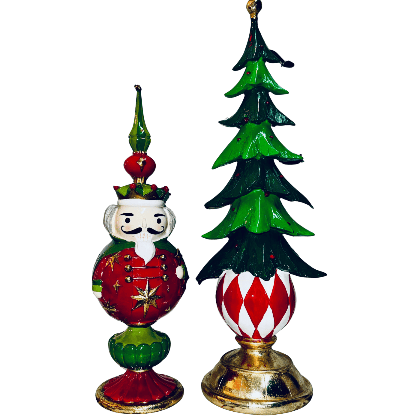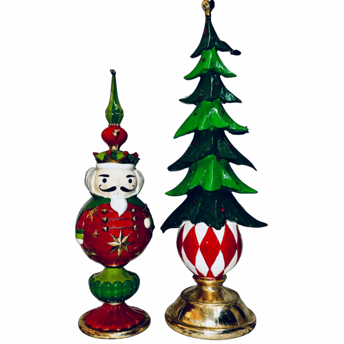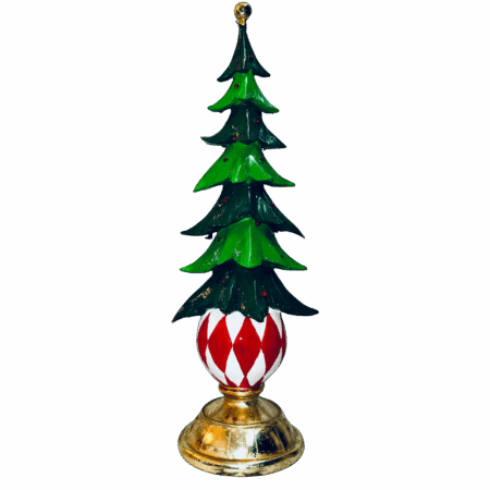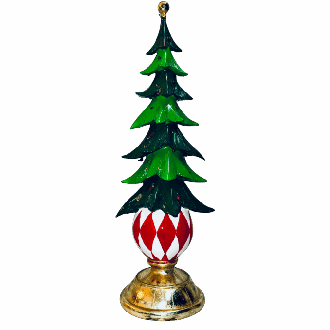 Un raffinato albero decorativo in resina, caratterizzato da un originale motivo a scacchi e poggiato su una palla ornamentale che ne esalta l’equilibrio e la raffinatezza.