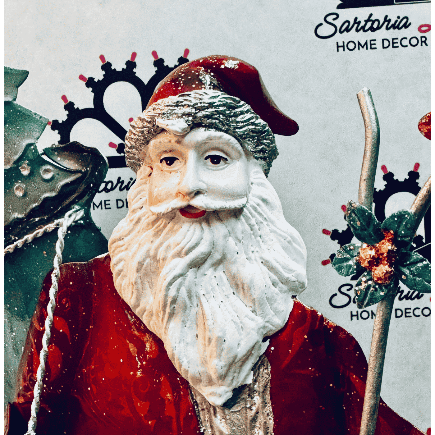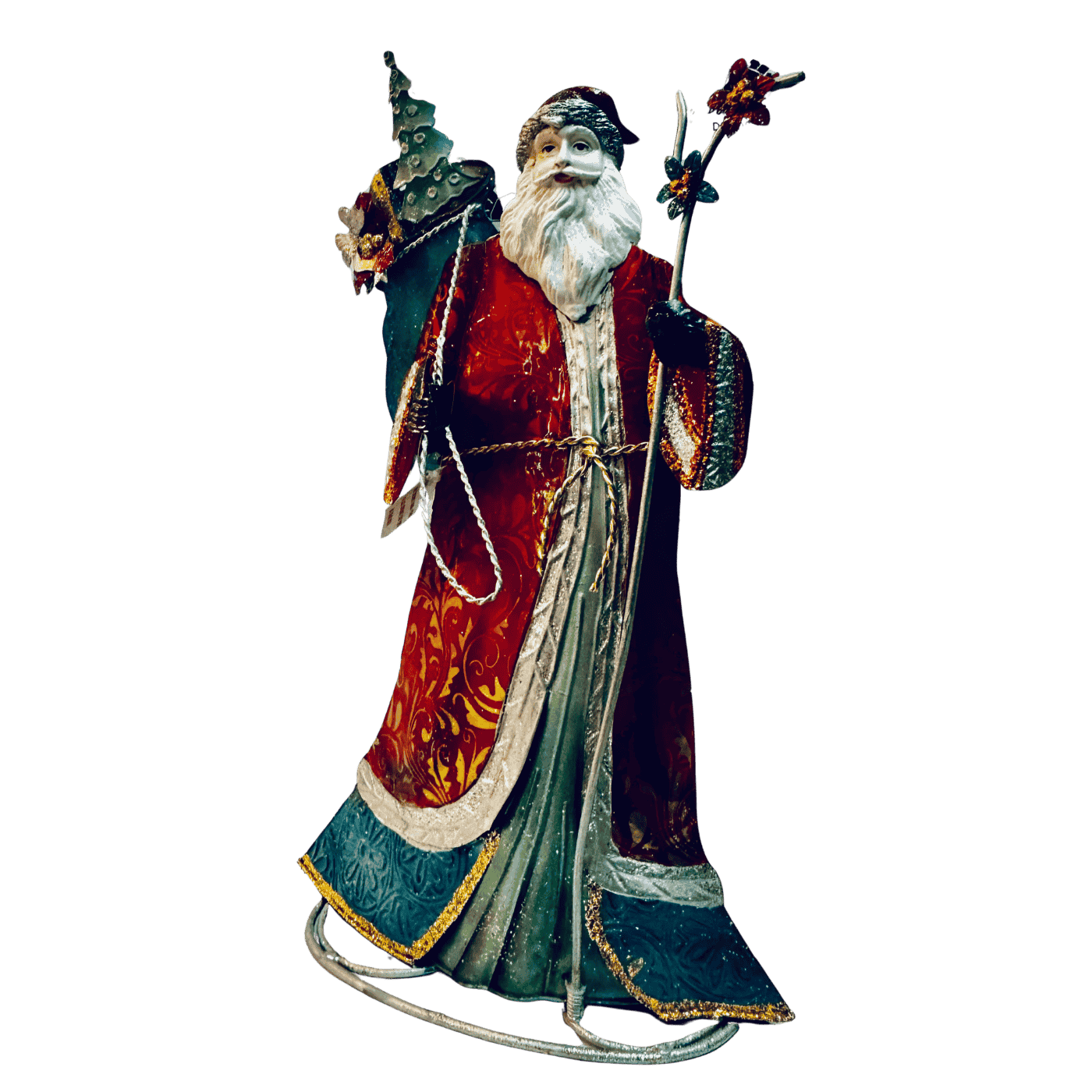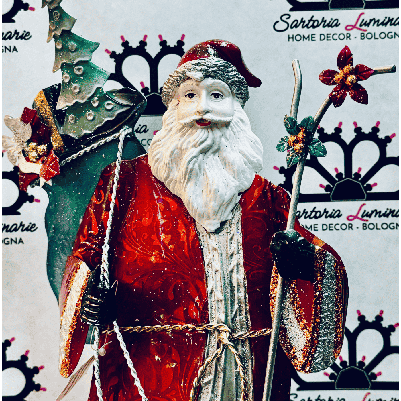 Elegante decorazione natalizia realizzata in latta dipinta a mano, con dettagli finemente colorati e glitterati che donano luminosità e fascino. La figura, alta circa 40 cm, rappresenta Babbo Natale in posizione eretta, perfetta come oggetto d’appoggio su tavoli, mensole, caminetti o vetrine. Un complemento ideale per arricchire l’atmosfera delle feste natalizie con un tocco vintage e artigianale.