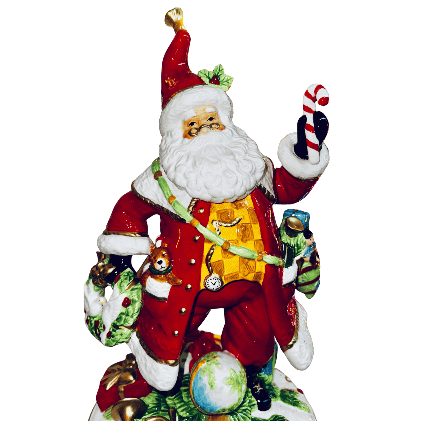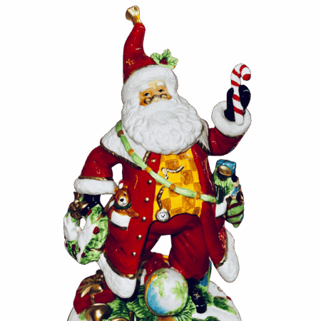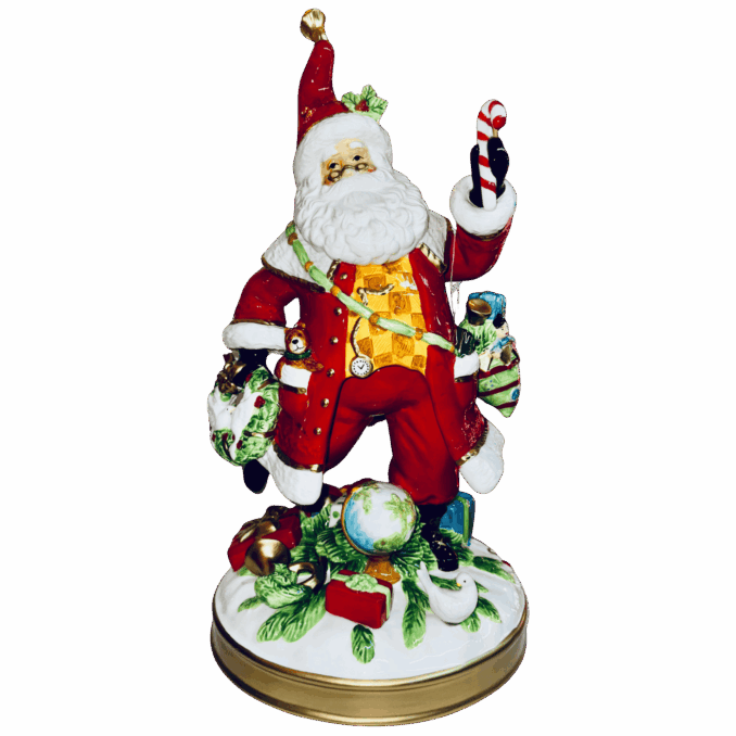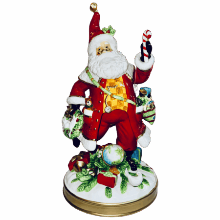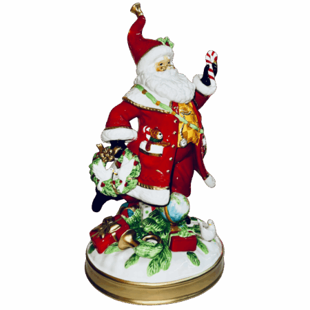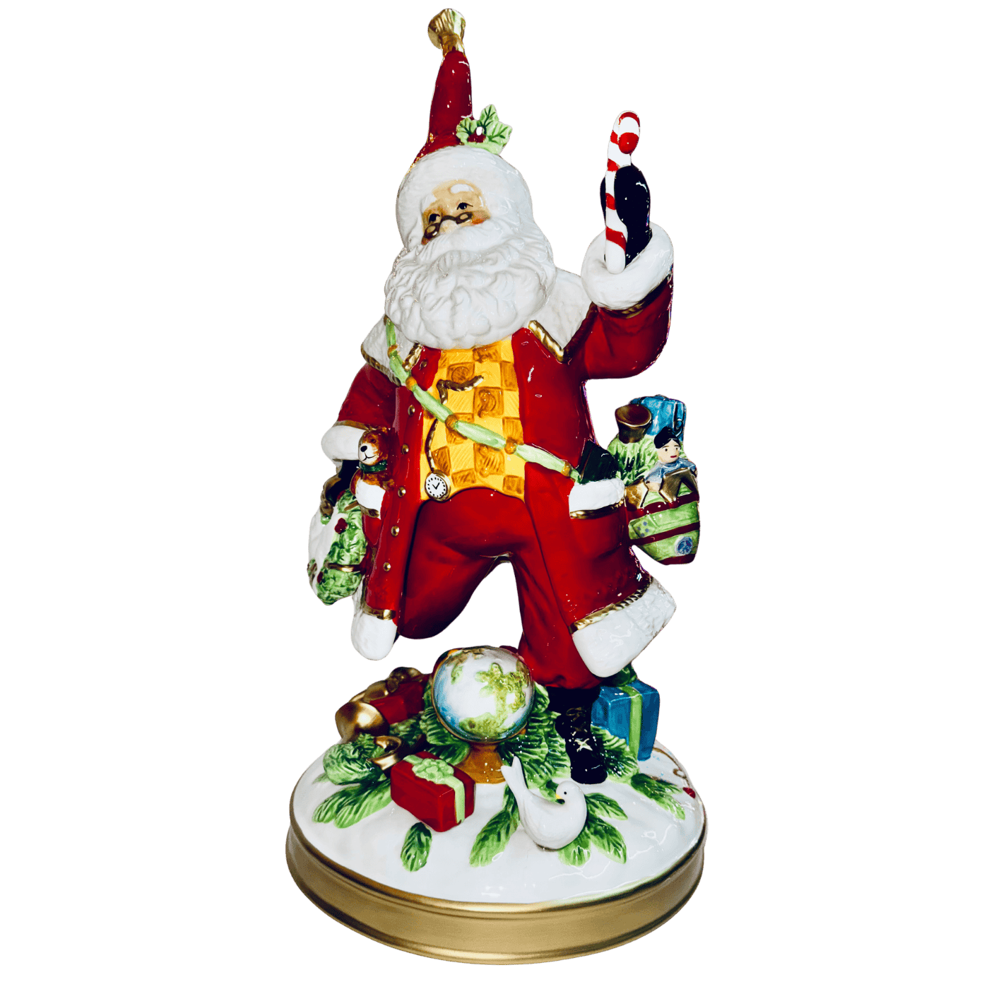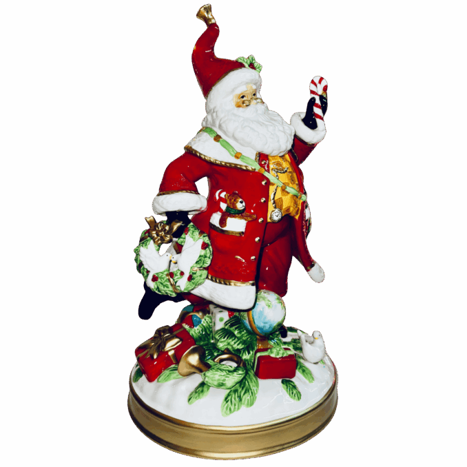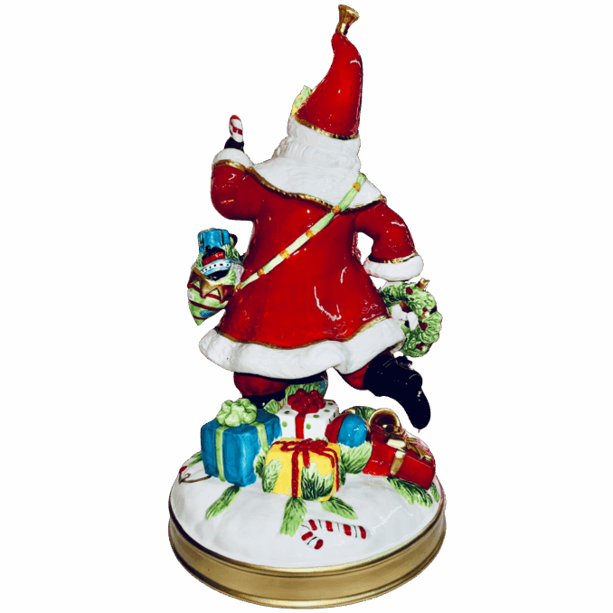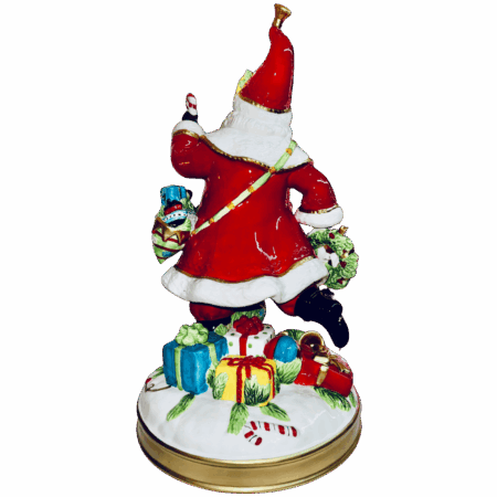 Vivace e scenografica, questa figura di Babbo Natale in porcellana è realizzata con grande cura artigianale e rappresenta il tradizionale portatore di doni in una posa dinamica che trasmette movimento e allegria.